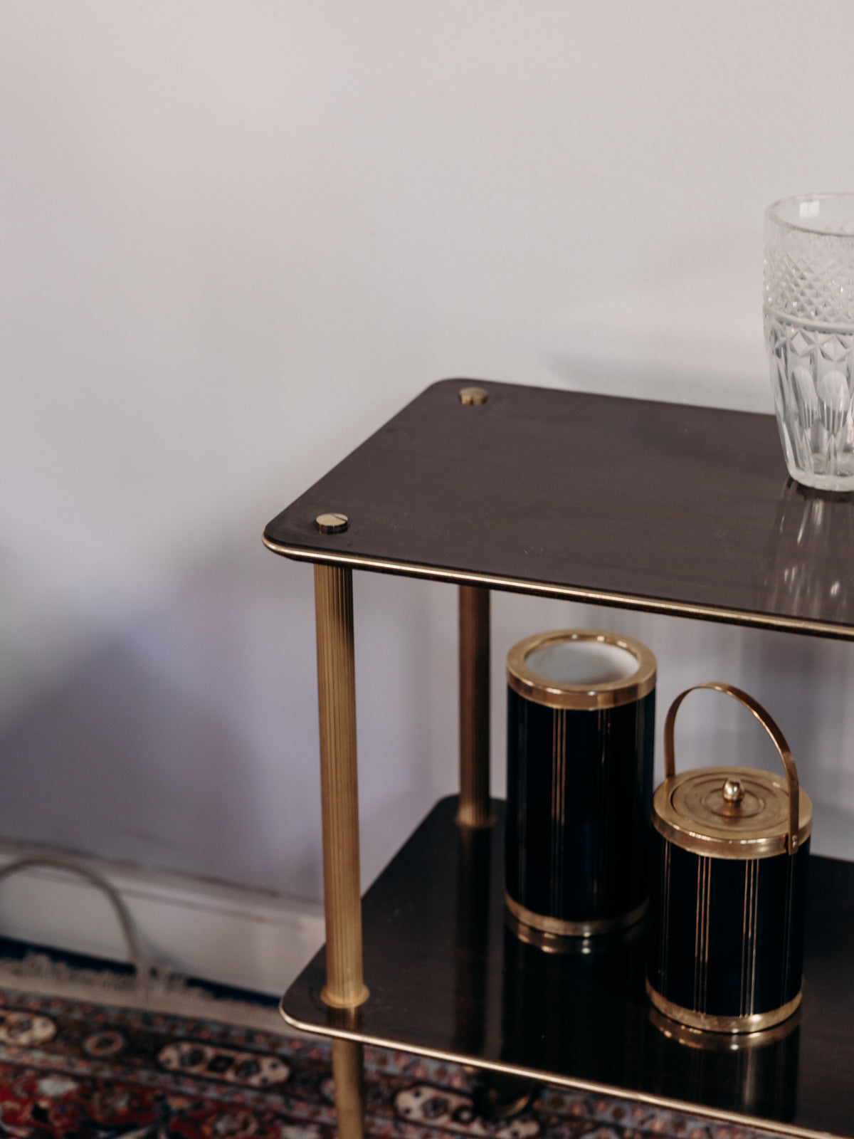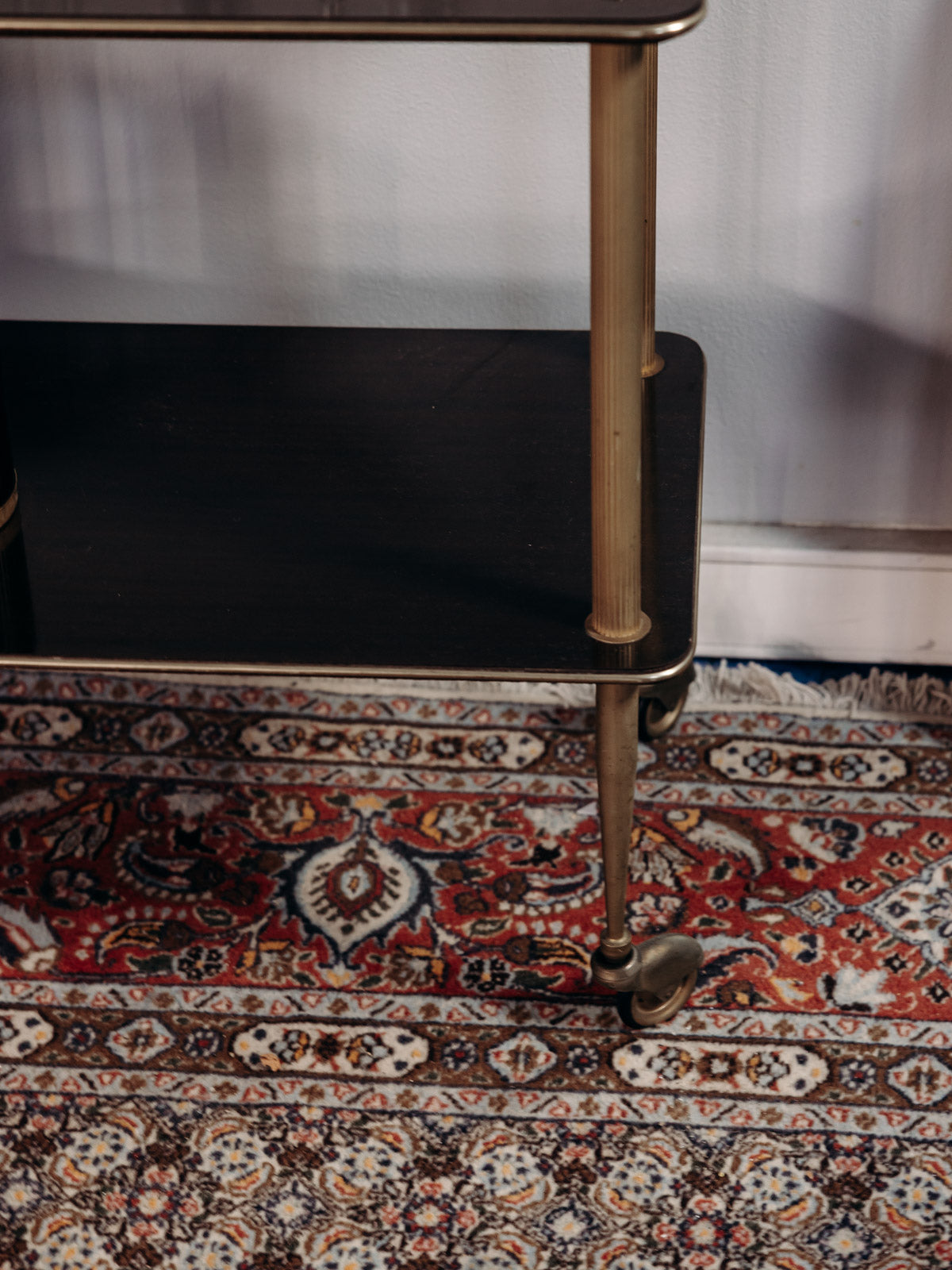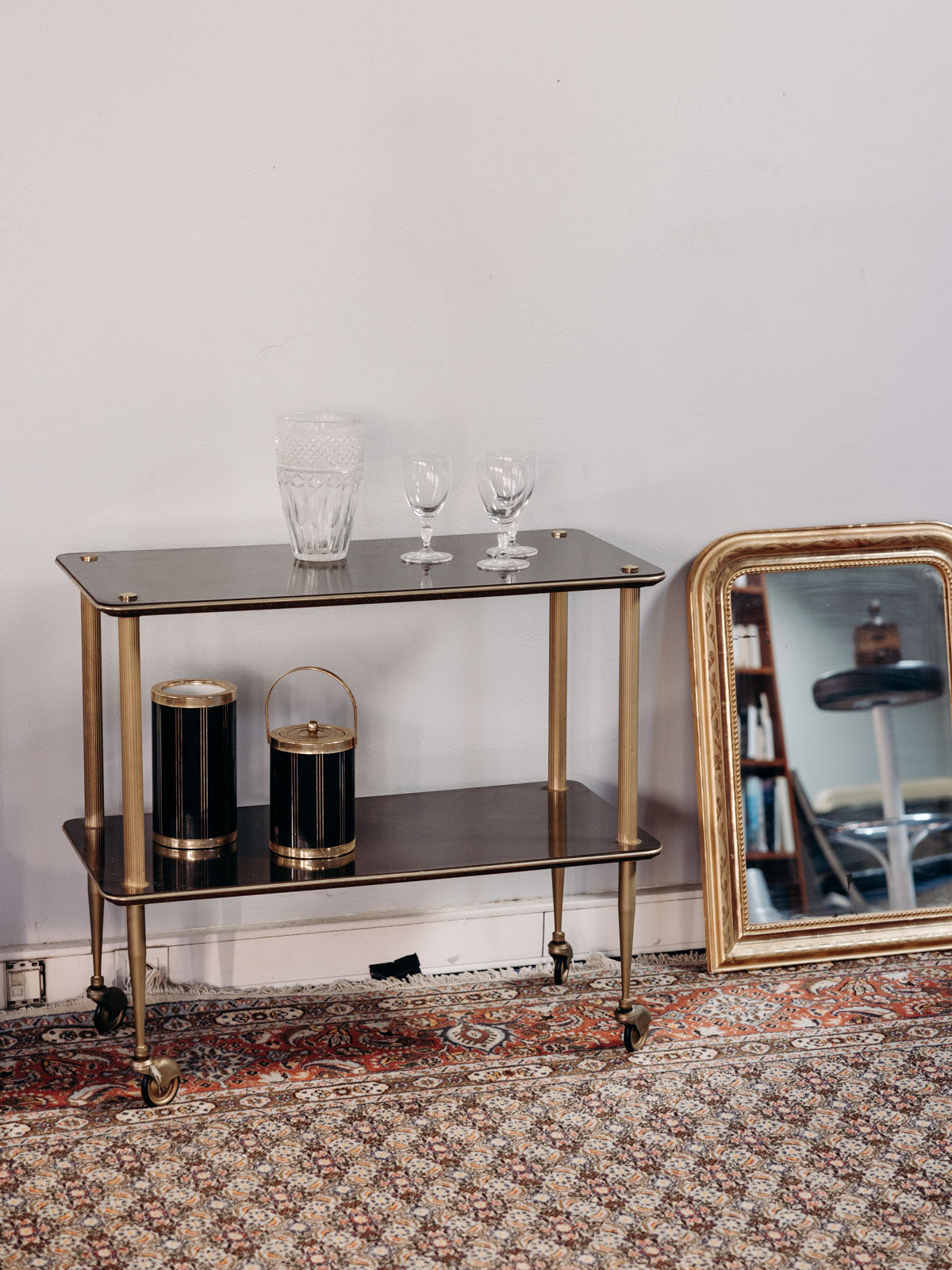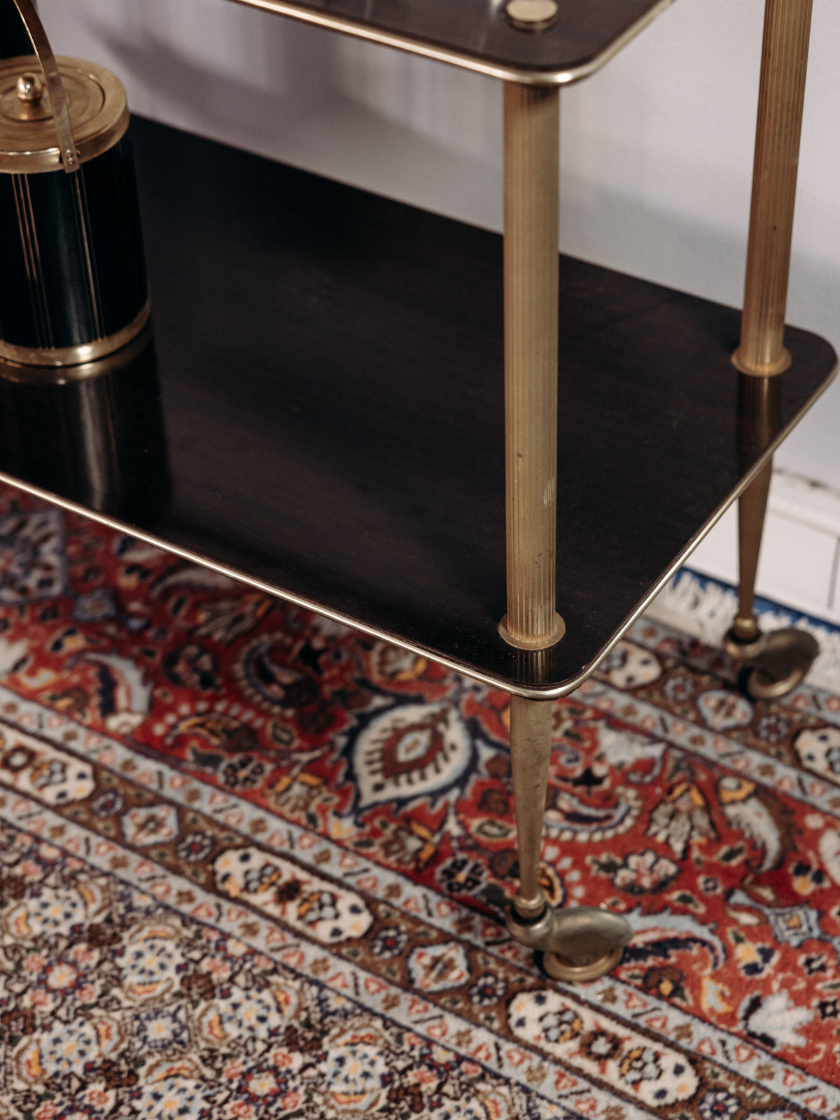 Apportez une touche rétro avec cette desserte en formica marron et laiton, au design double plateau et aux petites roulettes discrètes. Son format étroit et sa hauteur confortable offrent un gain d'espace pratique, tandis que l'espace entre les plateaux accueille bouteilles, verrerie ou accessoires de service. Le léger contraste des matériaux, entre le formica chaud et le laiton, apporte une élégance sobre, parfaite pour une cuisine, un coin bar ou un salon. Mobile et fonctionnelle, elle sait se rendre indispensable.