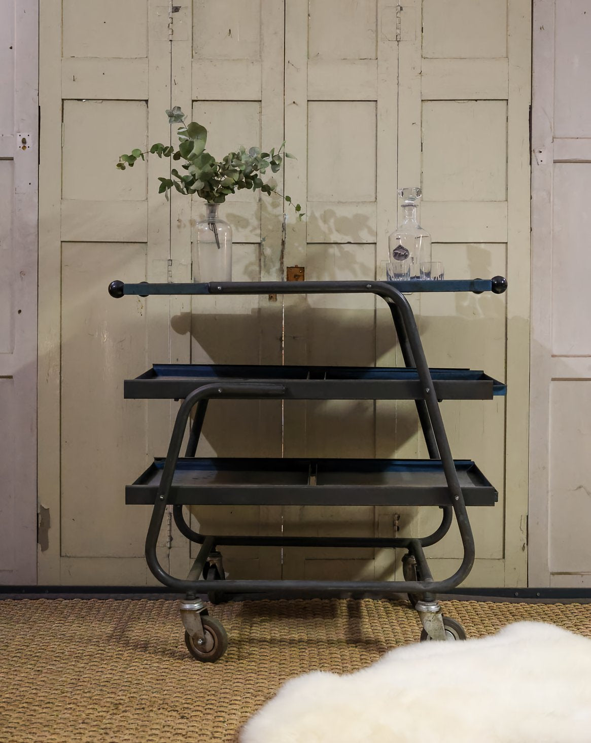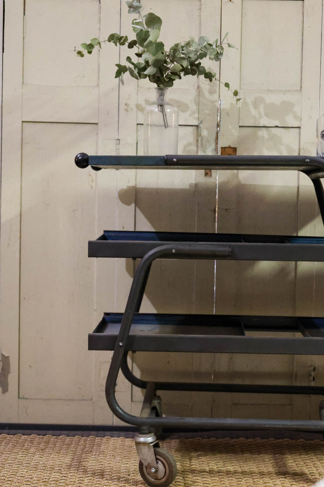 Invitez cette desserte d'atelier sur roulettes métallique, où la structure dialogue avec des plateaux bleus patinés au charme discret. Ses trois plateaux amovibles, qui s'ouvrent de part et d'autre, offrent un rangement modulable et une accessibilité parfaite pour cuisine, atelier ou salon. Mobile et stable, elle se glisse facilement pour servir de comptoir d'appoint ou desserte de service. Sa patine raconte l'usage et apporte une touche industrielle chaleureuse.
