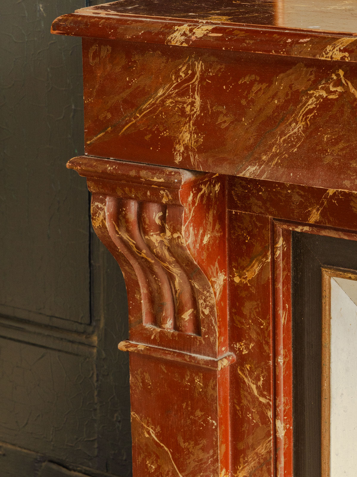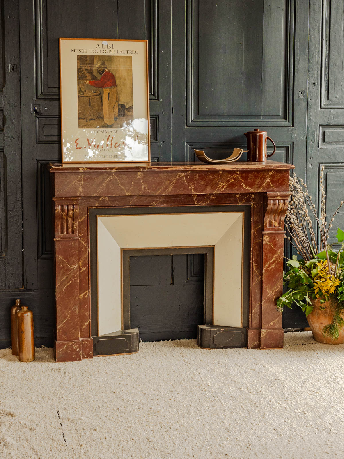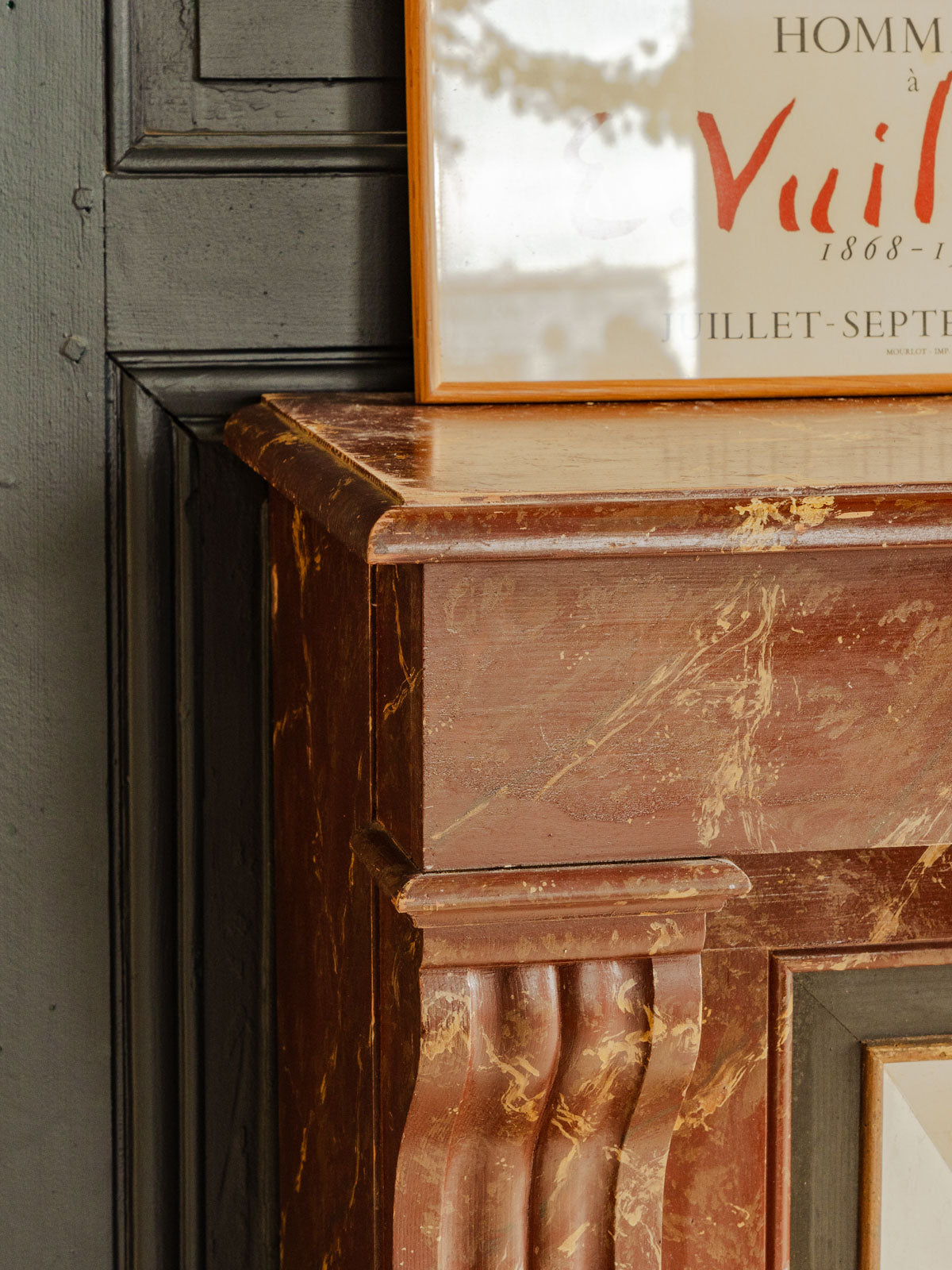 Sublimez votre intérieur avec ce manteau de cheminée ancien en bois, habillé d'un bordeaux à l'effet marbré qui apporte une élégance sobre et singulière. Ses proportions habillent une pièce tout en restant pratique pour disposer bougies et objets décoratifs, et sa patine confère une atmosphère chaleureuse et raffinée. Pièce rare au style affirmé, il structure l'espace avec caractère. Légères traces du temps présentes.