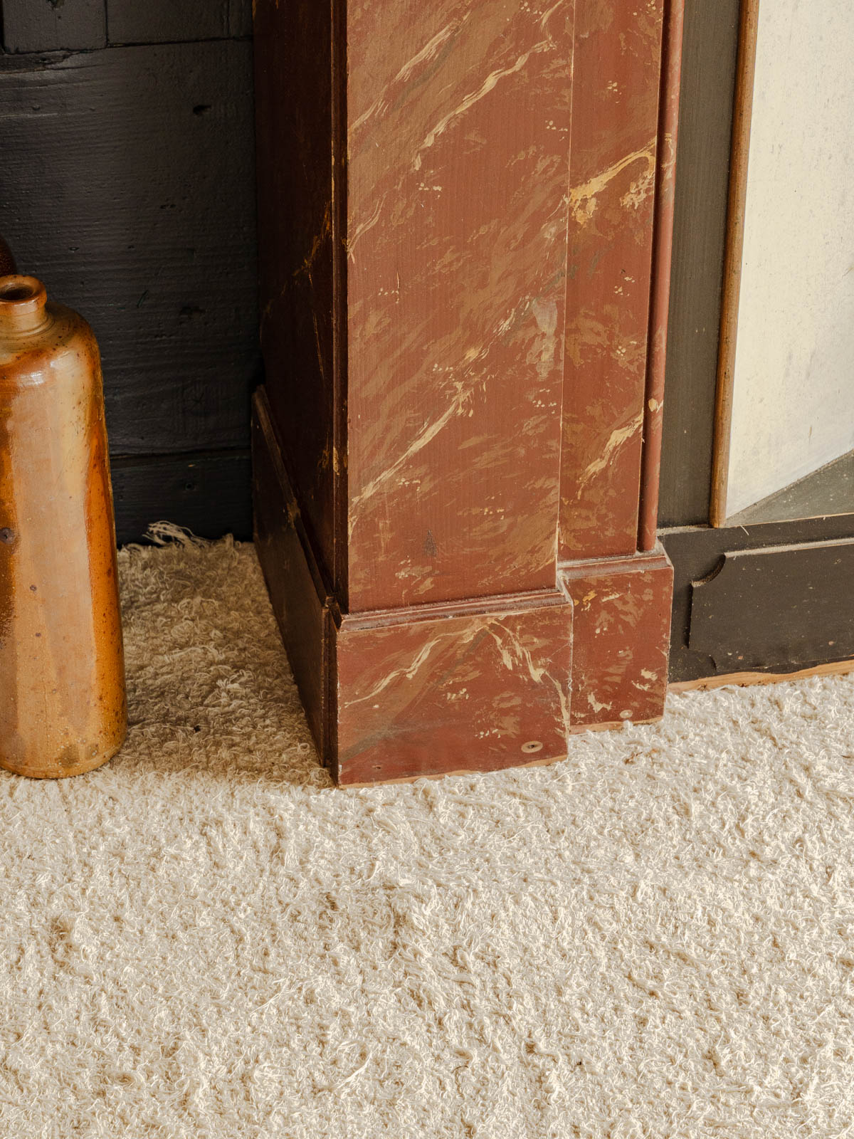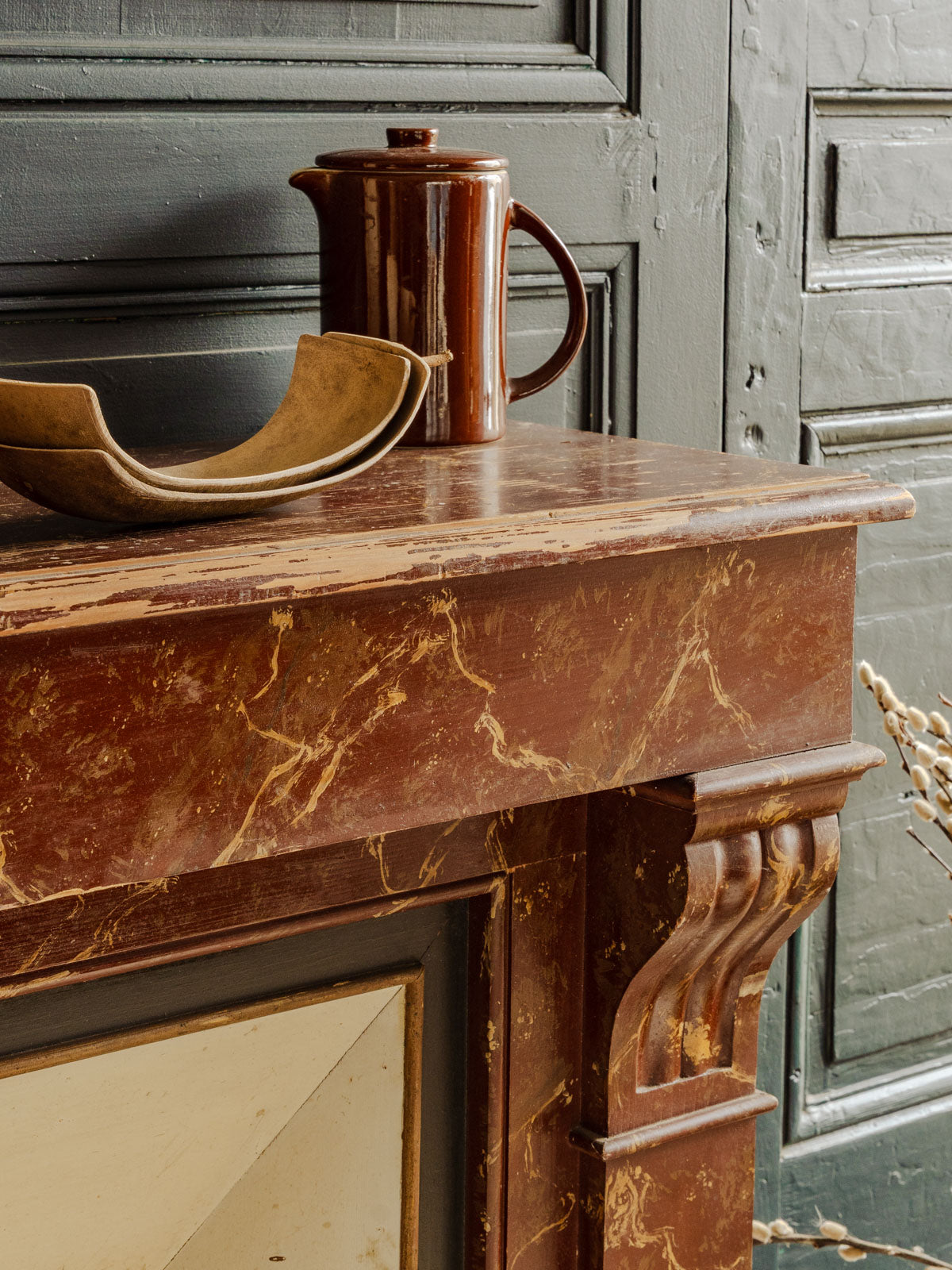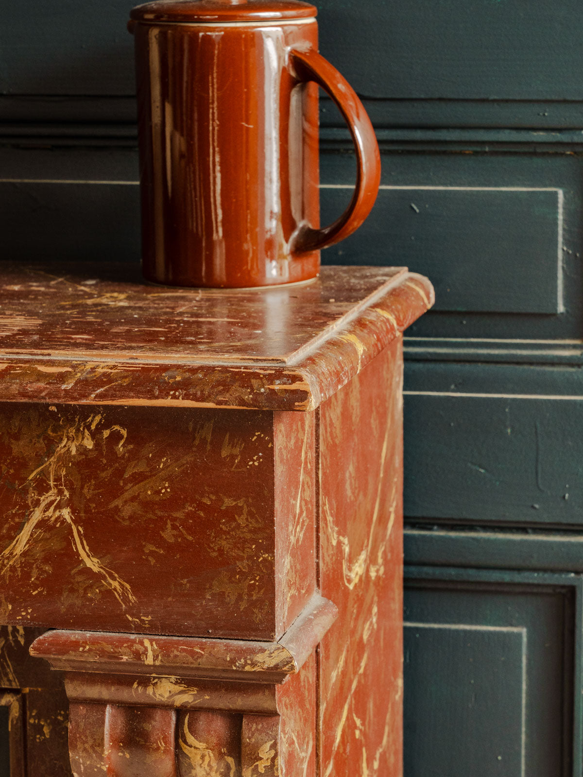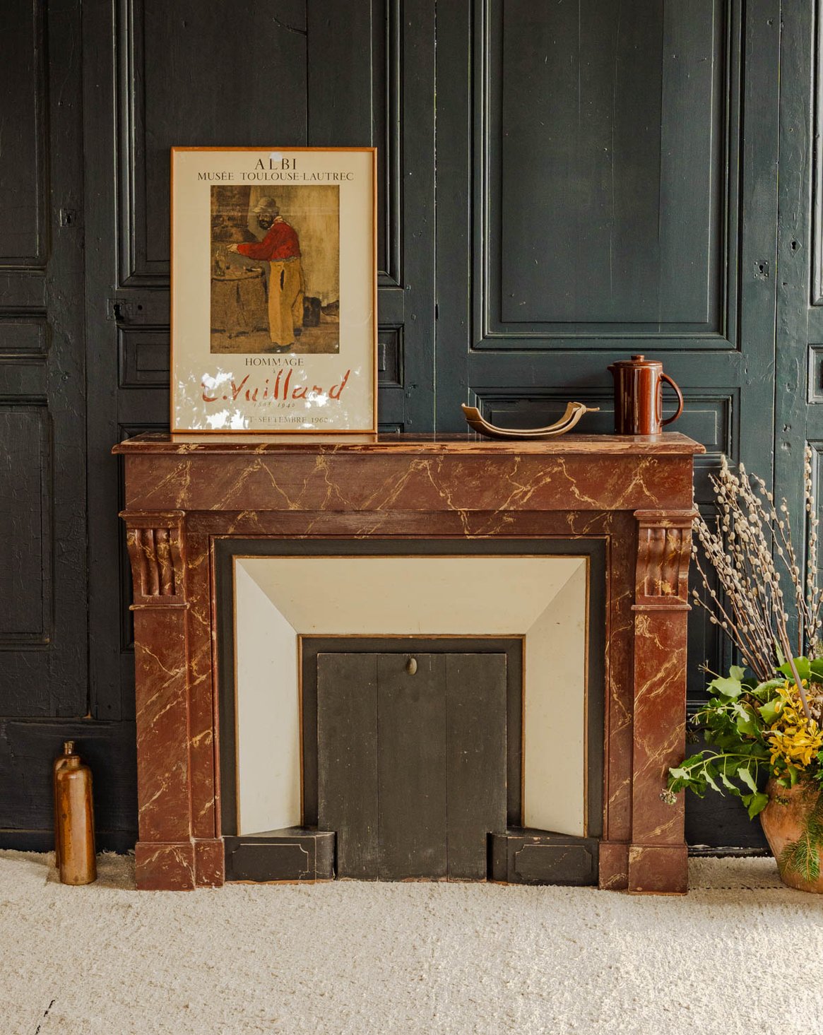 Sublimez votre intérieur avec ce manteau de cheminée ancien en bois, habillé d'un bordeaux à l'effet marbré qui apporte une élégance sobre et singulière. Ses proportions habillent une pièce tout en restant pratique pour disposer bougies et objets décoratifs, et sa patine confère une atmosphère chaleureuse et raffinée. Pièce rare au style affirmé, il structure l'espace avec caractère. Légères traces du temps présentes.