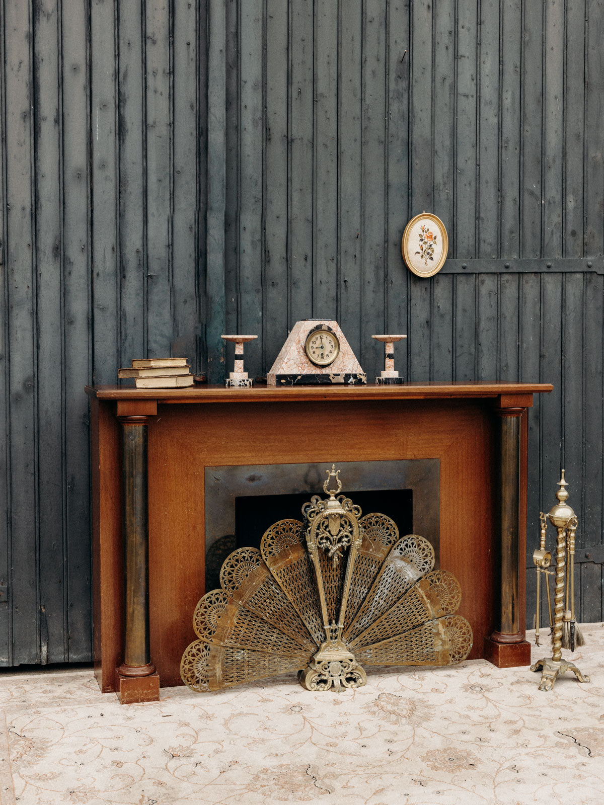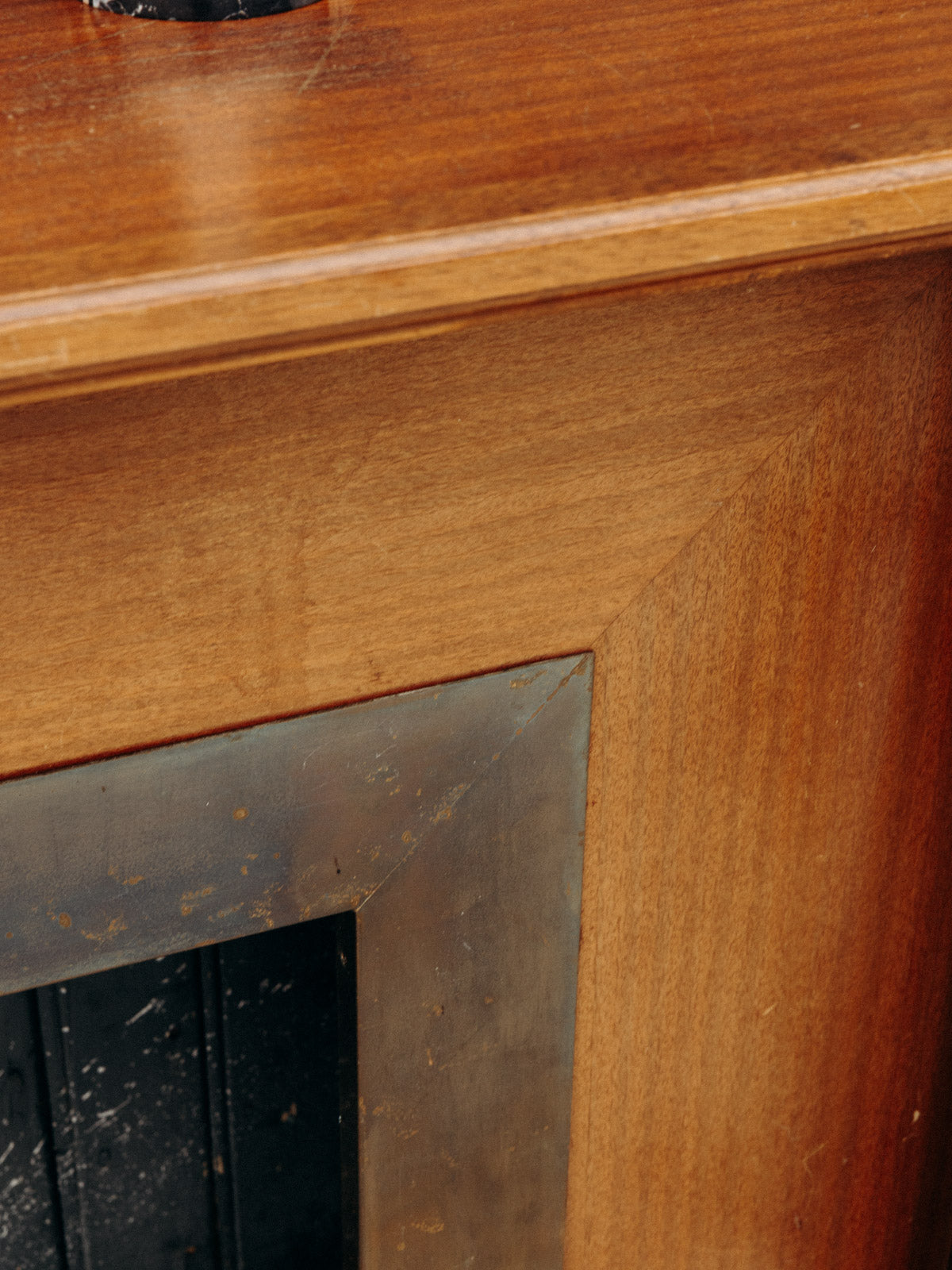 Apportez une touche d'élégance à votre intérieur avec ce magnifique manteau de cheminée en bois plaqué et laiton. Son design raffiné et ses finitions soignées en font un élément central idéal pour toute pièce. Bien que quelques marques du temps et des rayures soient présentes sur le dessus, elles ajoutent un charme authentique à ce meuble vintage, racontant une histoire tout en préservant son caractère élégant. Transformez votre espace en un lieu chaleureux et accueillant grâce à ce superbe manteau.