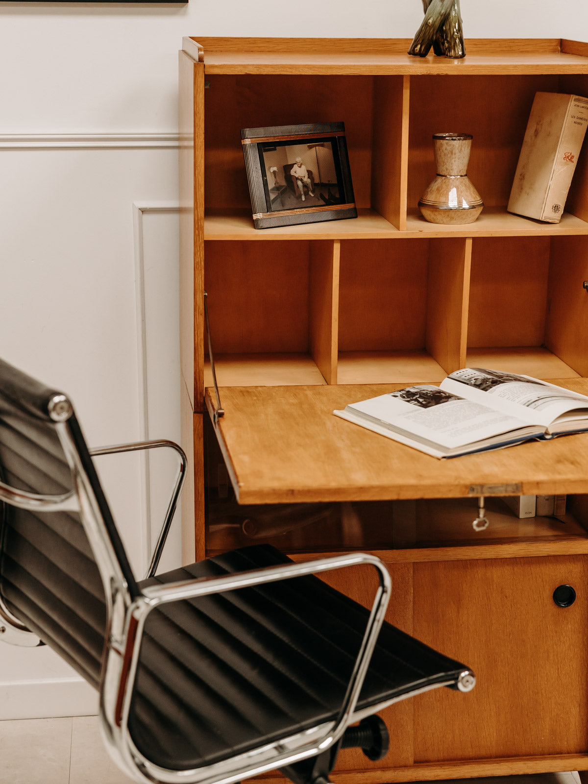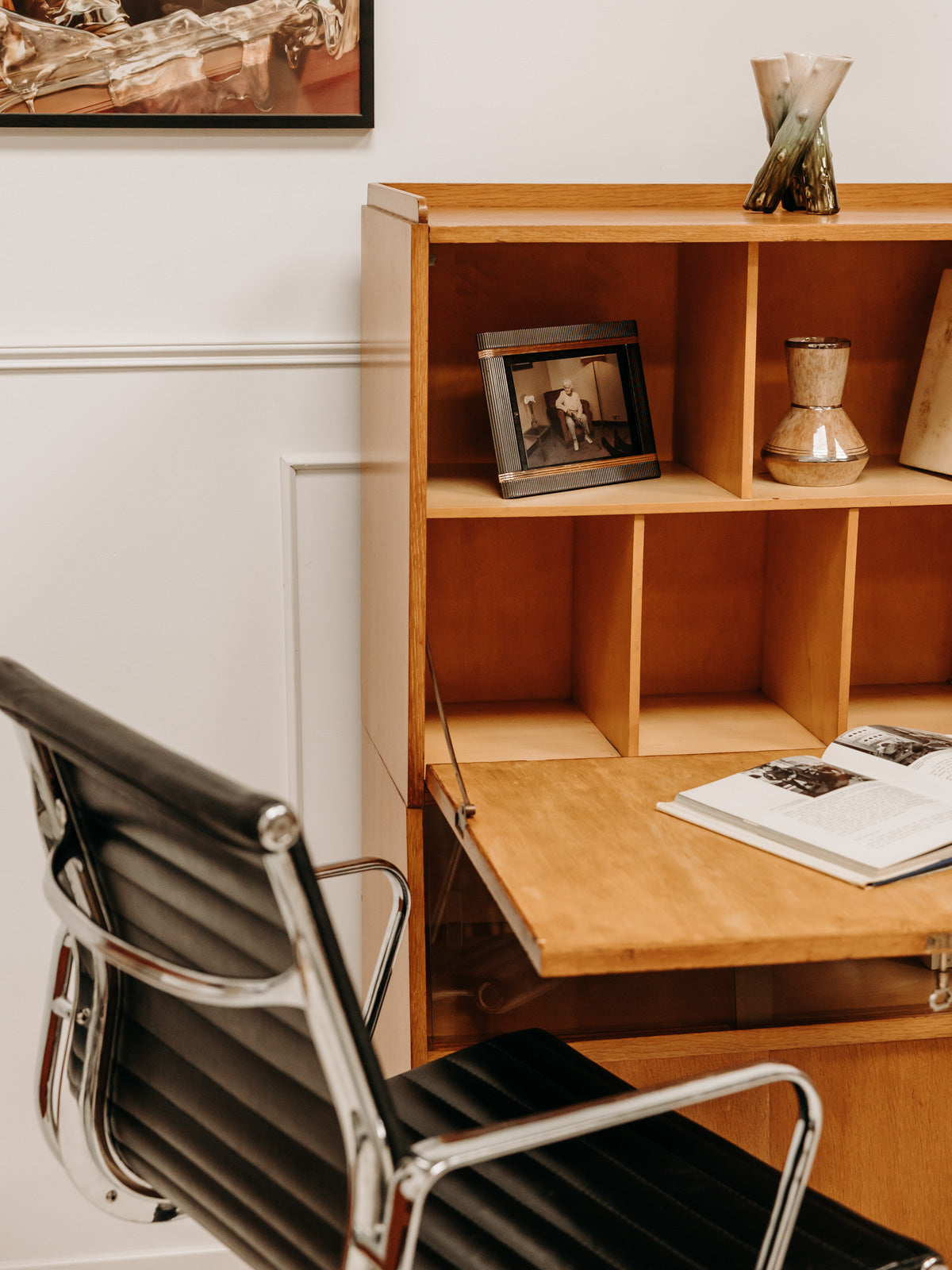 Adoptez ce secrétaire en bois clair, au charme sobre et aux lignes bien proportionnées. Son abattant fermé par une petite clé s'ouvre sur plusieurs compartiments pensés pour l'organisation, tandis que le placard bas en bois aux poignées rondes noires offre un rangement discret et robuste et une niche vitrée basse met en valeur livres ou objets choisis. Compact et élégant, il s'intègre aussi bien dans un coin bureau que dans une entrée pour créer une atmosphère chaleureuse.