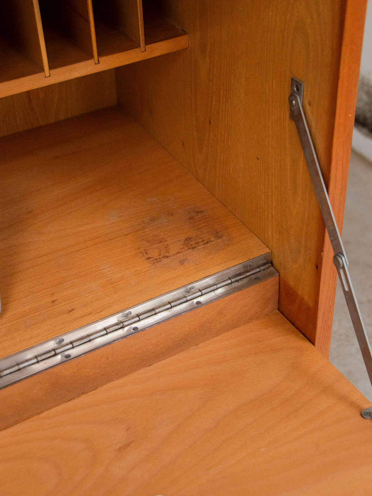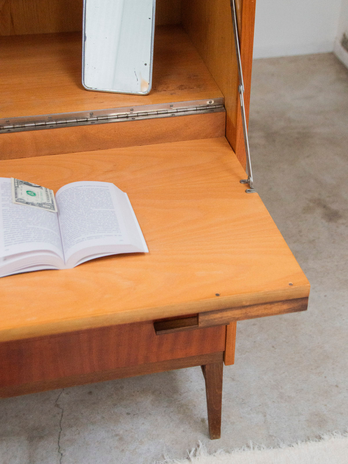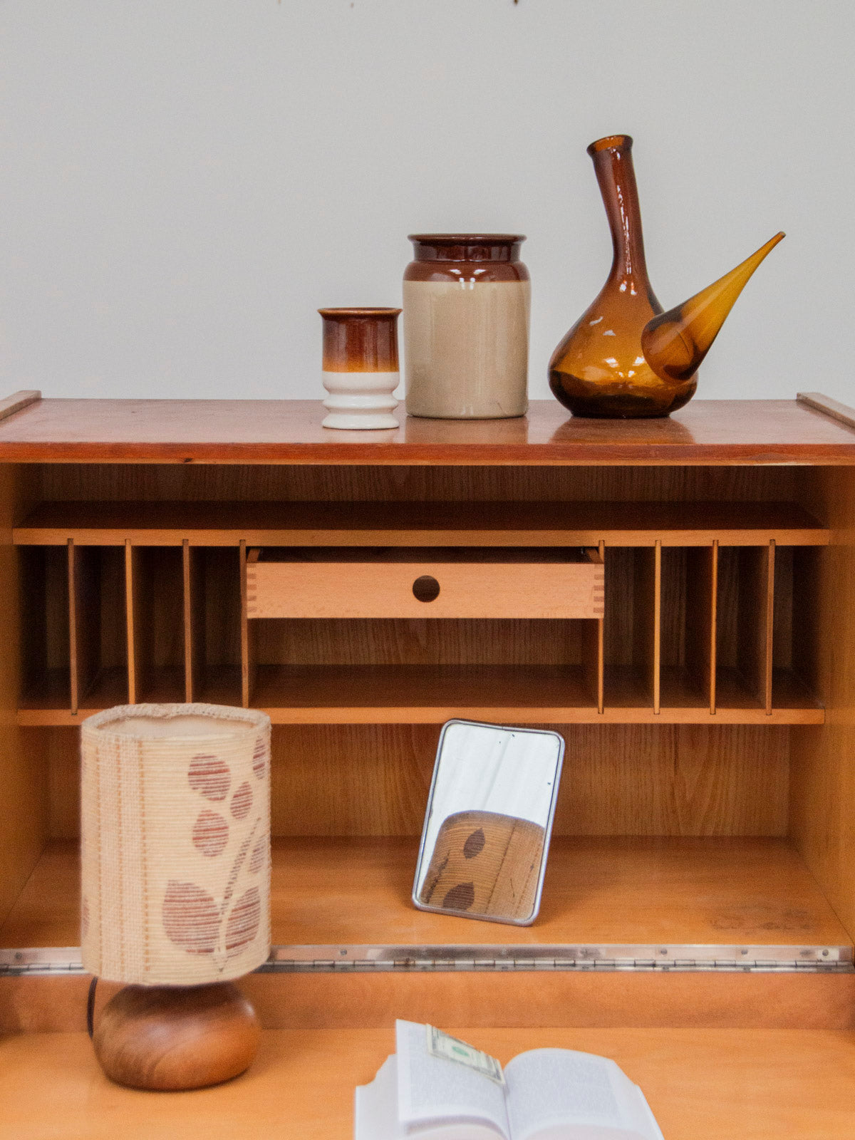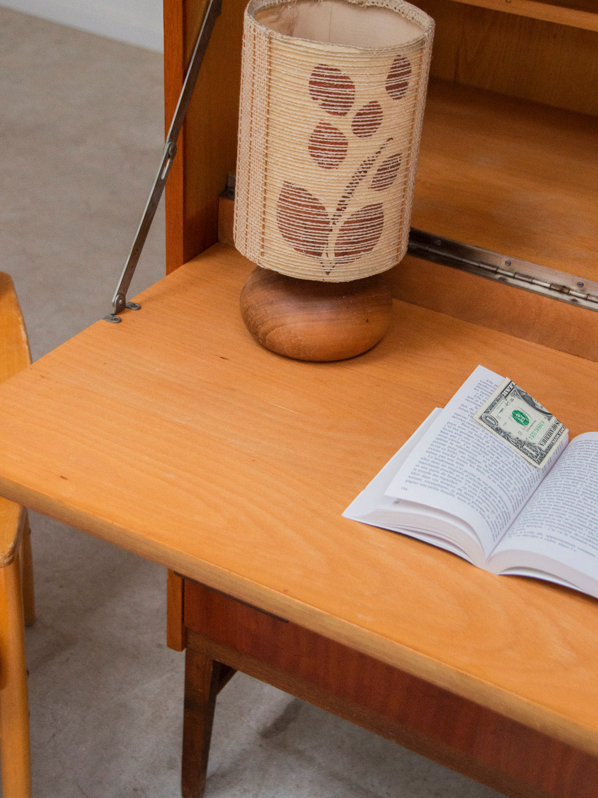 Adoptez ce grand secrétaire en bois aux tonalités foncées et claires, un équilibre de caractère et de douceur qui réchauffe un bureau ou une entrée. Sa silhouette verticale, pensée pour optimiser l'espace, propose trois tiroirs bas pour le rangement quotidien et une case haute à l'intérieur en bois plus clair qui mettra en valeur votre papeterie ou vos objets préférés. Les poignées en bois renforcent l'aspect artisanal tandis que le contraste des essences crée une ambiance sobre et raffinée. Quelques autocollants visibles.