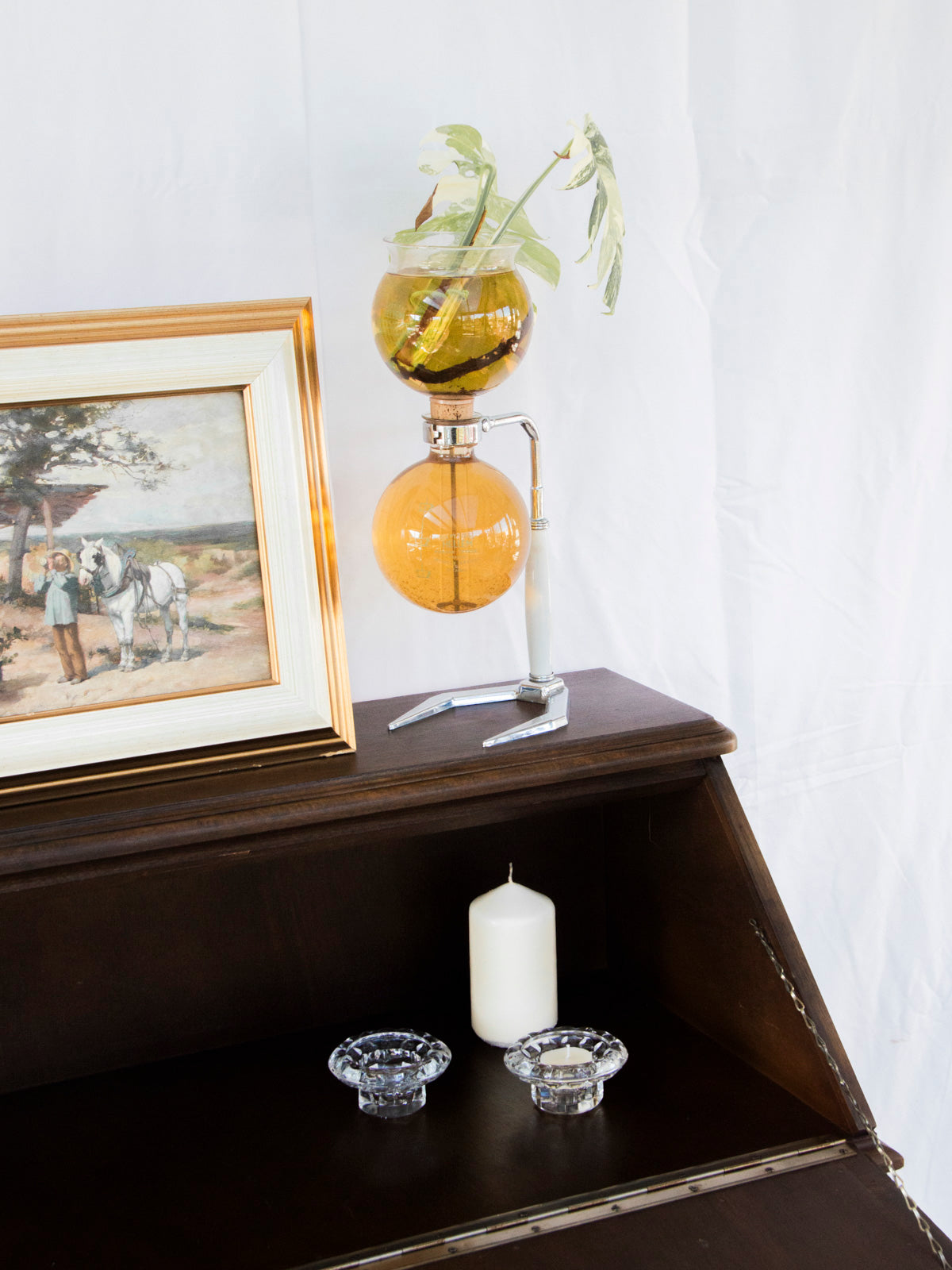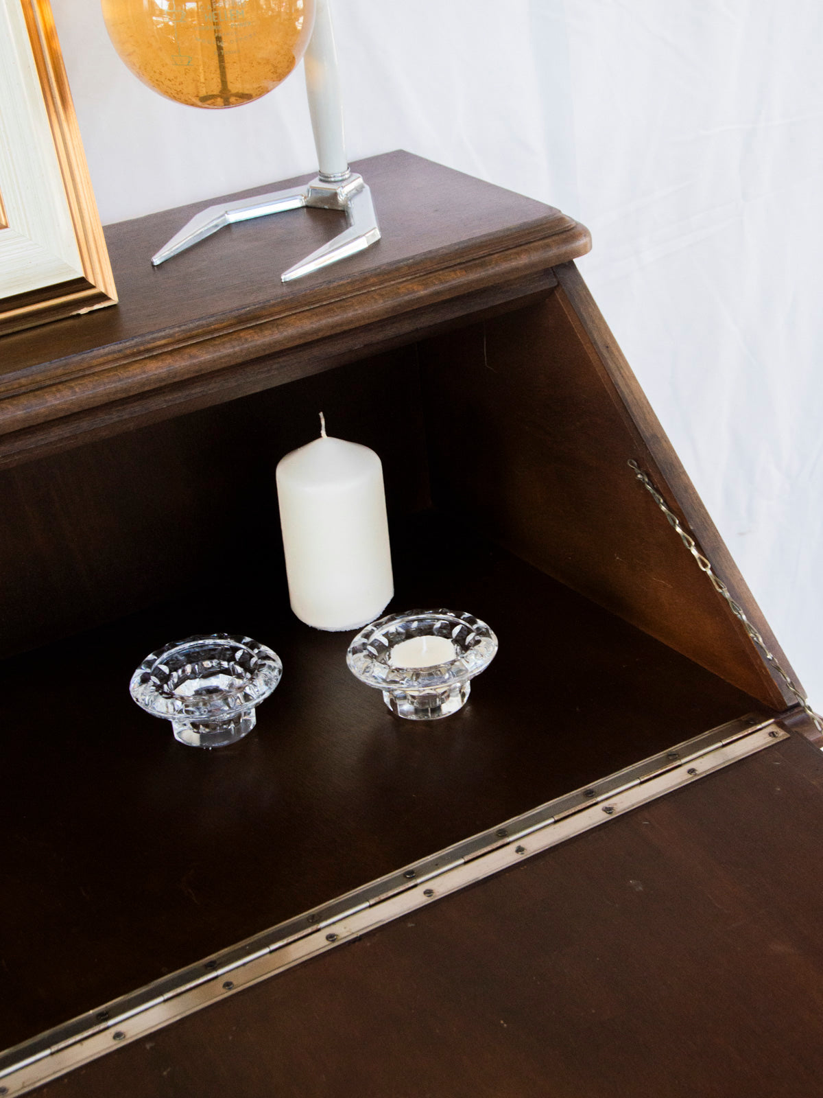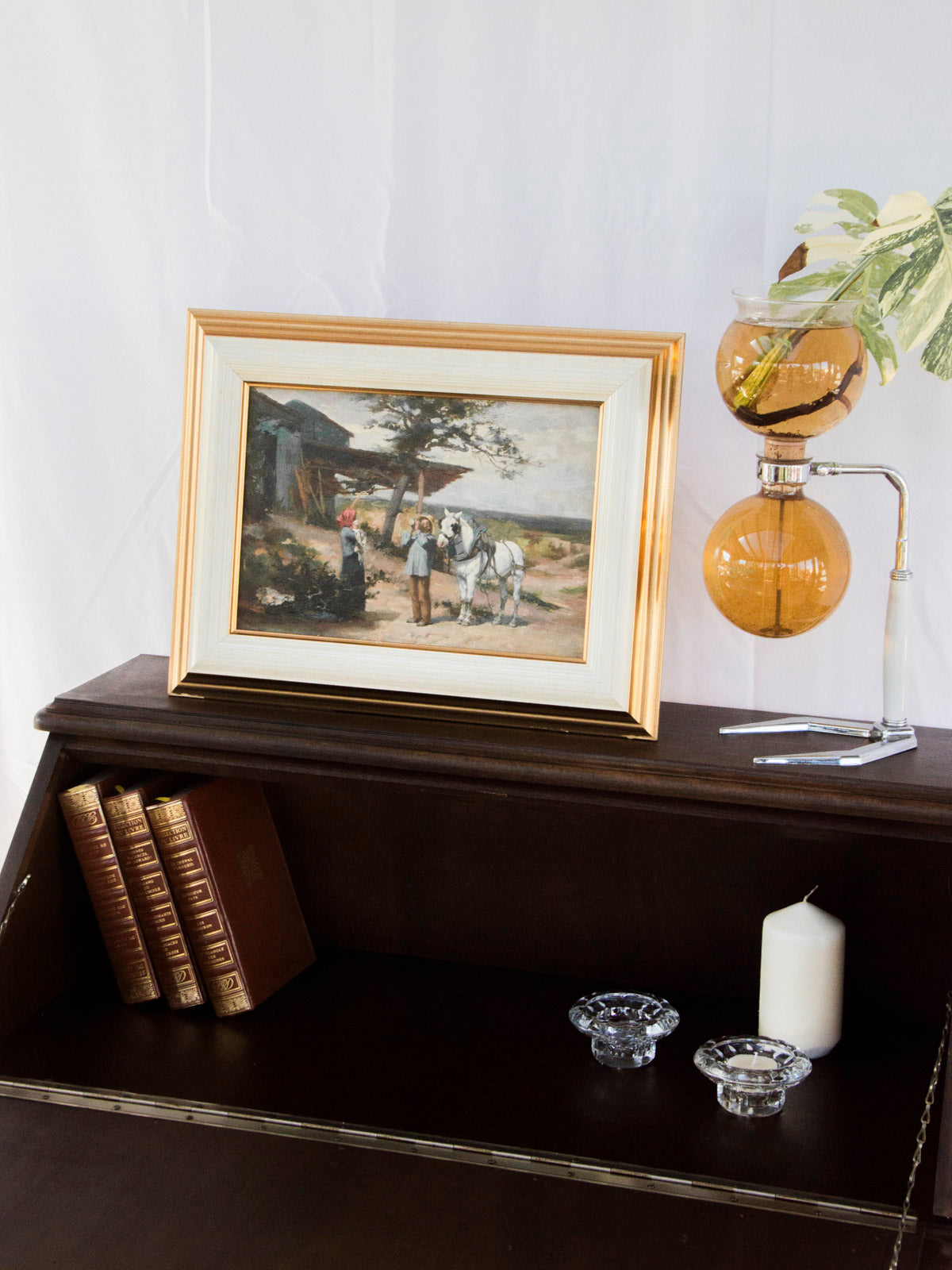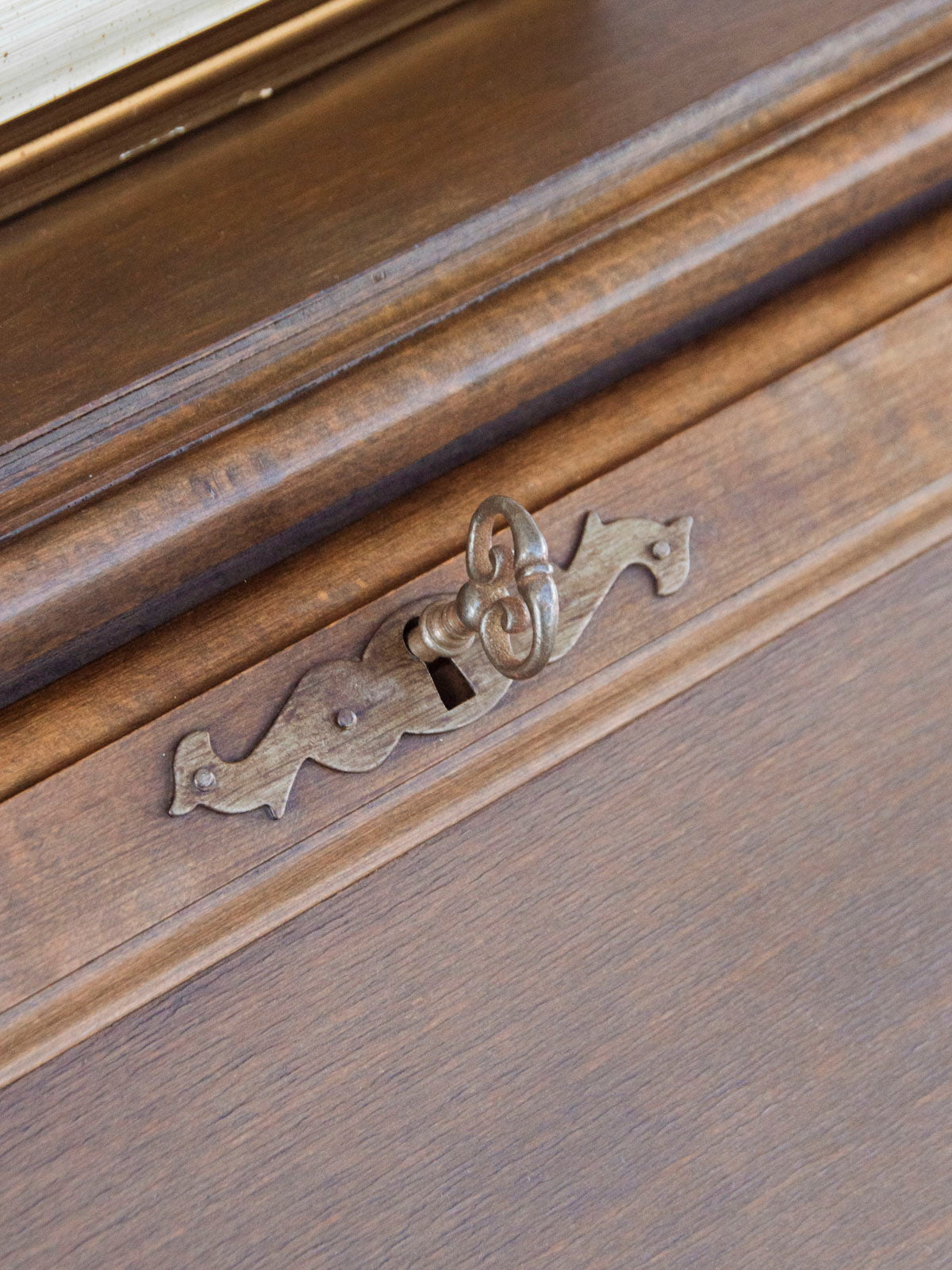 Adoptez ce secrétaire en bois foncé au charme sobre et classique, dont la silhouette élancée et le format compact s'intègrent facilement aux espaces restreints. L'abattant dévoile un petit bureau fonctionnel tandis que deux tiroirs et une clé offrent rangement sécurisé pour vos papiers et fournitures, idéal pour le travail quotidien ou la correspondance. La matière chaleureuse et la teinte profonde instaurent une atmosphère feutrée et élégante, parfaite pour un coin bureau ou une entrée accueillante, légères traces du temps.