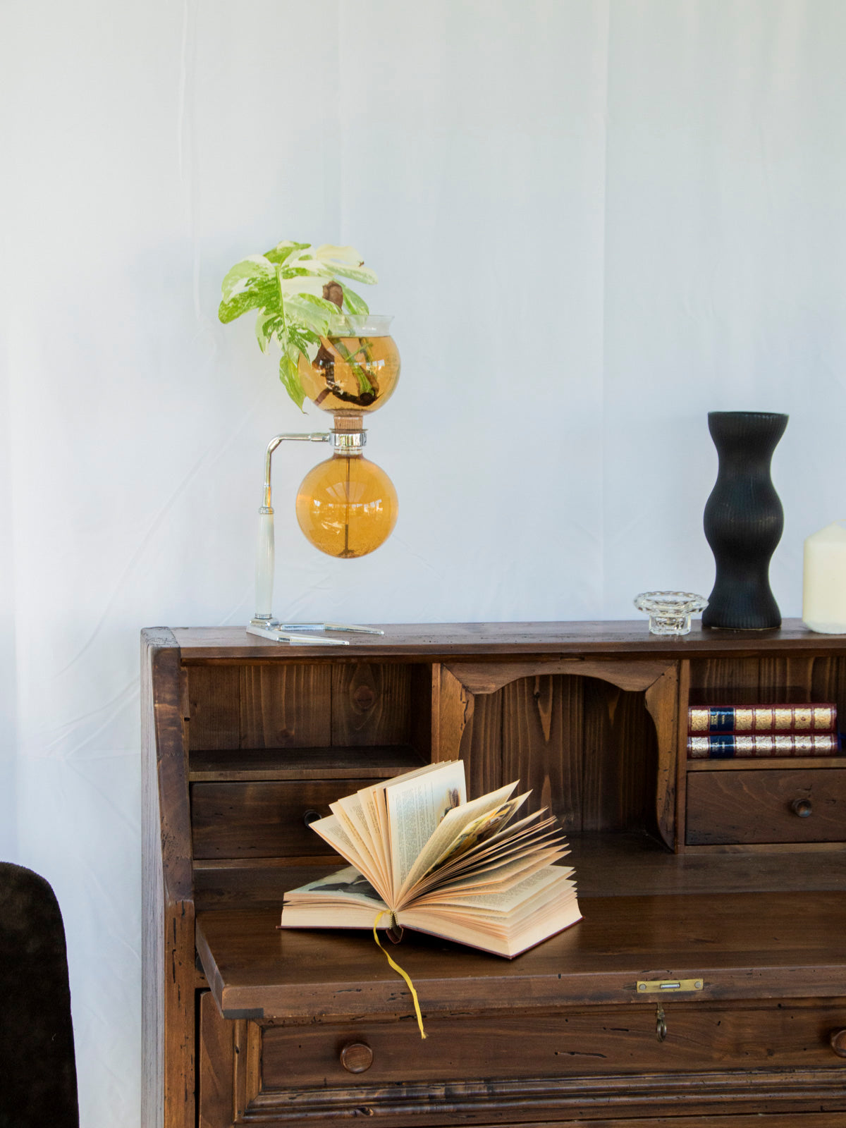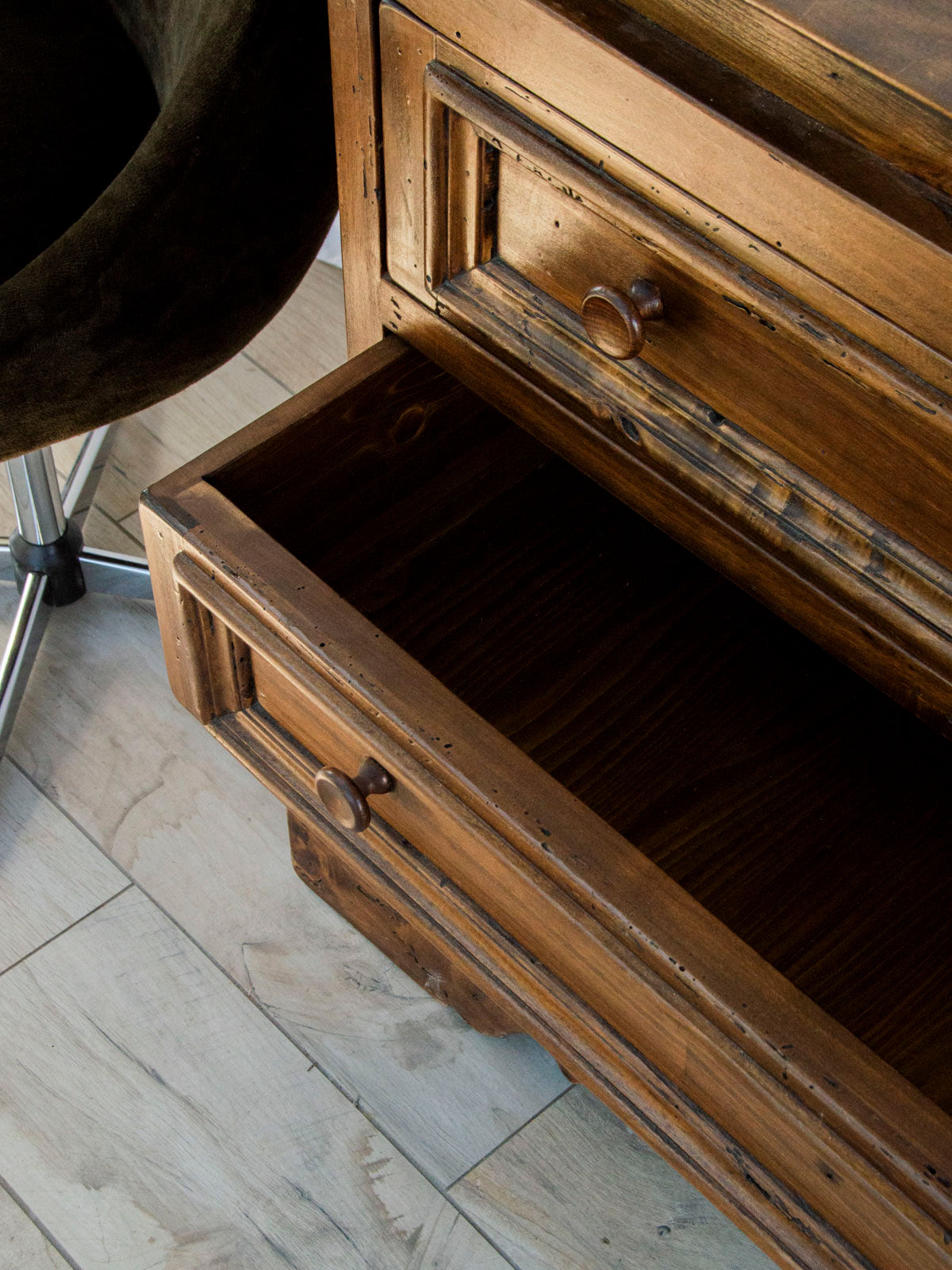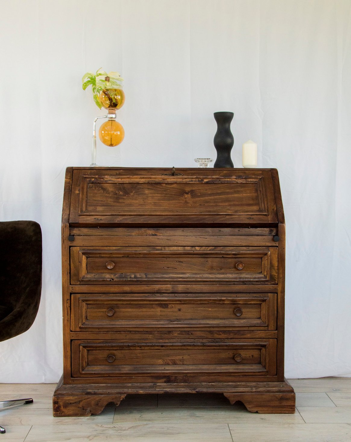 Découvrez ce secrétaire en bois massif et boutons en métal, au charme sobre et contemporain. Il propose un plateau secrétaire ouvrant sur un intérieur organisé avec trois niches et deux tiroirs, pouvant se fermer à clé pour sécuriser vos papiers. Les boutons de support sont neufs et peints en noir, apportant un contraste soigné et une touche graphique. Ses proportions compactes offrent un rangement fonctionnel et créent une ambiance atelier élégante dans un bureau ou une entrée.