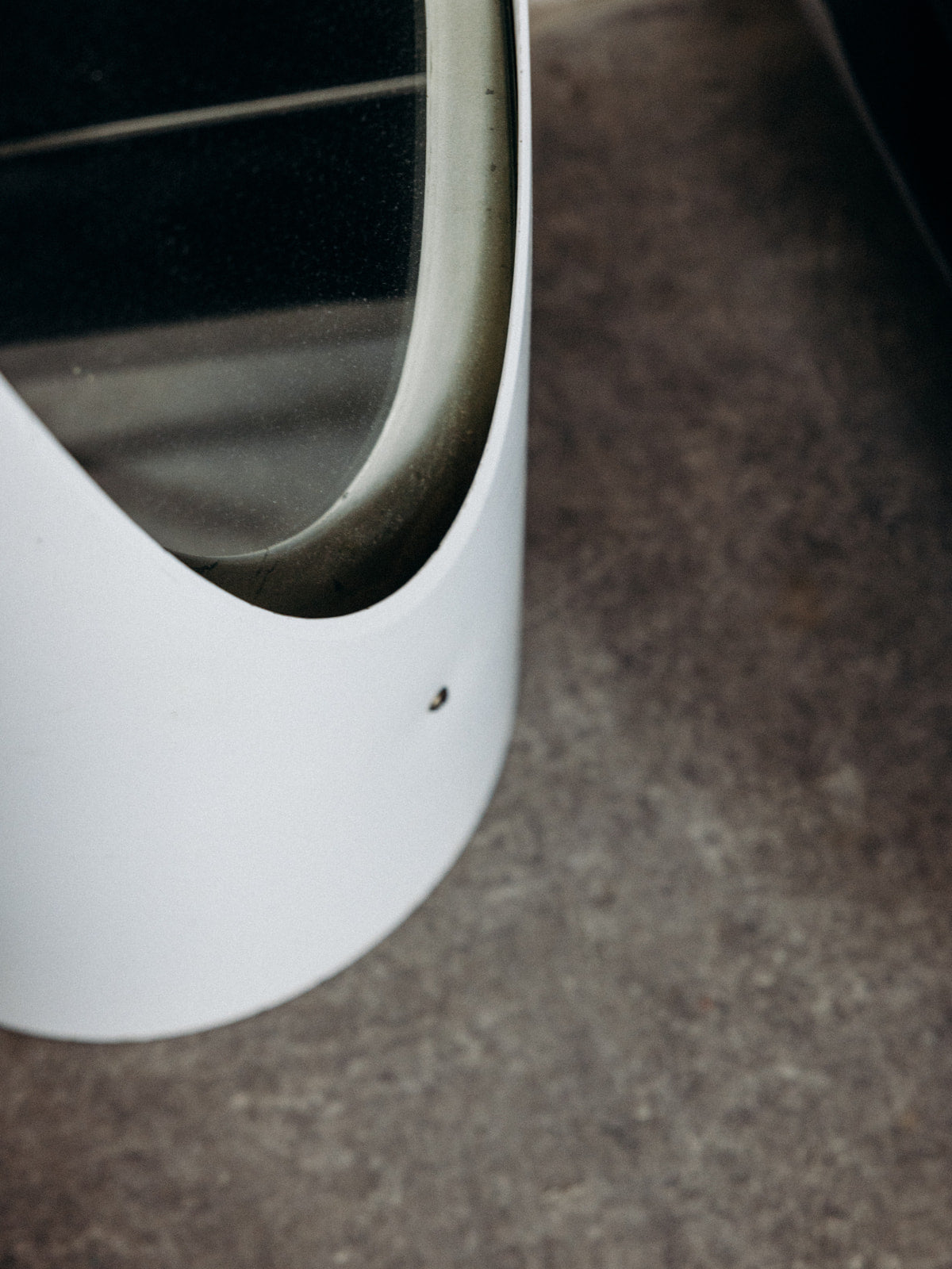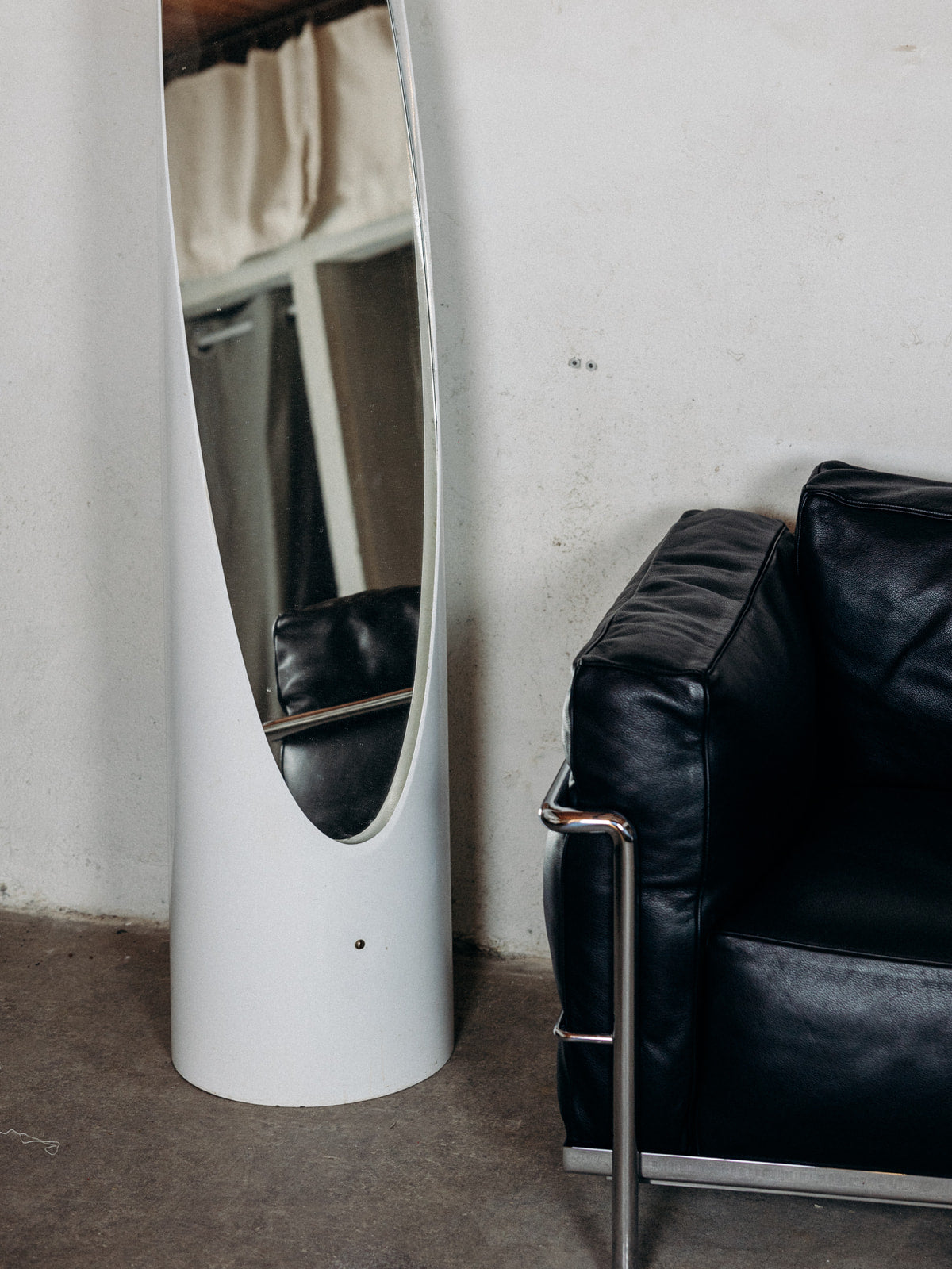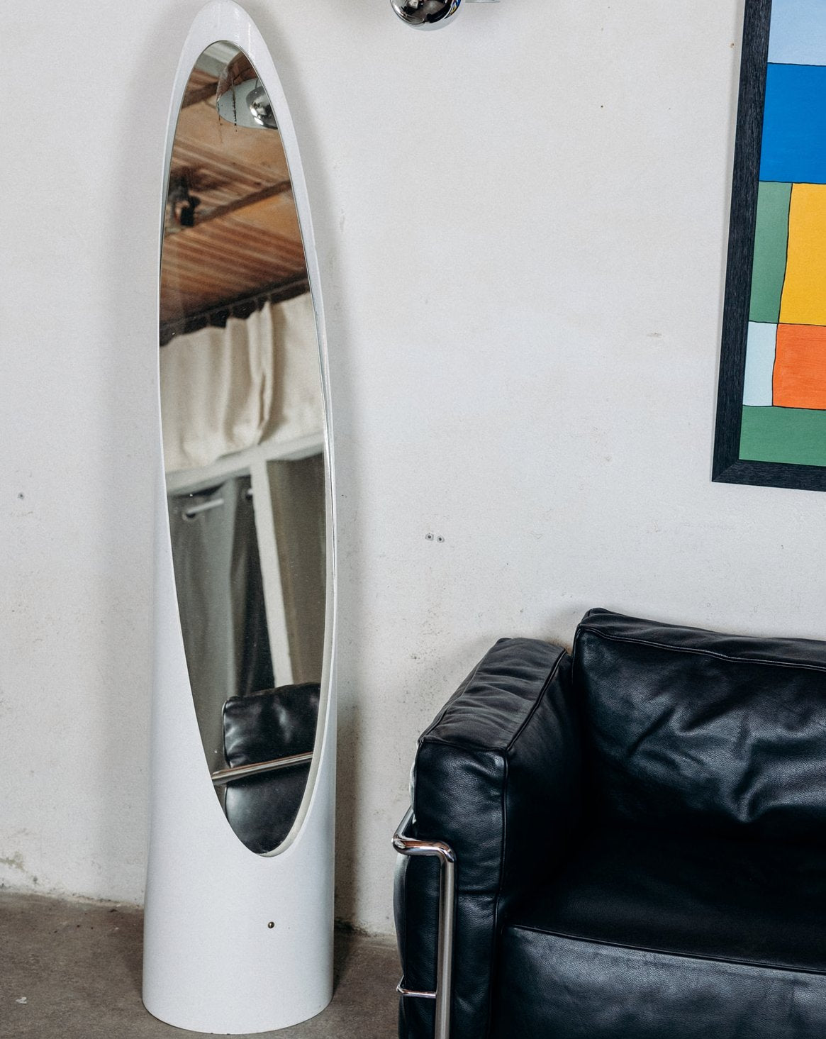 Découvrez ce miroir Lipstick blanc conçu par Roger Lecal pour Charbrières dans les années 1970. Cet élégant miroir, bien que marqué par quelques piqûres et un léger dommage en haut, conserve un charme vintage indéniable. À noter que le socle n'est pas présent, offrant ainsi une belle opportunité de personnalisation. Un véritable objet de décoration pour les amoureux du design rétro.