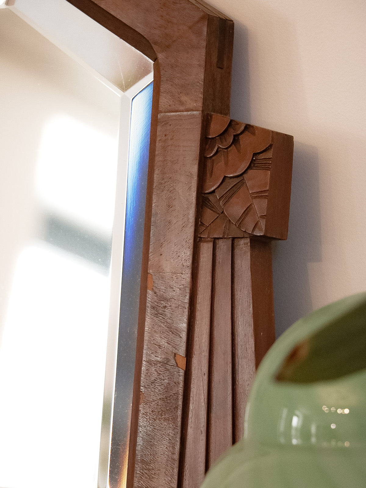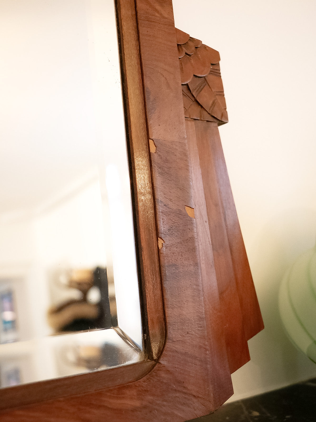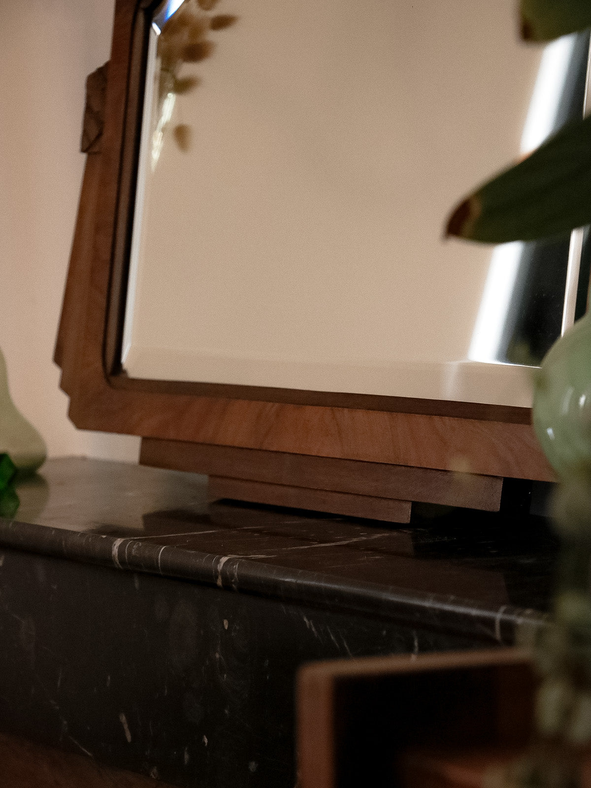 Découvrez ce miroir biseauté Art déco en bois massif et plaquage. Les lignes géométriques donnent du style au miroir, tandis que le biseau du verre capte la lumière et crée une belle profondeur. Sa proportion étroite et horizontale en fait un accessoire à la fois décoratif et fonctionnel, apportant une ambiance chaleureuse et raffinée à l'entrée ou à la chambre.