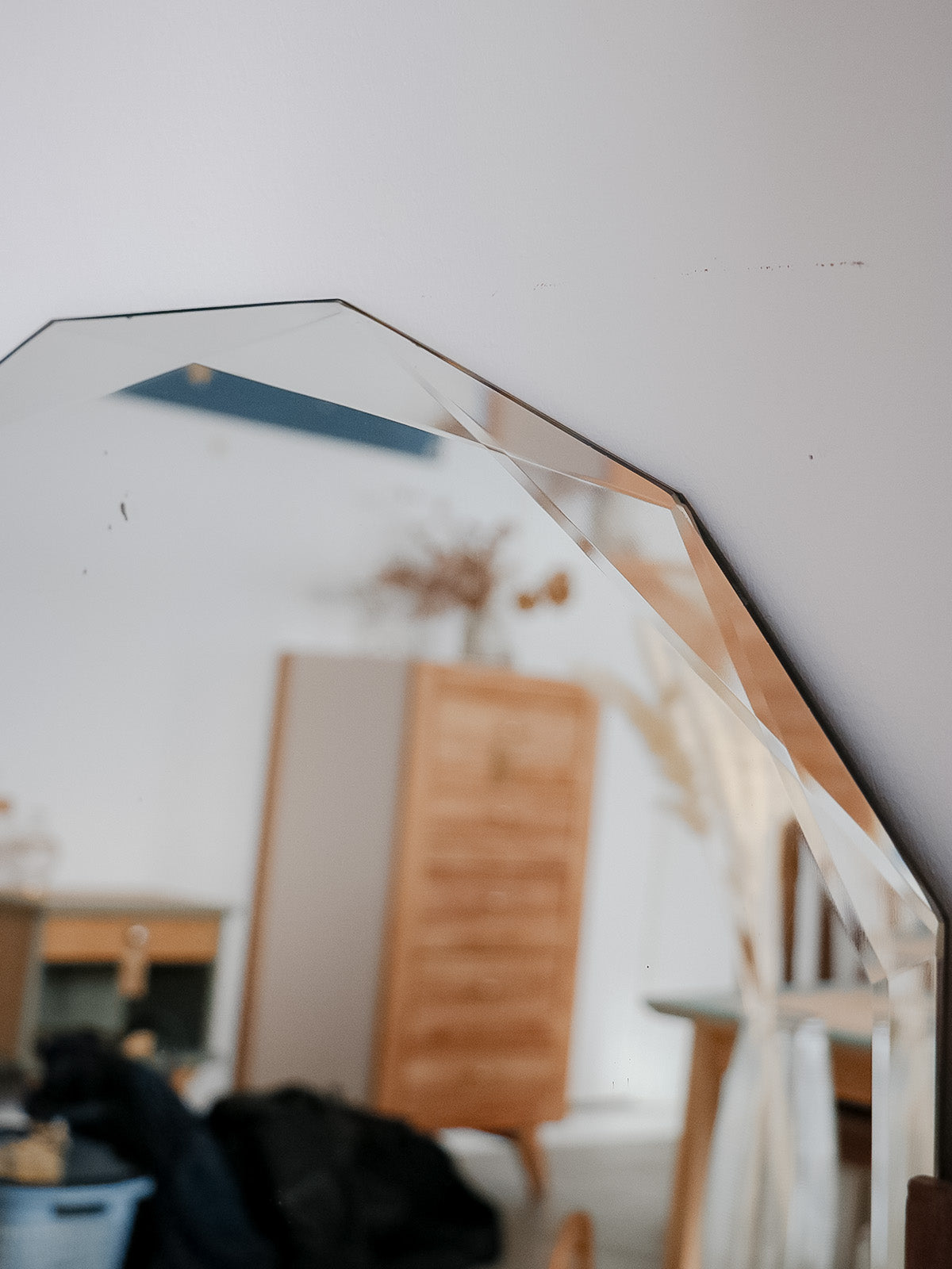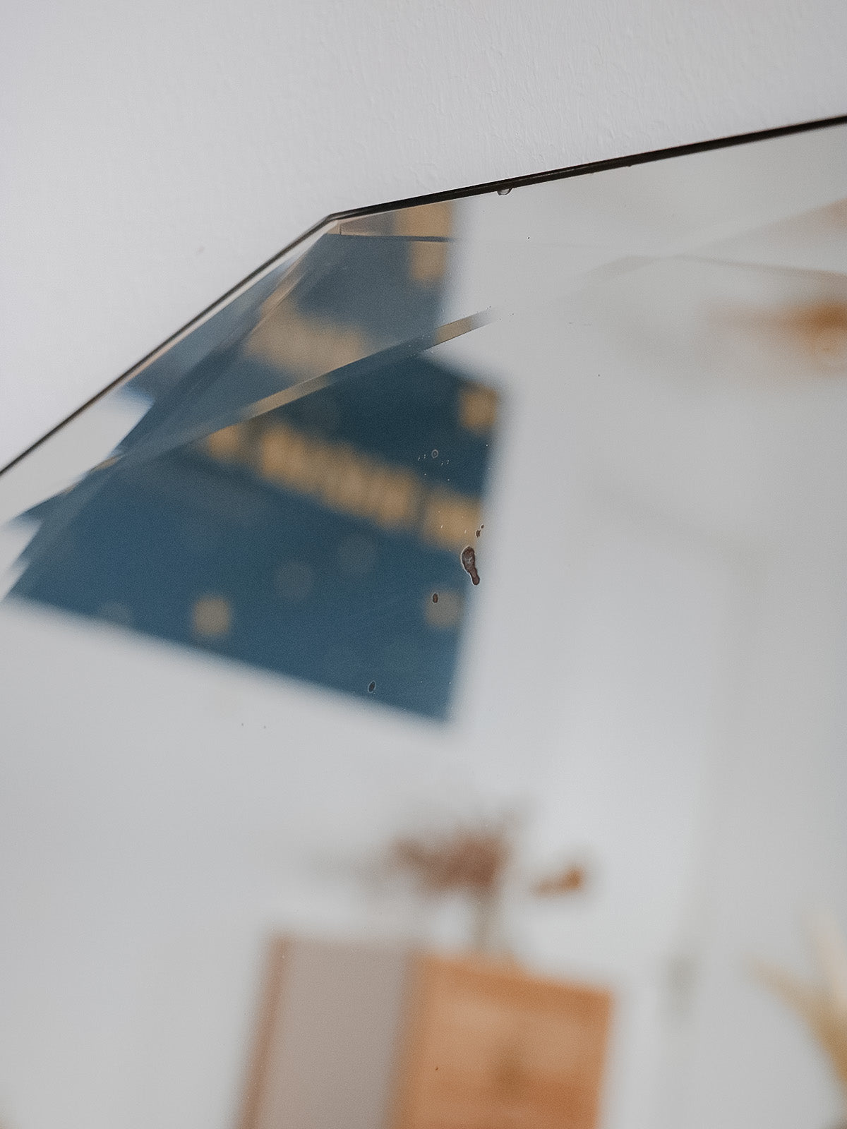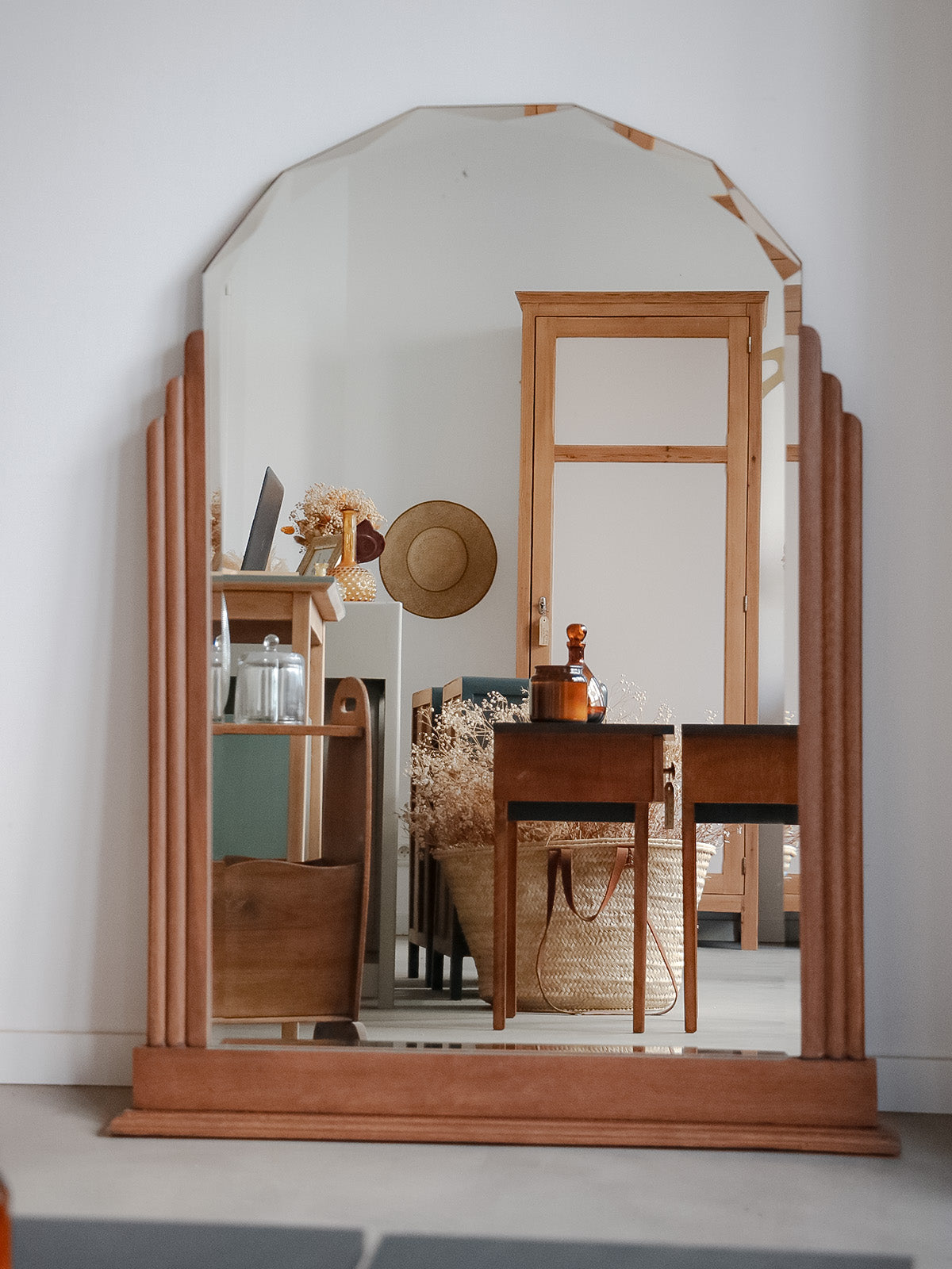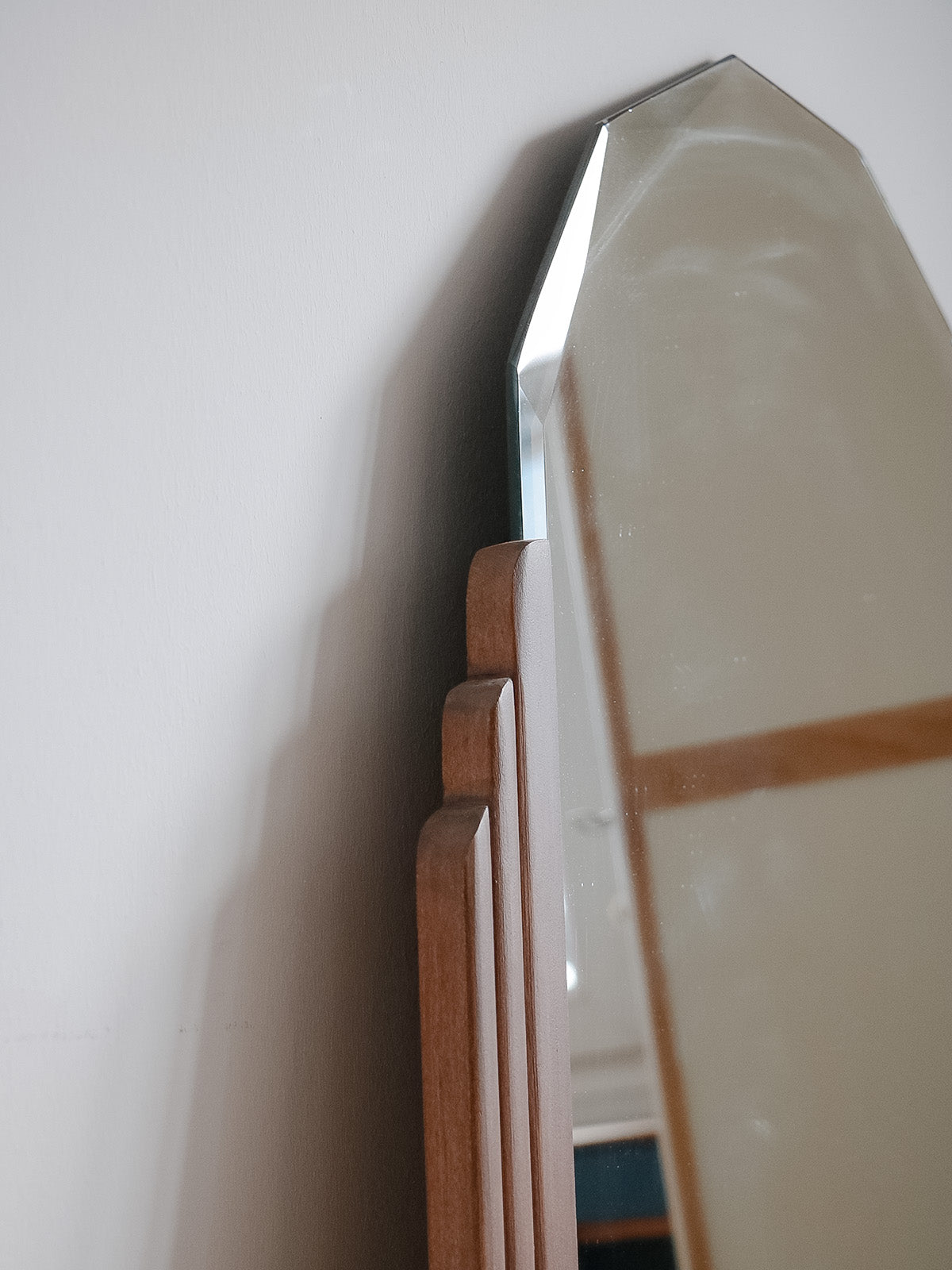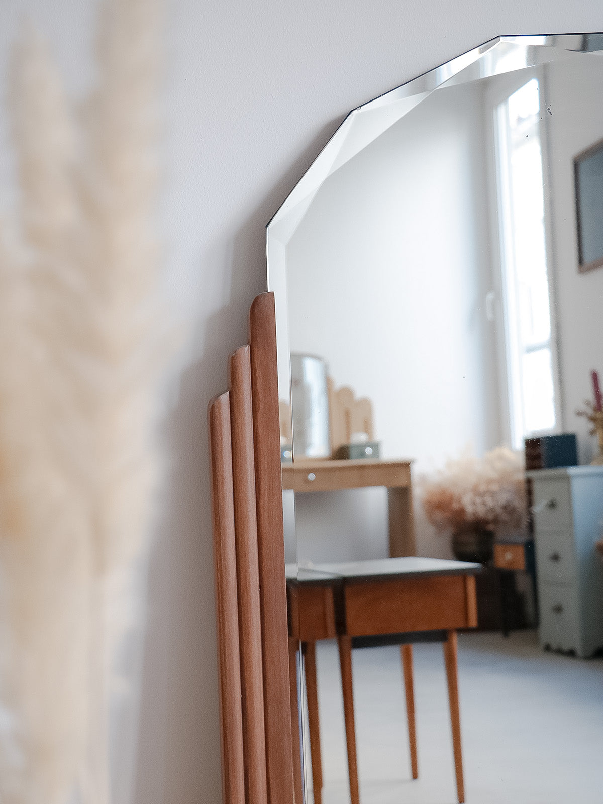 Sublimez votre intérieur avec ce miroir Art déco en hêtre teinté, où un biseau géométrique ponctue élégamment la partie supérieure. À poser, son format vertical offre une présence généreuse, idéale pour une cheminée, une entrée ou pour agrandir visuellement une pièce. Le cadre en bois met en valeur la surface du miroir, le bord supérieur laissant apparaître le verre nu pour une touche graphique et contemporaine. Légères traces du temps sur le miroir qui participent à son charme.