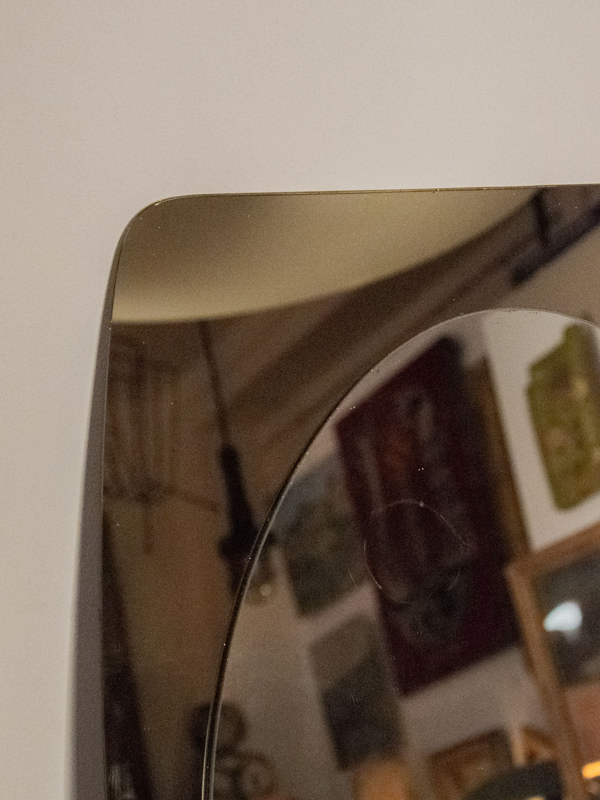 Découvrez ce miroir italien bicolore des années 70, à la silhouette rectangulaire aux angles arrondis qui apporte une touche rétro et graphique à votre intérieur. Son cadre teinté souligne le jeu de lumière du verre et s'intègre naturellement dans une entrée, une chambre ou une salle de bains, offrant élégance et caractère. Parfait pour créer une atmosphère chaleureuse et singulière, il conserve une marque en forme d'auréole et de légères piqûres. Il peut être posé à l'horizontale ou à la verticale.