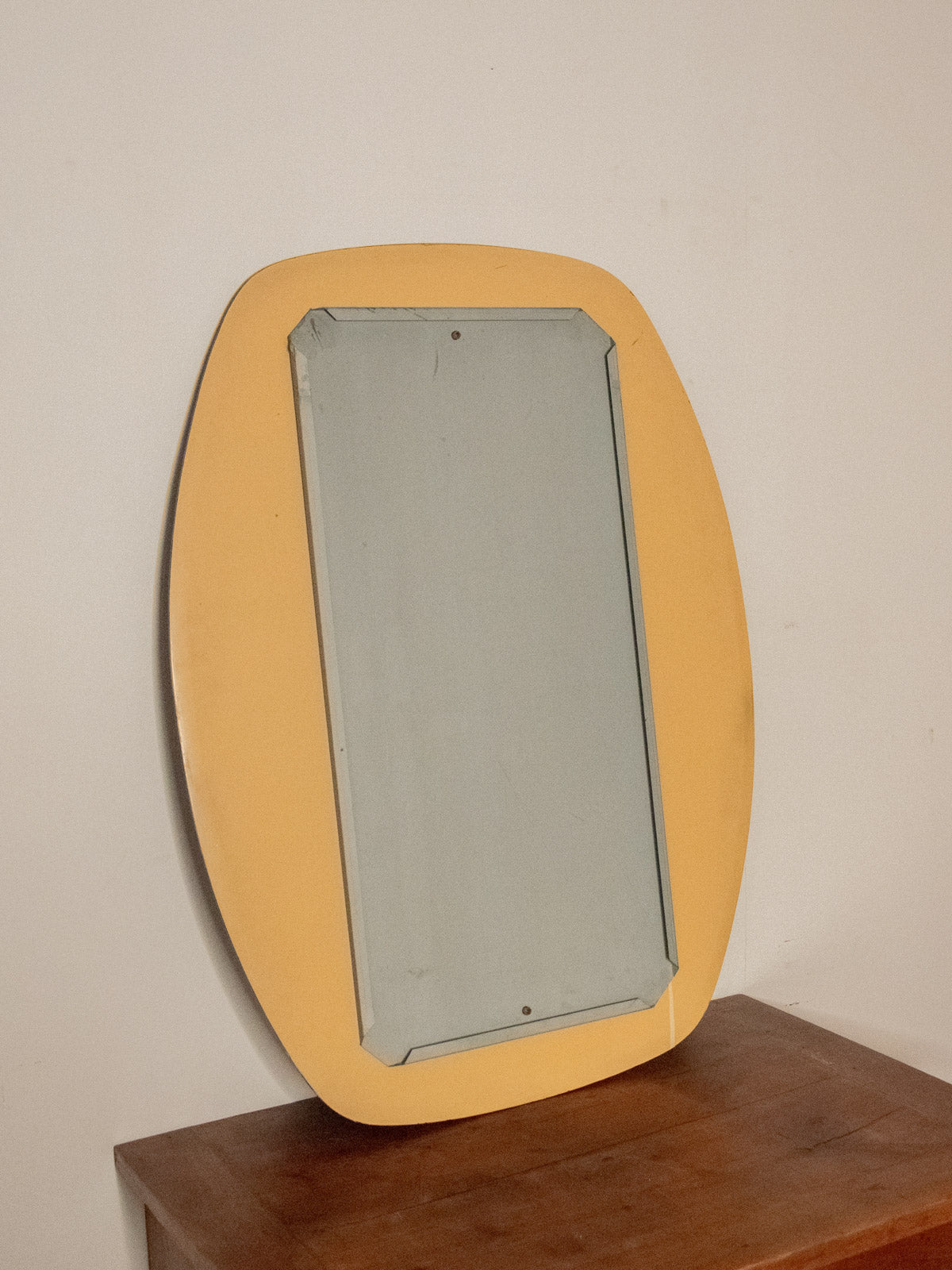 Invitez ce miroir bicolore italien des années 70 au design en rectangle aux angles arrondis, un élégant jeu de tons qui capte la lumière et structure votre mur avec discrétion. Le verre teinté de son cadre aux contrastes maîtrisés évoquent l'esprit rétro-chic, idéal pour l'entrée, la chambre ou au‑dessus d'une console afin d'apporter profondeur et douceur à la pièce. Ses proportions équilibrées donnent une présence singulière sans encombrer l'espace. En excellent état malgré de rares et discrètes piqûres.