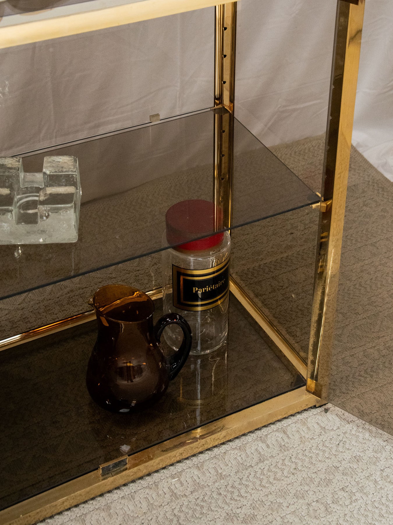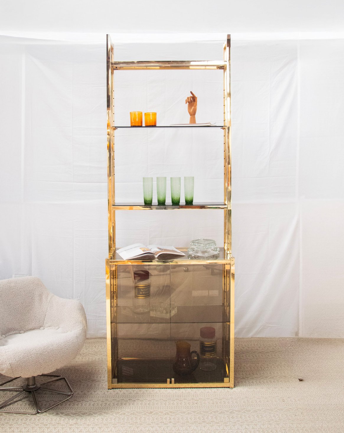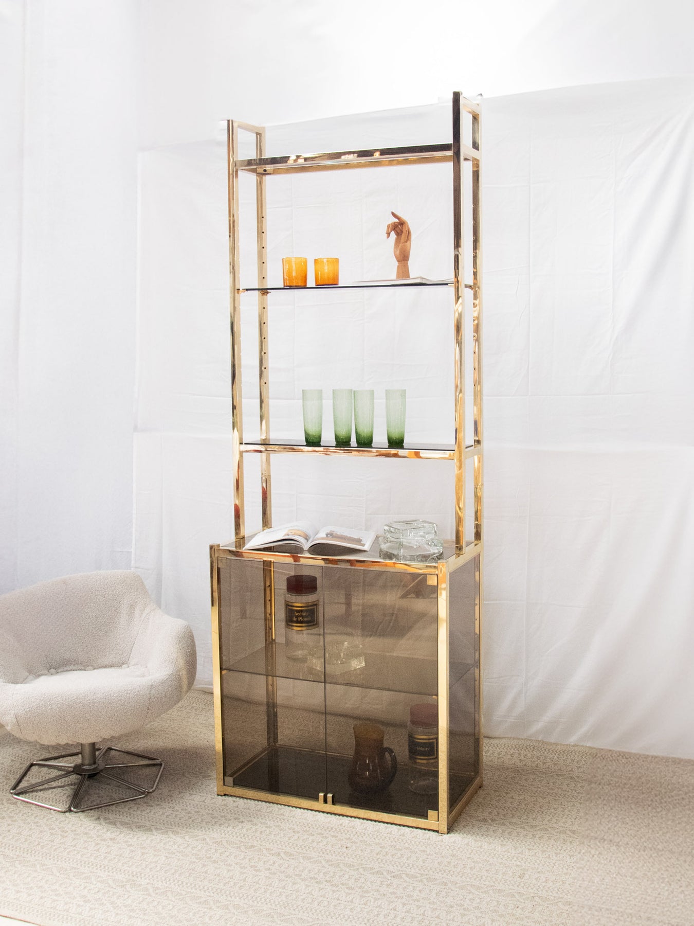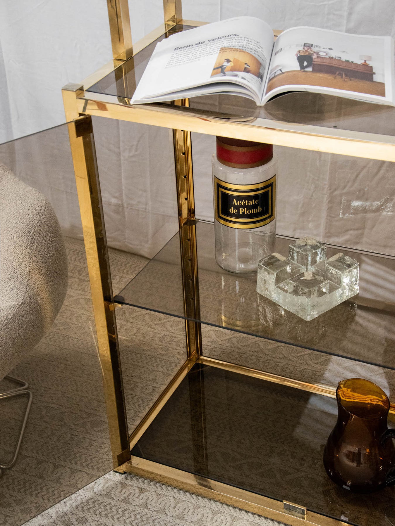Découvrez cette élégante étagère avec une structure dorée, qui apporte une touche de sophistication à votre intérieur. Dotée de trois étagères en verre fumé, elle offre un espace de rangement à la fois fonctionnel et esthétique. Le placard en verre fumé, agrémenté de poignées dorées, assure un look raffiné tout en permettant un accès facile à vos objets. De plus, l'étagère haute réglable dans le placard s'adapte à vos besoins, tandis que sa structure plus fine apporte légèreté et élégance à votre décoration.