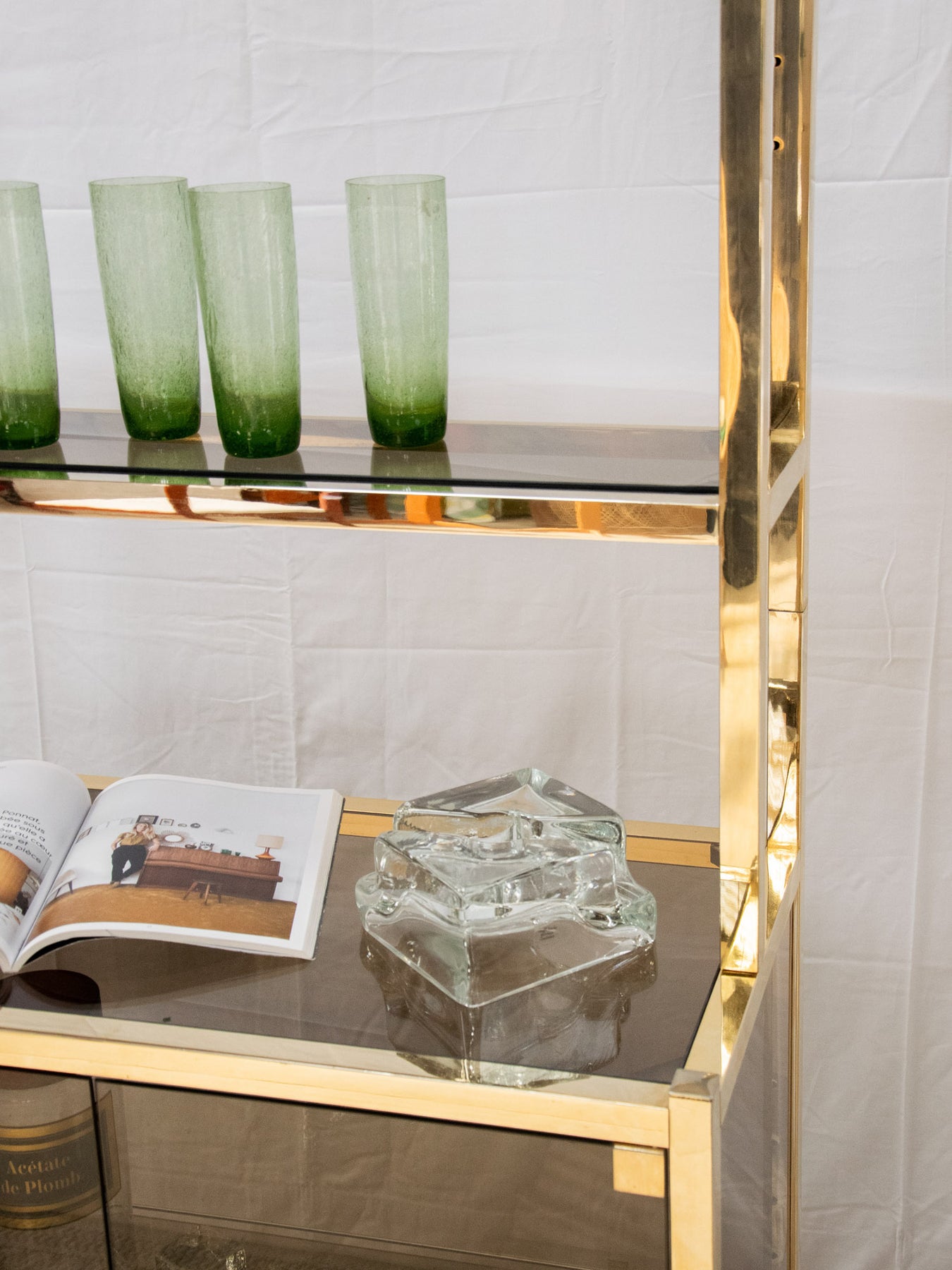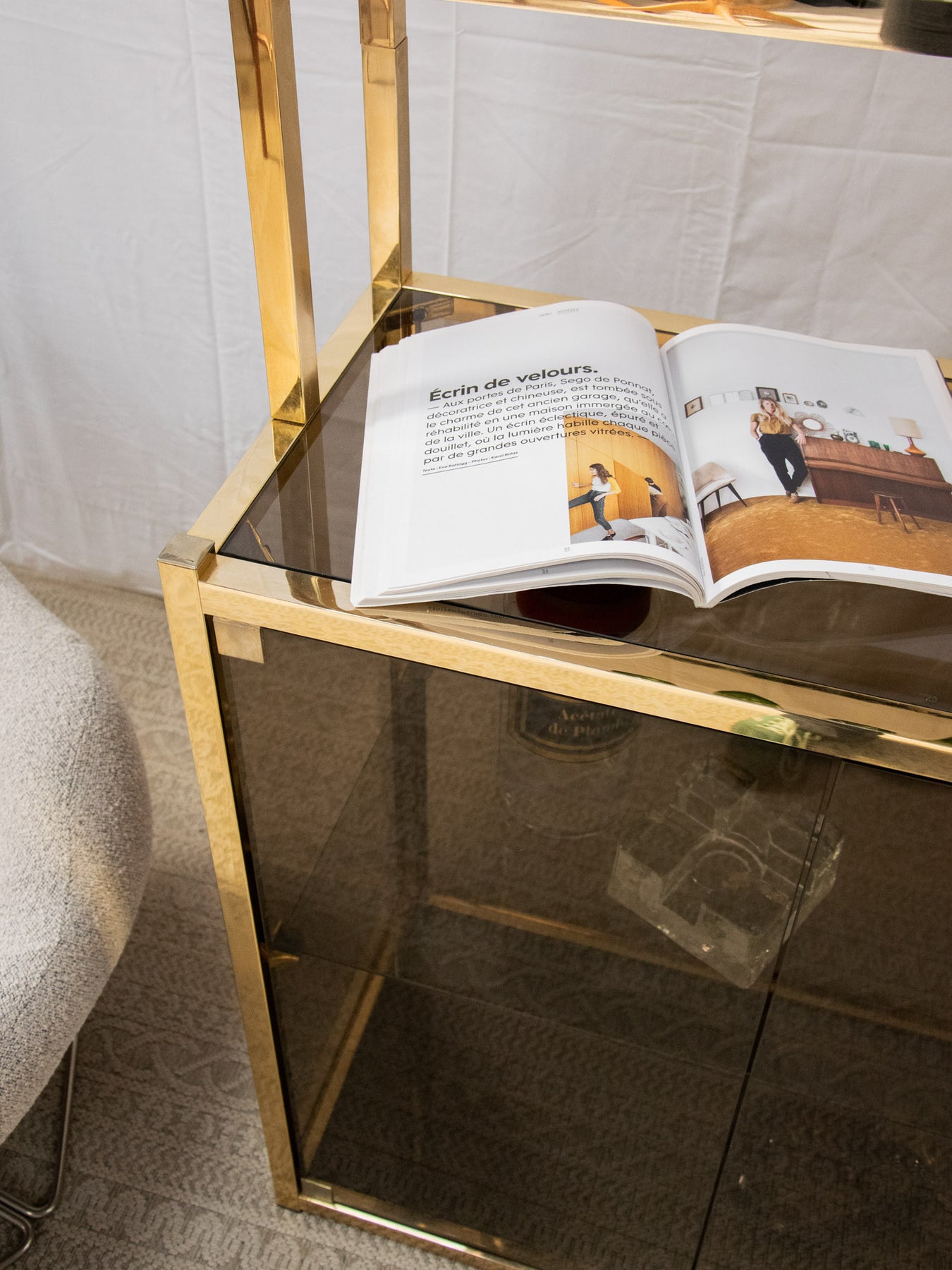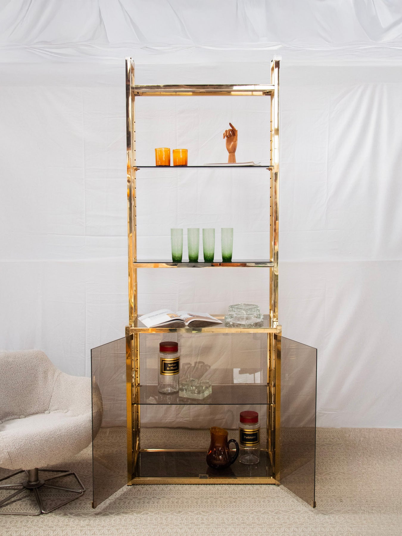 Découvrez cette élégante étagère avec une structure dorée, qui apporte une touche de sophistication à votre intérieur. Dotée de trois étagères en verre fumé, elle offre un espace de rangement à la fois fonctionnel et esthétique. Le placard en verre fumé, agrémenté de poignées dorées, assure un look raffiné tout en permettant un accès facile à vos objets. De plus, l'étagère haute réglable dans le placard s'adapte à vos besoins, tandis que sa structure plus fine apporte légèreté et élégance à votre décoration.