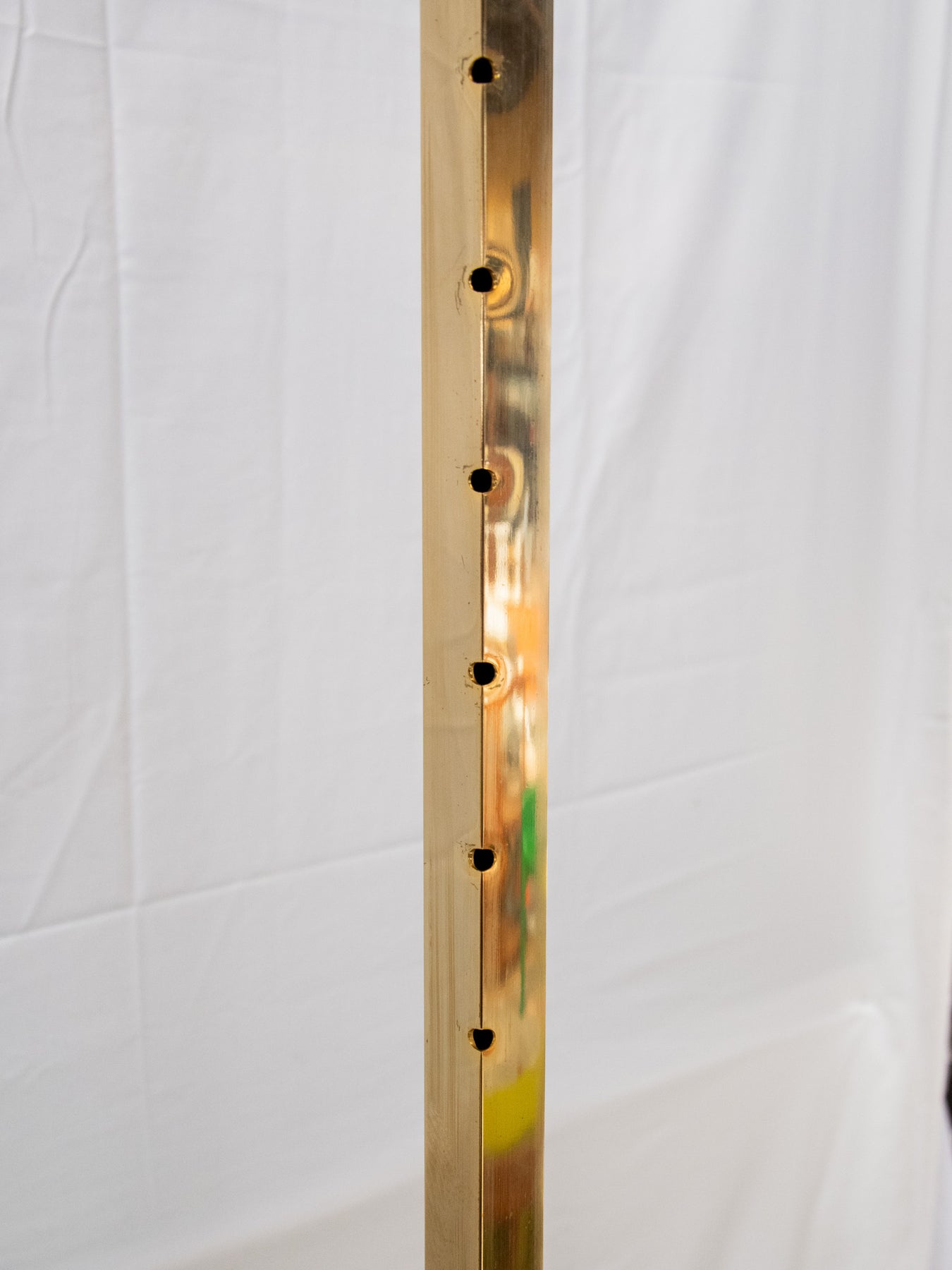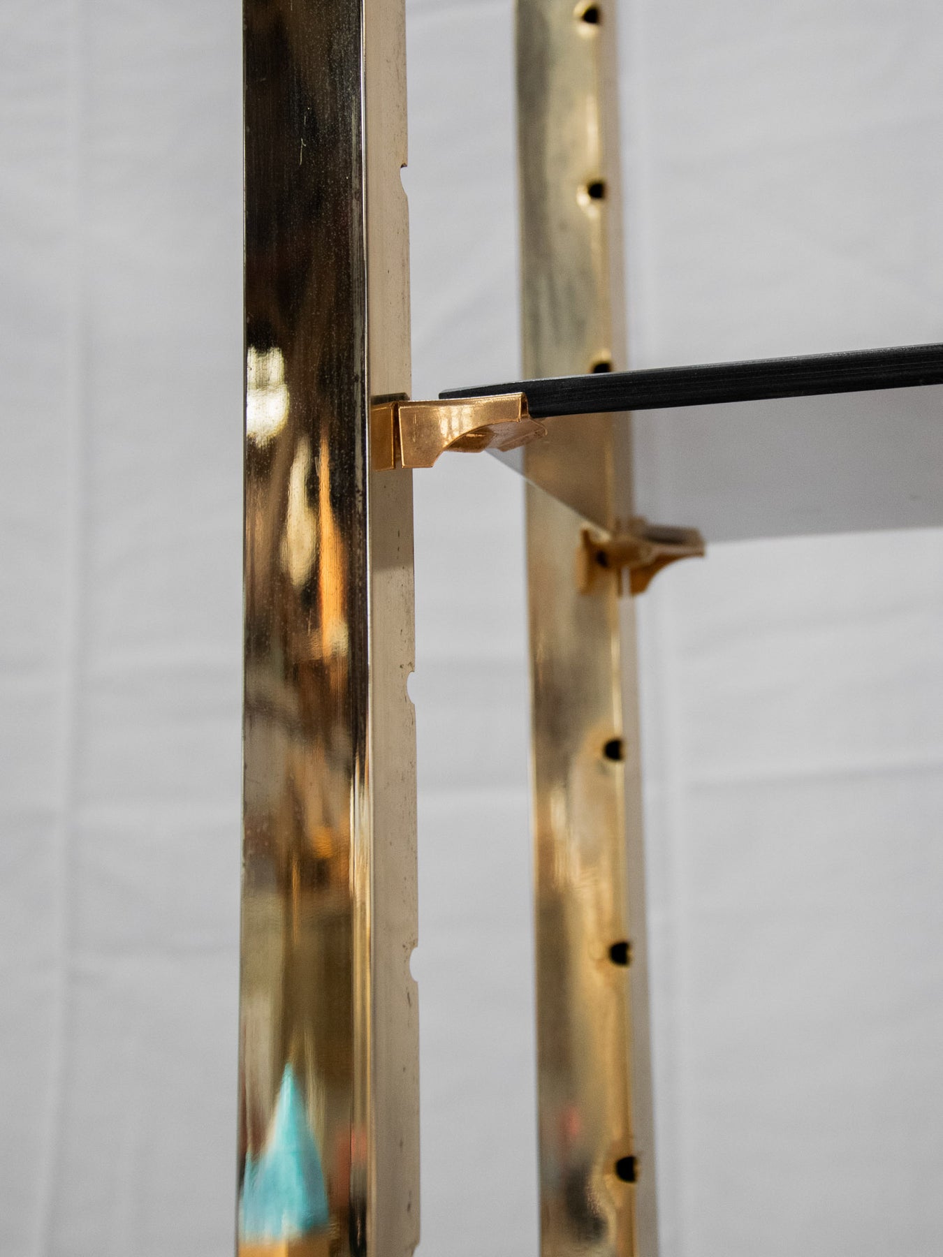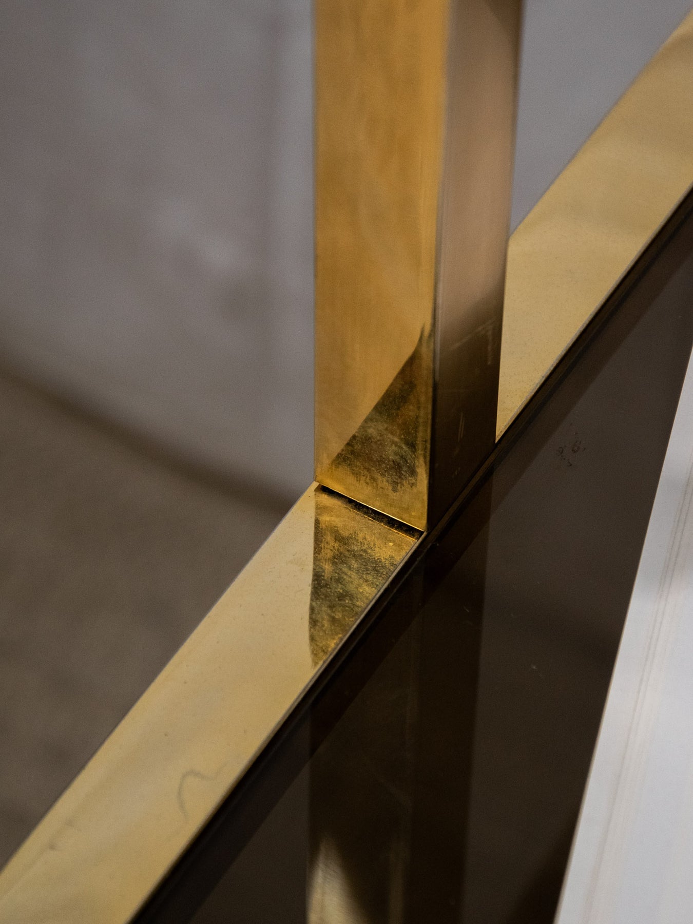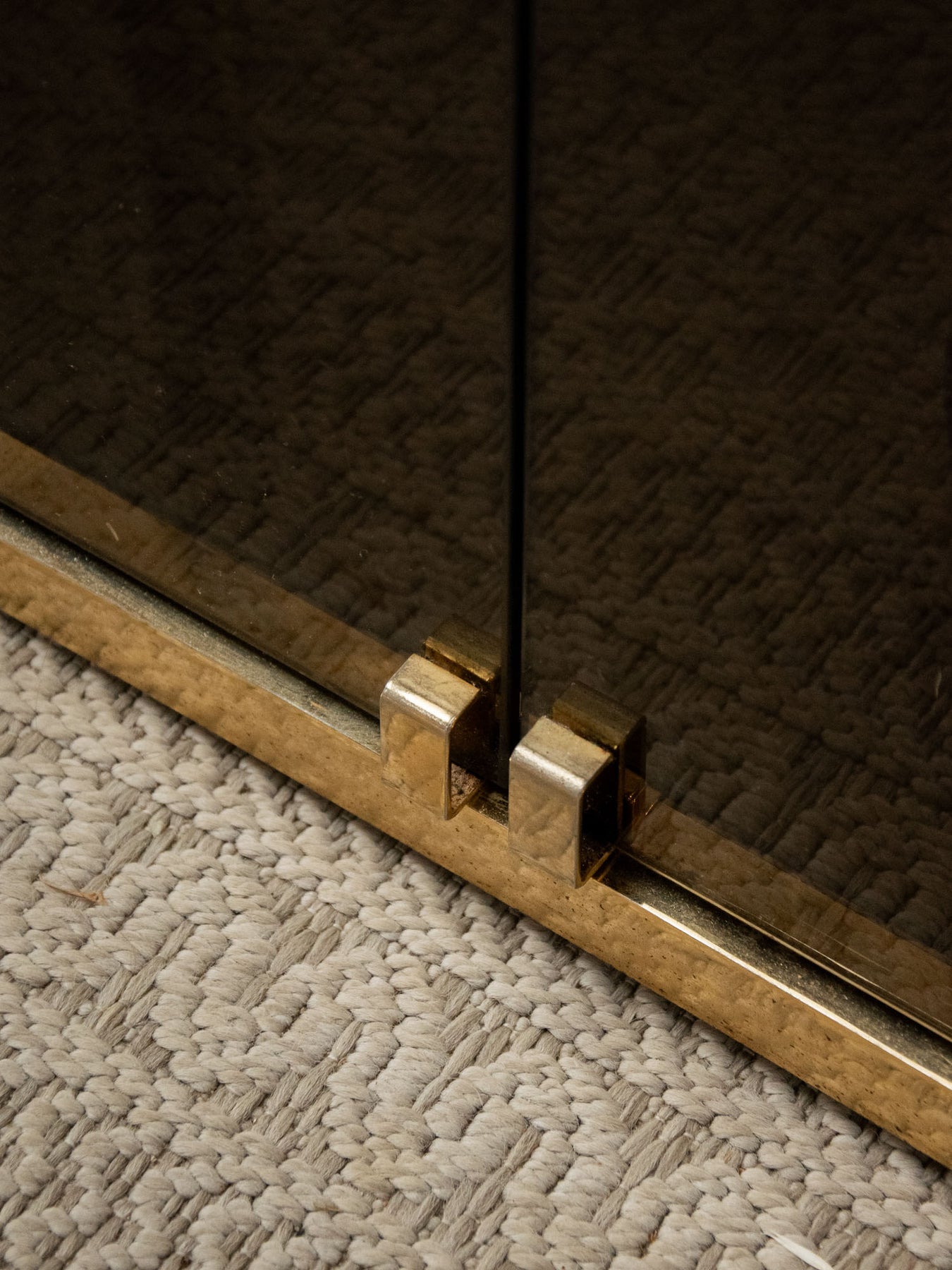 Découvrez cette élégante étagère avec une structure dorée, qui apporte une touche de sophistication à votre intérieur. Dotée de trois étagères en verre fumé, elle offre un espace de rangement à la fois fonctionnel et esthétique. Le placard en verre fumé, agrémenté de poignées dorées, assure un look raffiné tout en permettant un accès facile à vos objets. De plus, l'étagère haute réglable dans le placard s'adapte à vos besoins, tandis que sa structure plus fine apporte légèreté et élégance à votre décoration.