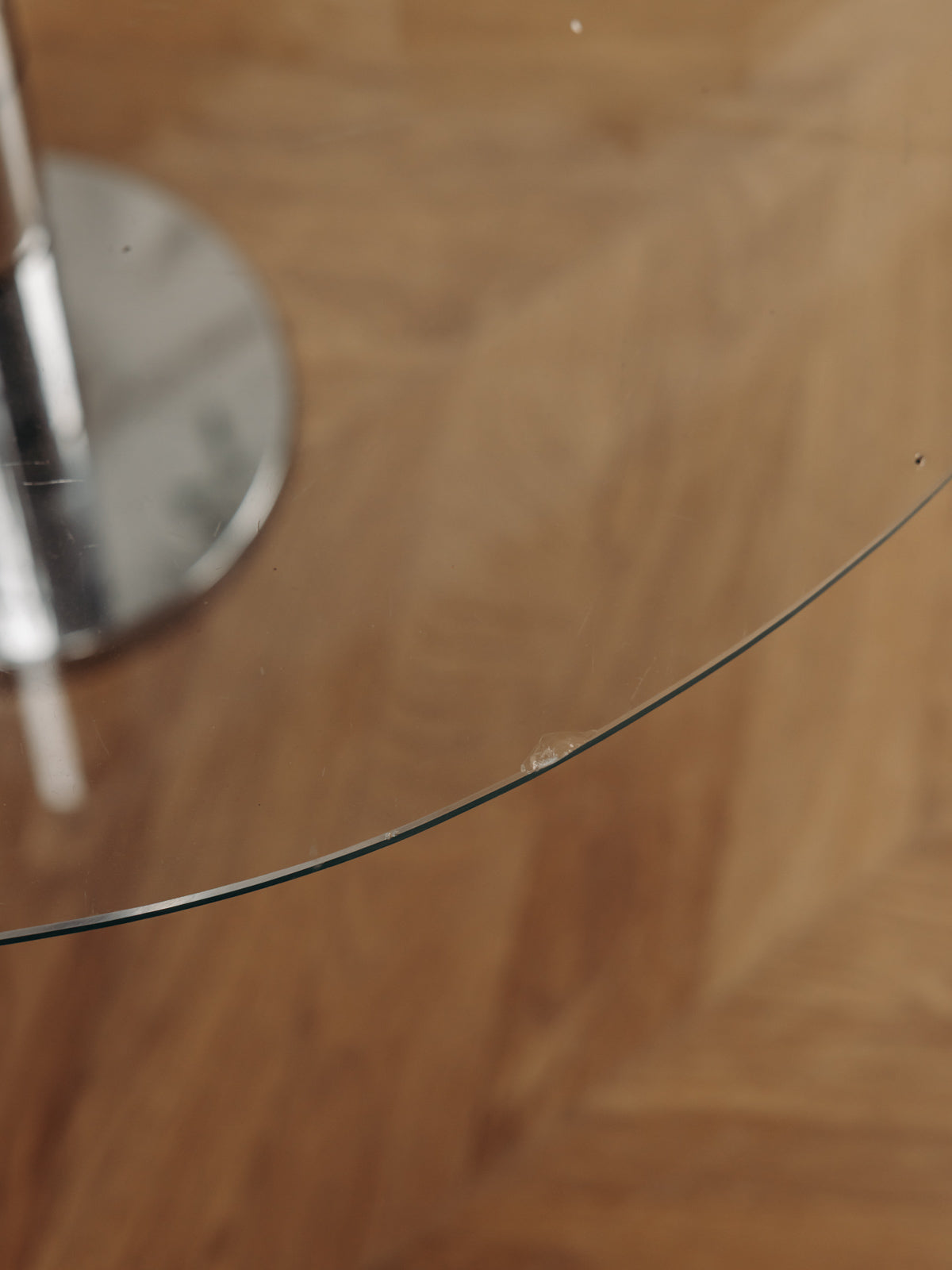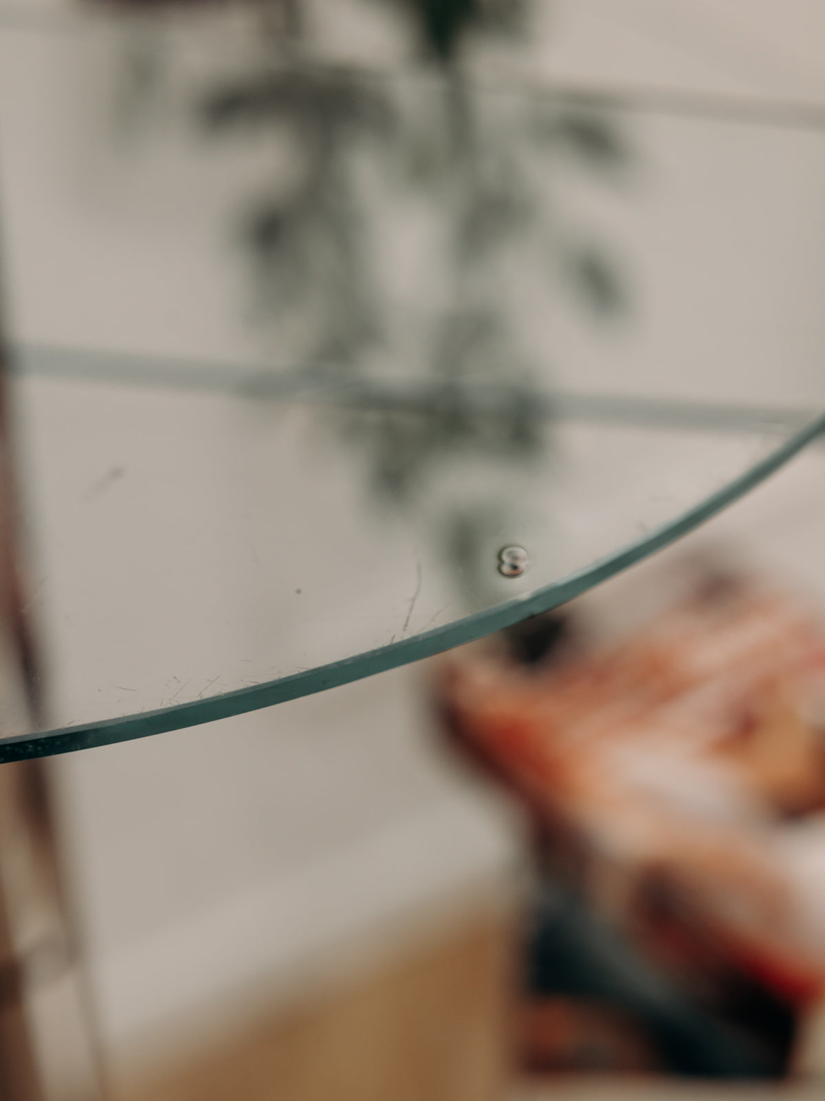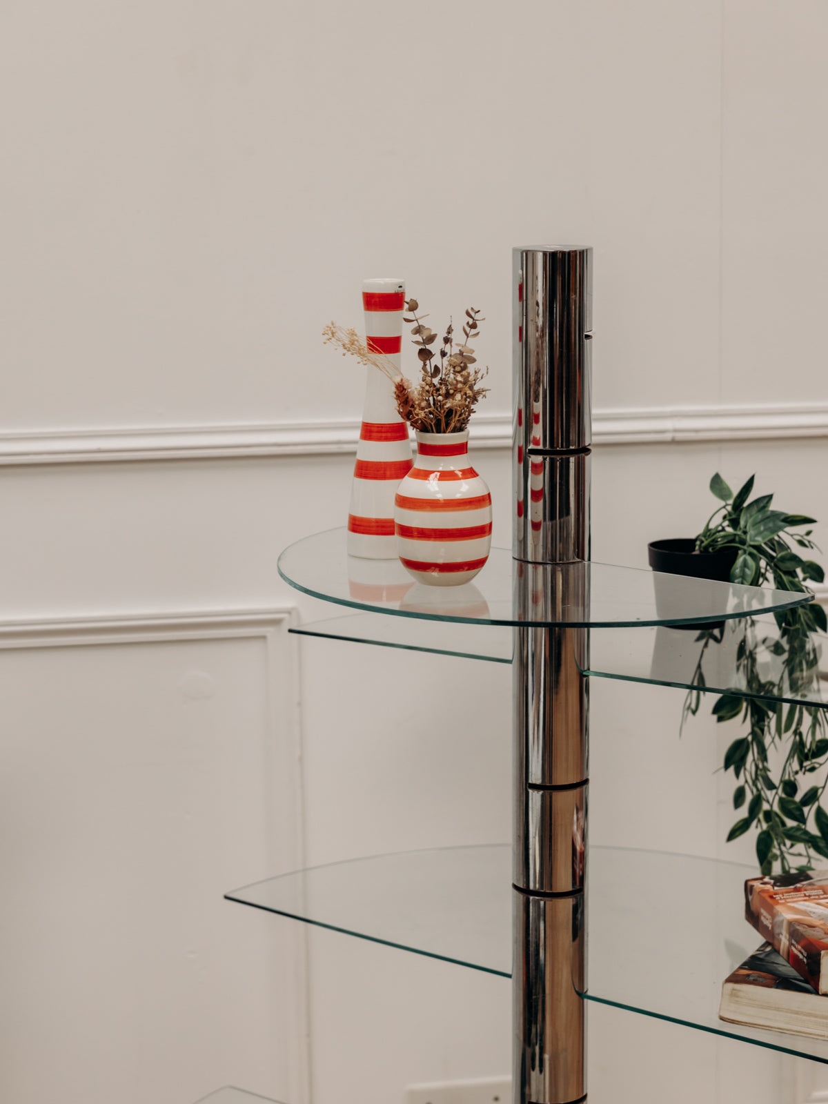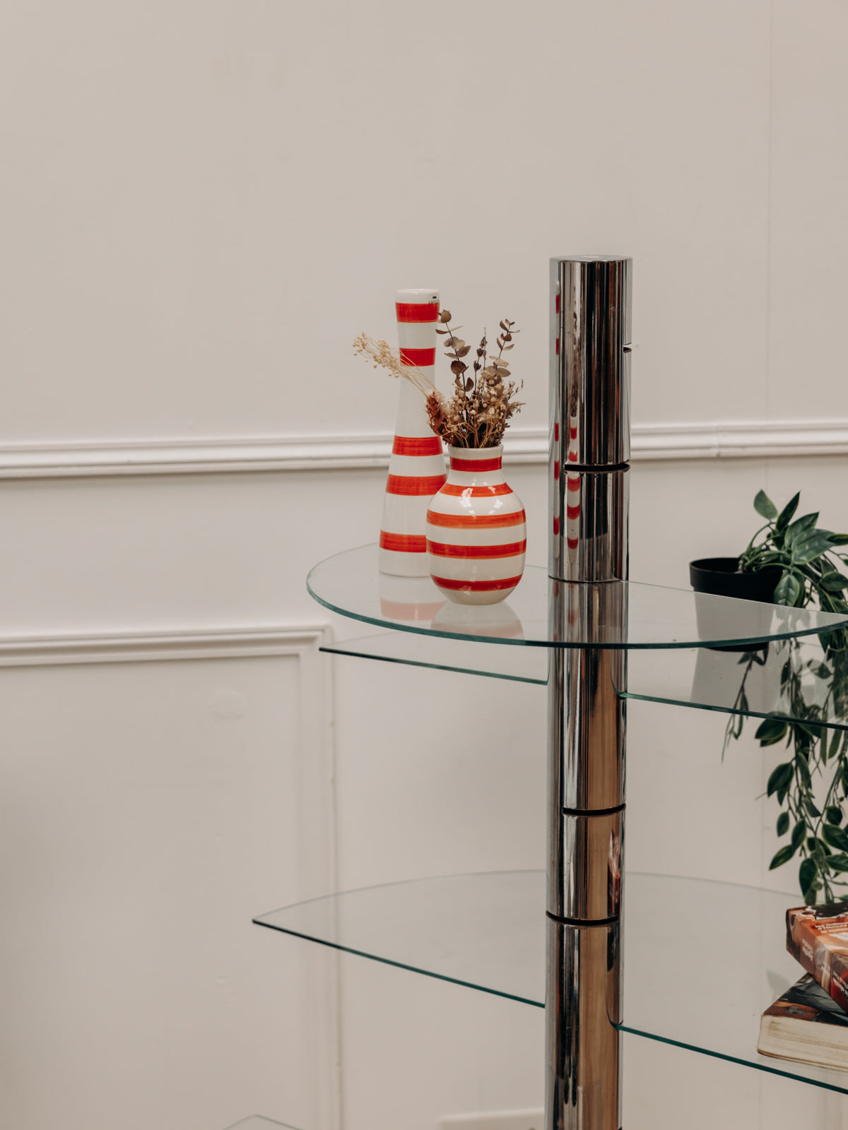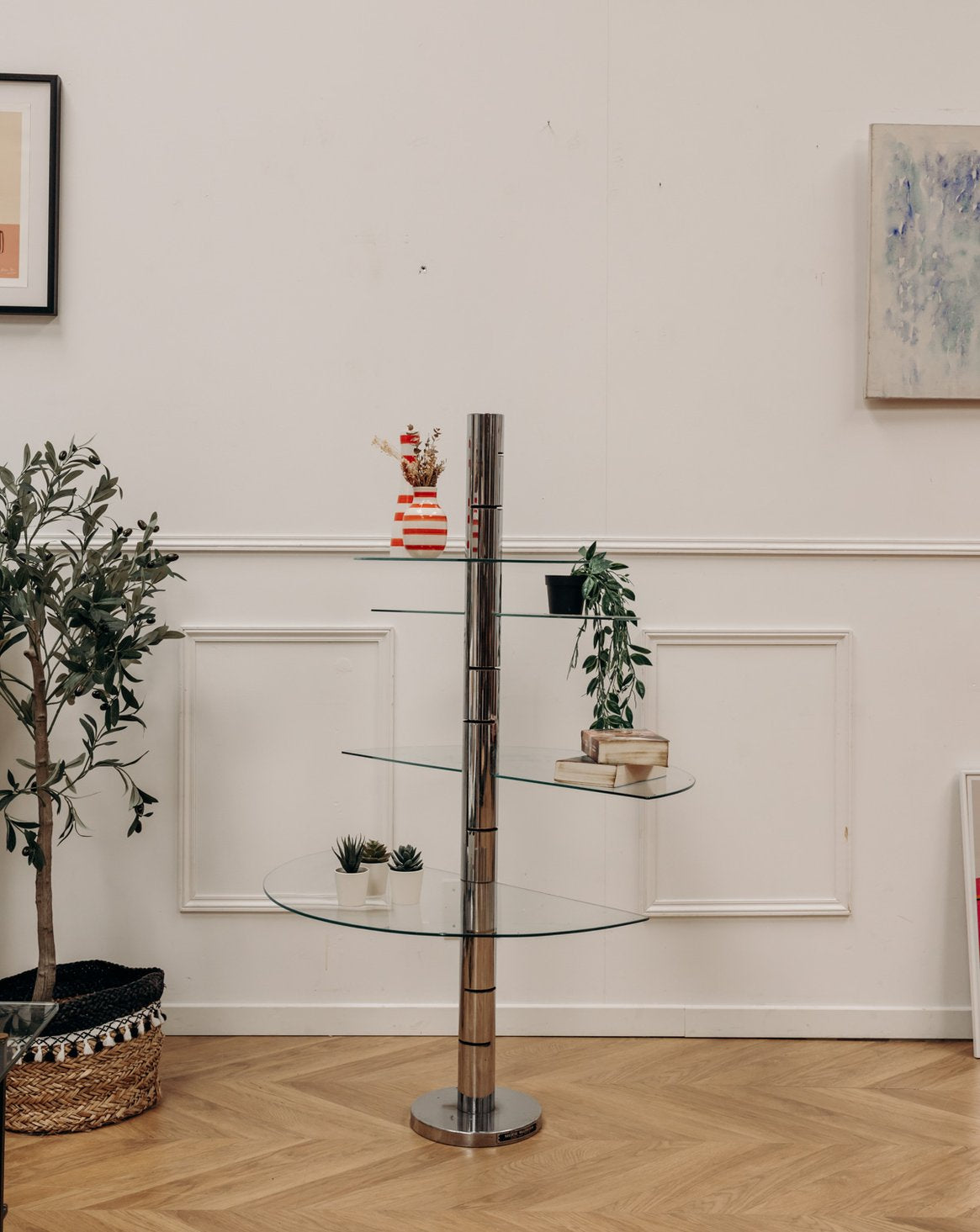 Optez pour ce présentoir vintage Multiform des années 70–80 au design aérien en métal chromé et plateaux en verre, son éclat argenté souligne une silhouette sobre et graphique. Quatre plateaux amovibles offrent une modularité pratique pour exposer vaisselle, petits objets ou plantes, idéale comme présentoir de magasin détourné en meuble d'entrée ou en bout de canapé. Le mariage du métal et du verre crée une ambiance lumineuse et raffinée, parfaite pour un intérieur rétro contemporain. Pièce d'édition française qui conserve son authenticité. Légères traces du temps qui participent à son charme.