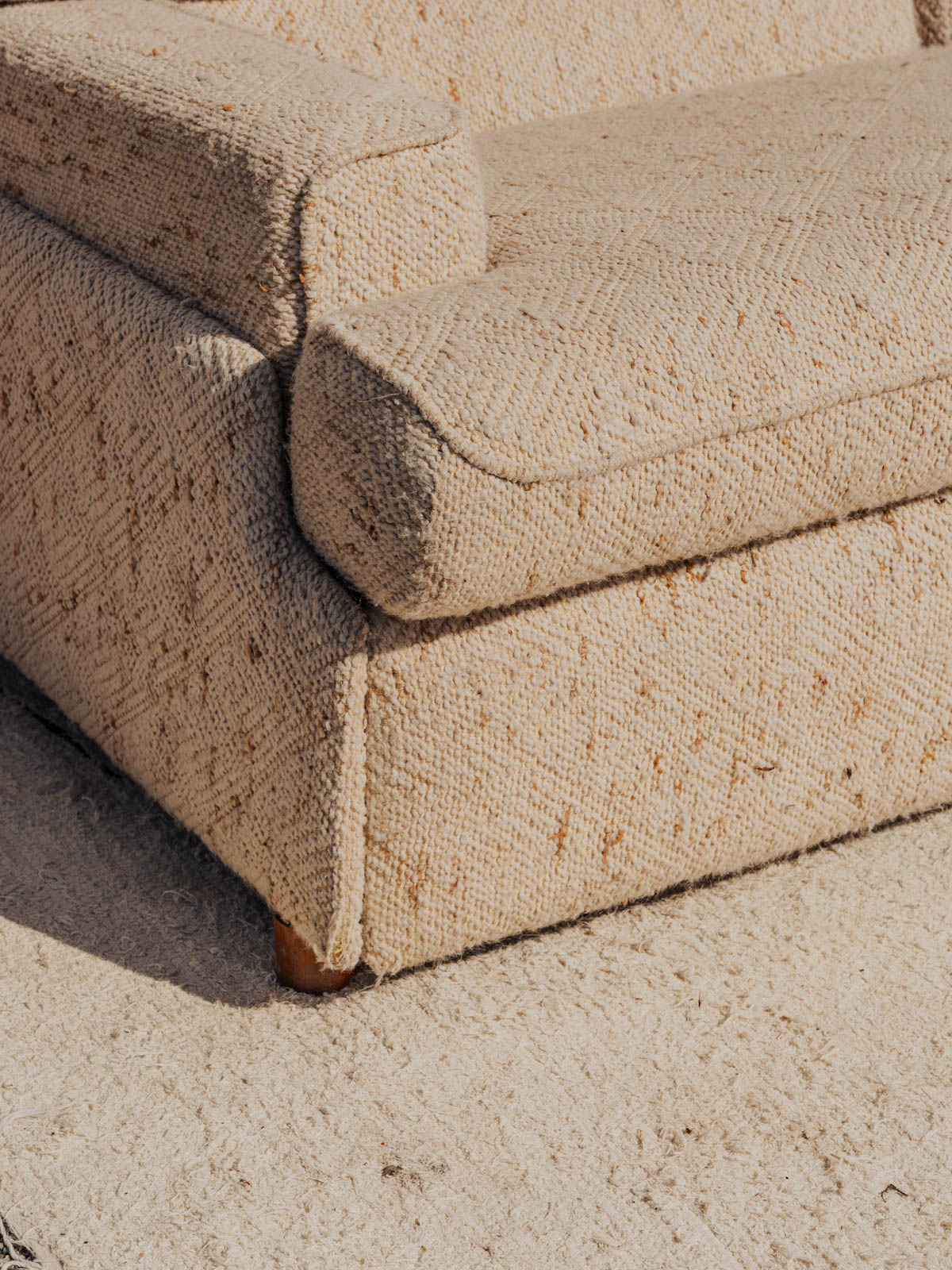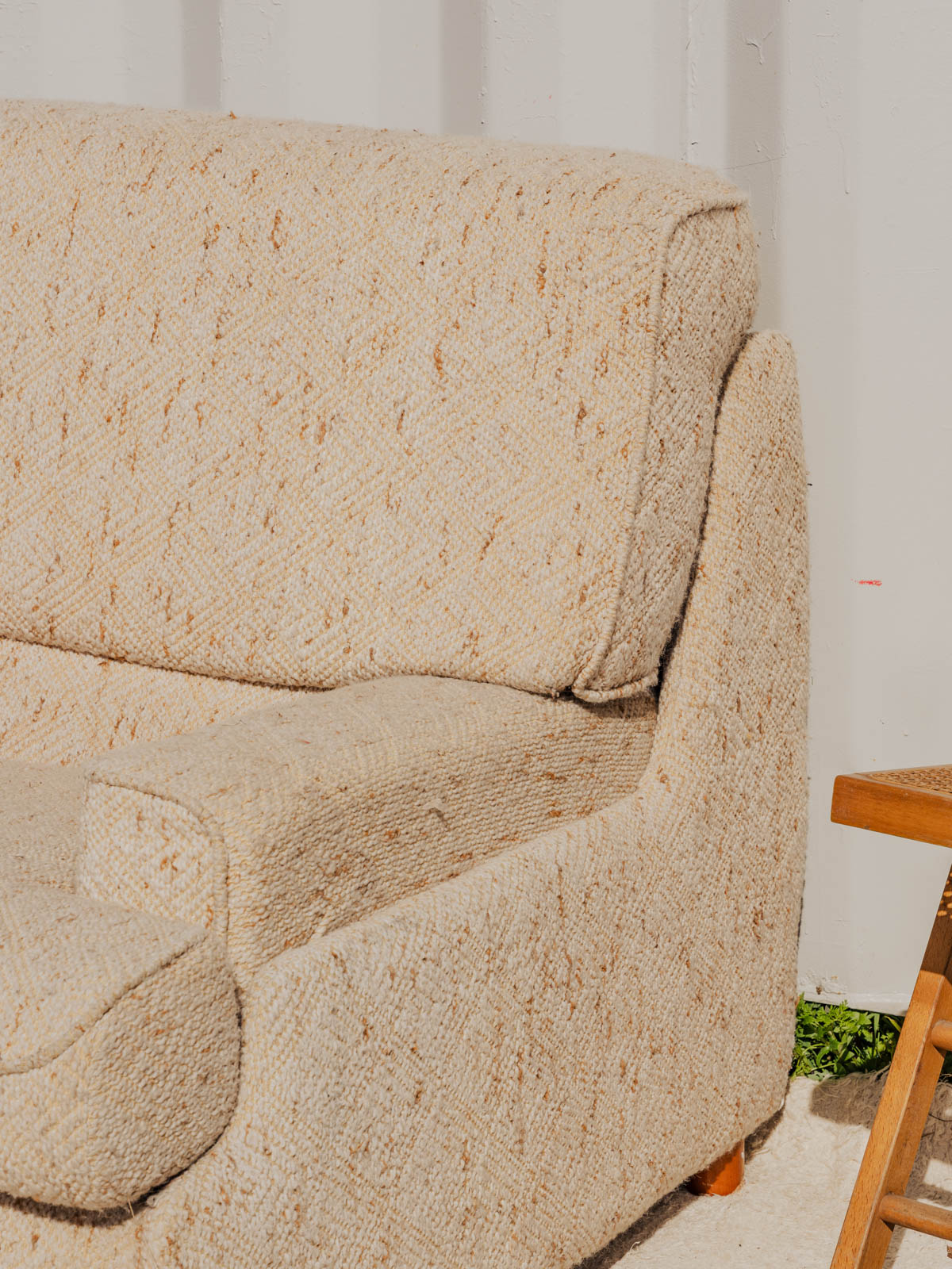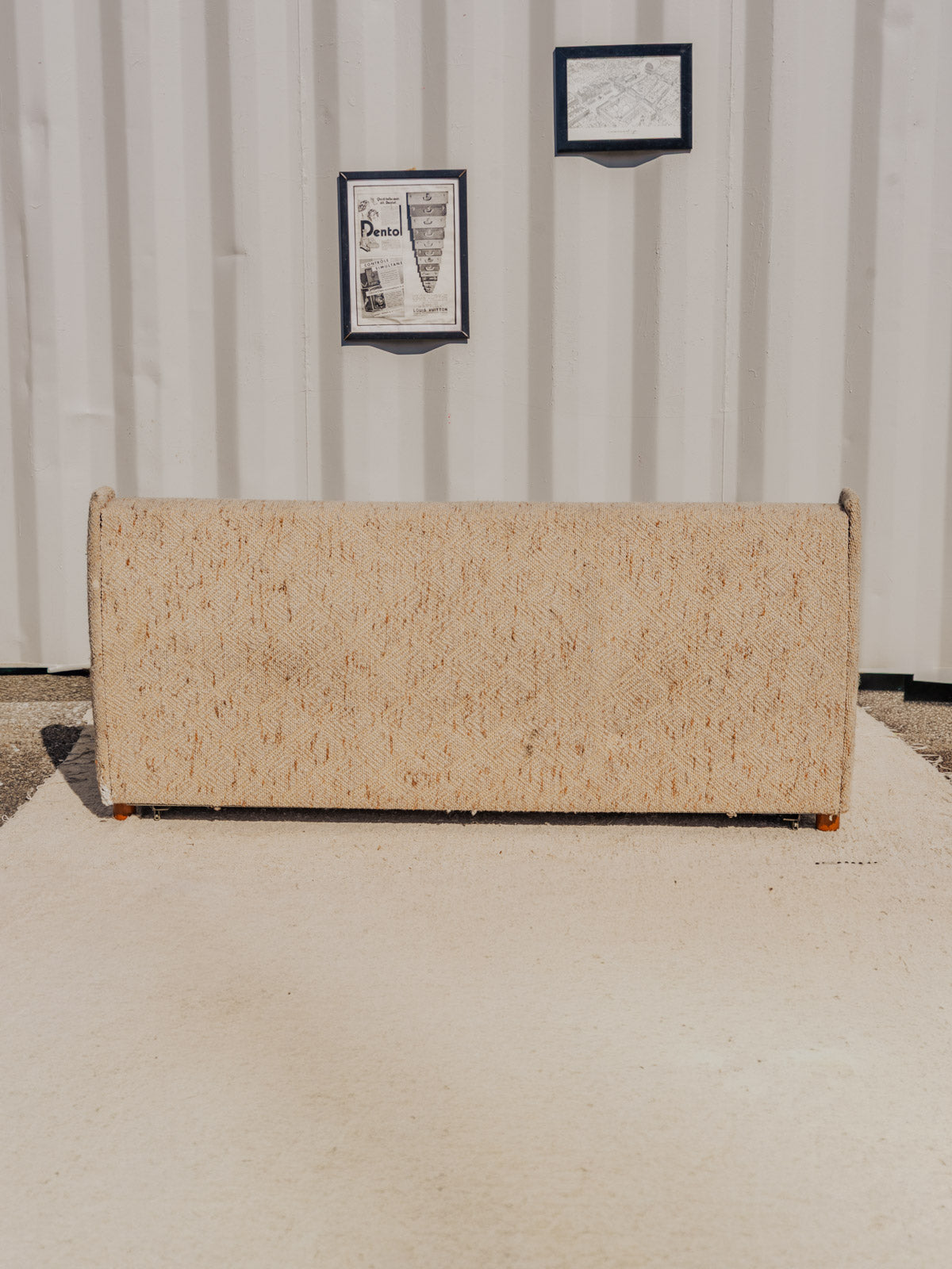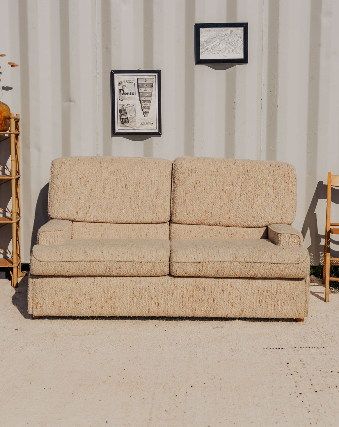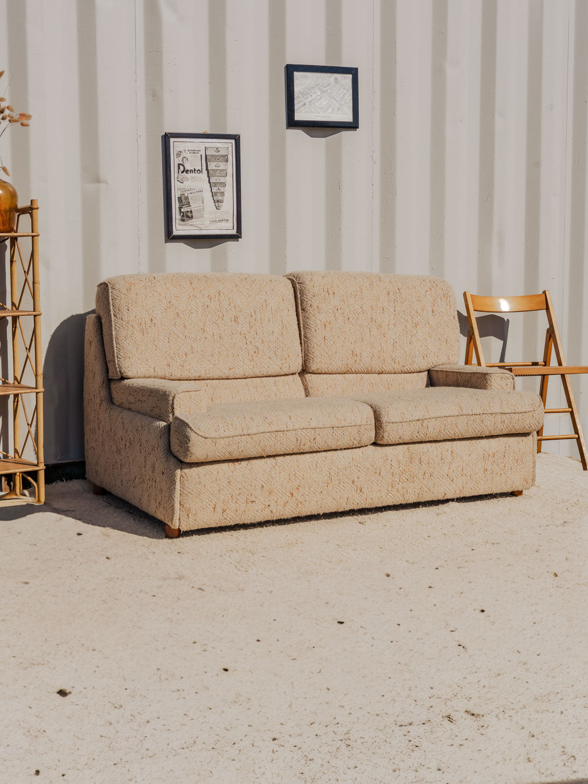 Adoptez ce canapé convertible en tissu bouclette beige, posé sur des pieds en bois, qui apporte une note douce et contemporaine à votre salon. Son assise se transforme facilement en lit double, offrant un couchage d'appoint confortable grâce à un matelas fin intégré, idéal pour recevoir sans empiéter sur l'espace. La texture bouclette et la chaleur du bois créent une ambiance chaleureuse et élégante. Quelques traces du temps présentes.