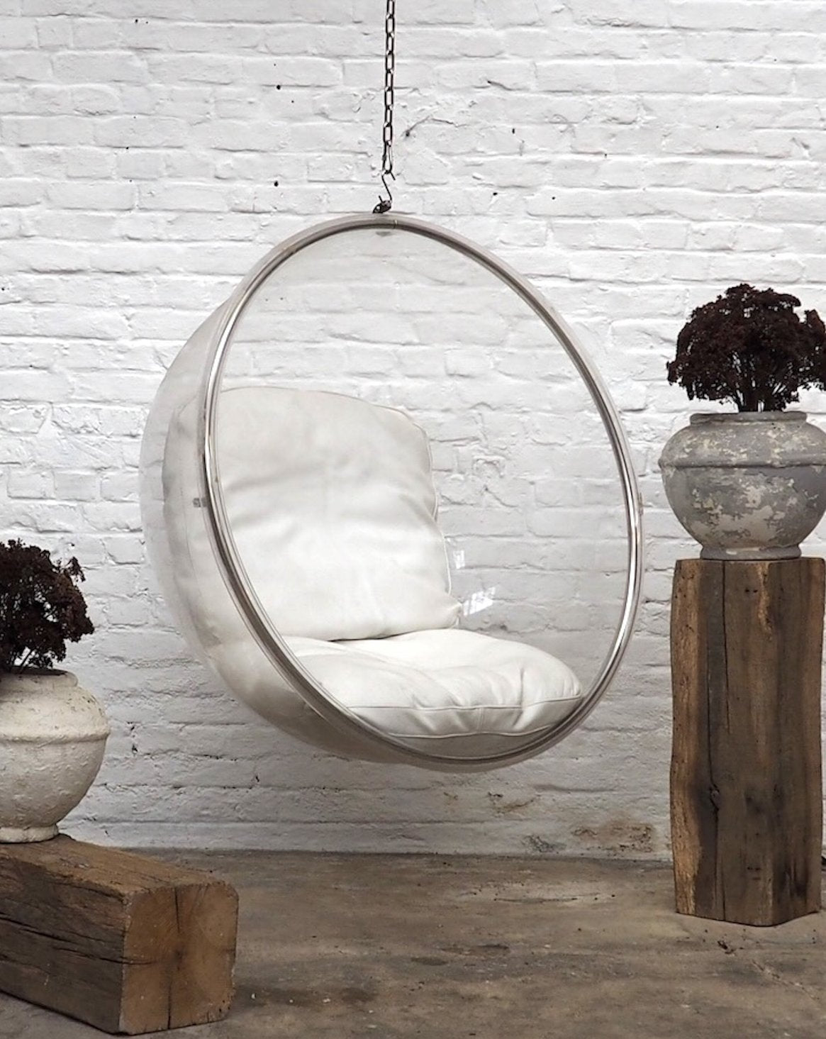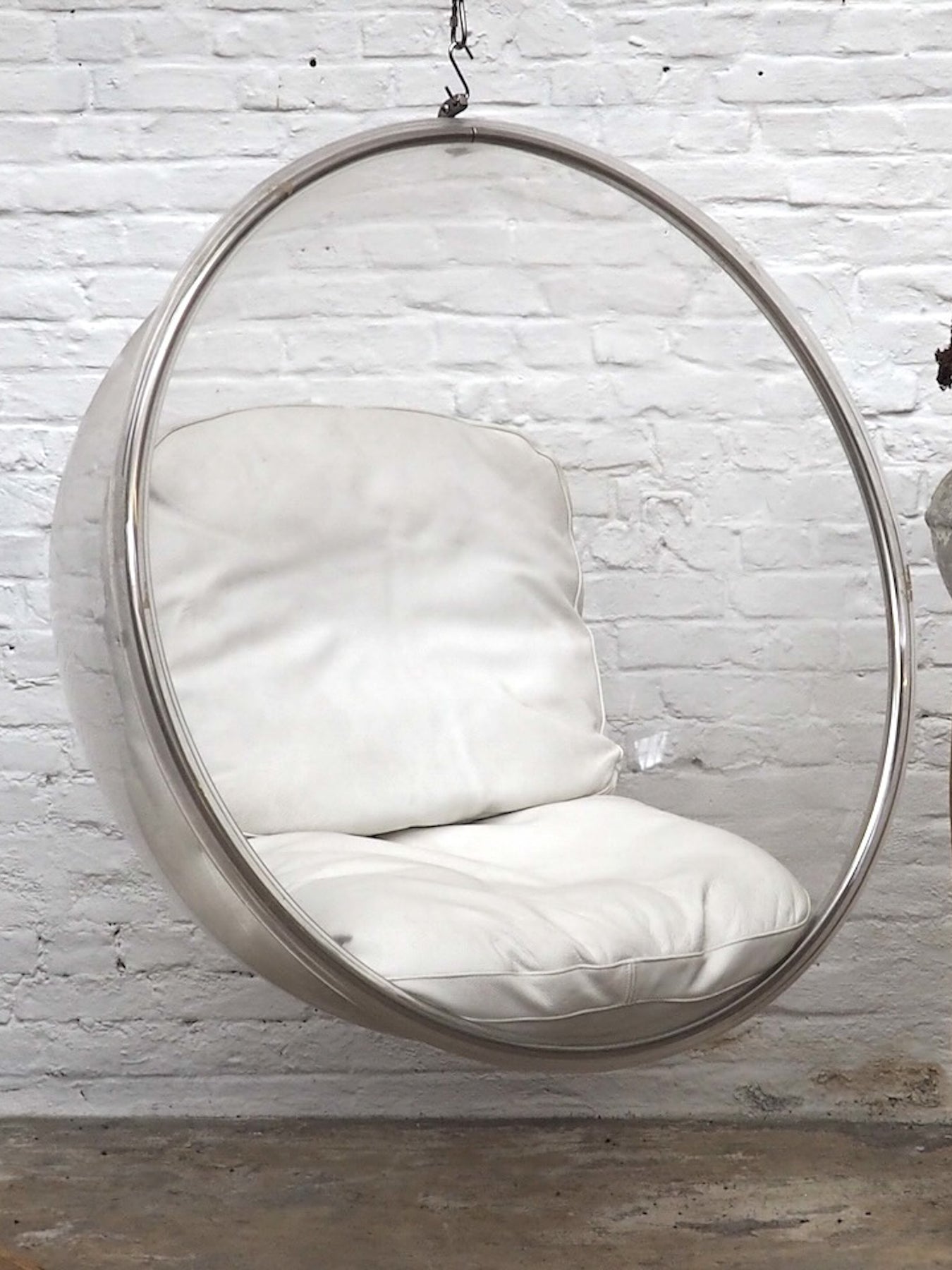 Adoptez la Bubble Chair d'Eero Aarnio, création iconique de 1968, qui imprime une silhouette sculpturale et aérienne à tout intérieur. Sa coque acrylique translucide soutenue par une structure en acier chromé laisse filtrer la lumière tandis que les coussins en cuir blanc cassé offrent une assise enveloppante et confortable, propice à la lecture ou à la détente. Pensée pour se suspendre au plafond, elle crée un coin lounge graphique et lumineux, à la fois rétro et contemporain.