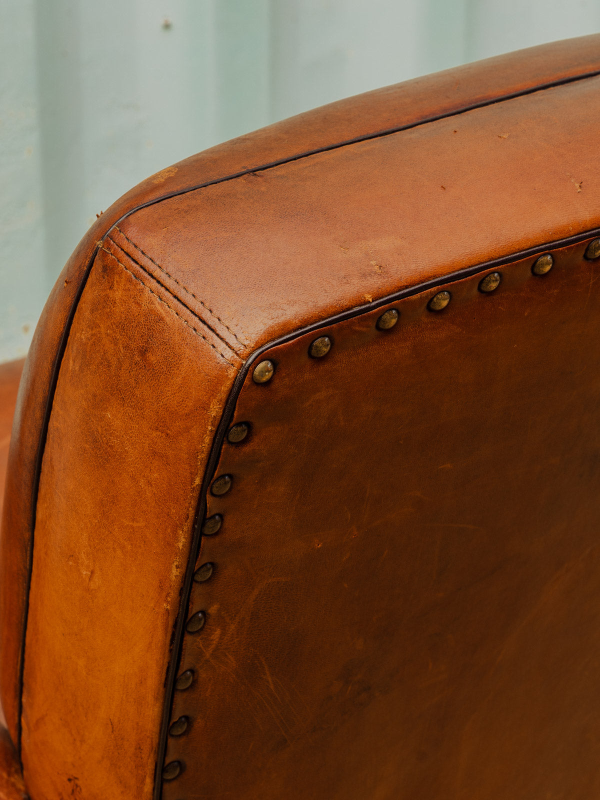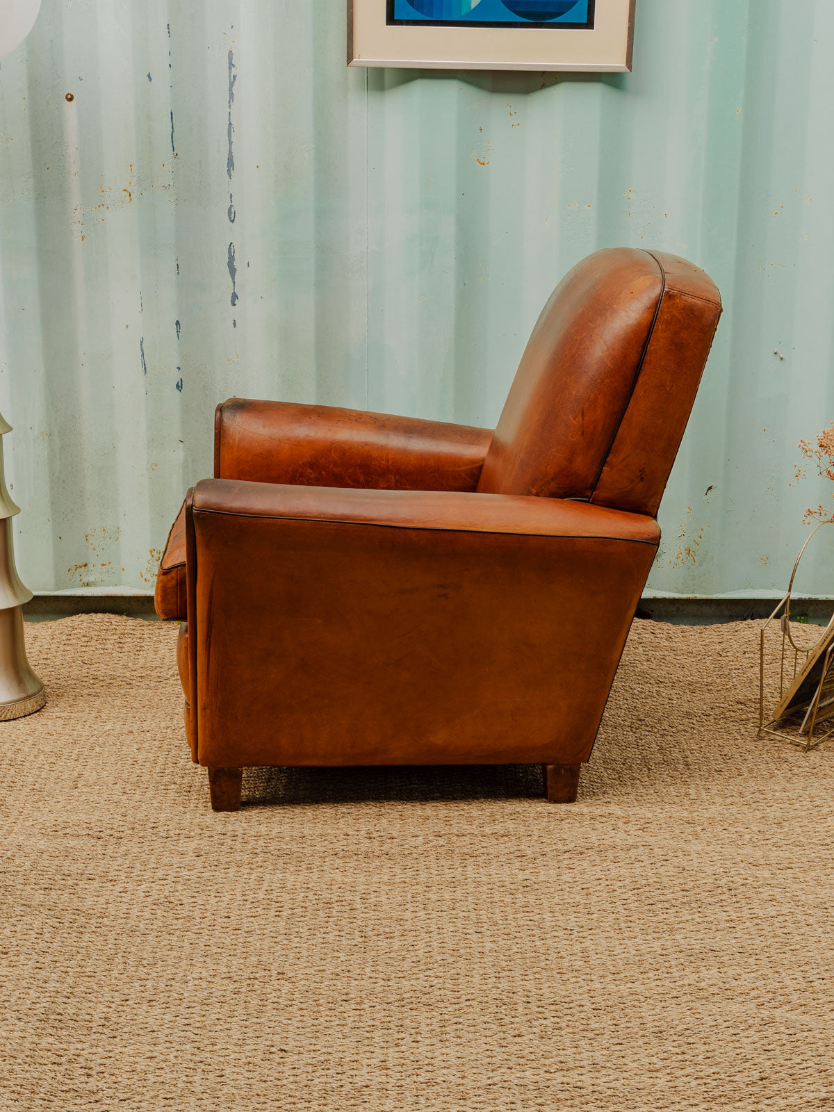 Adoptez ce fauteuil club vintage marron, au cuir patiné qui invite à la détente. Son assise enveloppante et ses proportions en font une pièce d'appoint élégante pour un salon ou un bureau, apportant chaleur et caractère. Le dossier clouté et les pieds en bois soulignent son style traditionnel avec une présence raffinée. Quelques traces d'usure et taches sur l'assise.