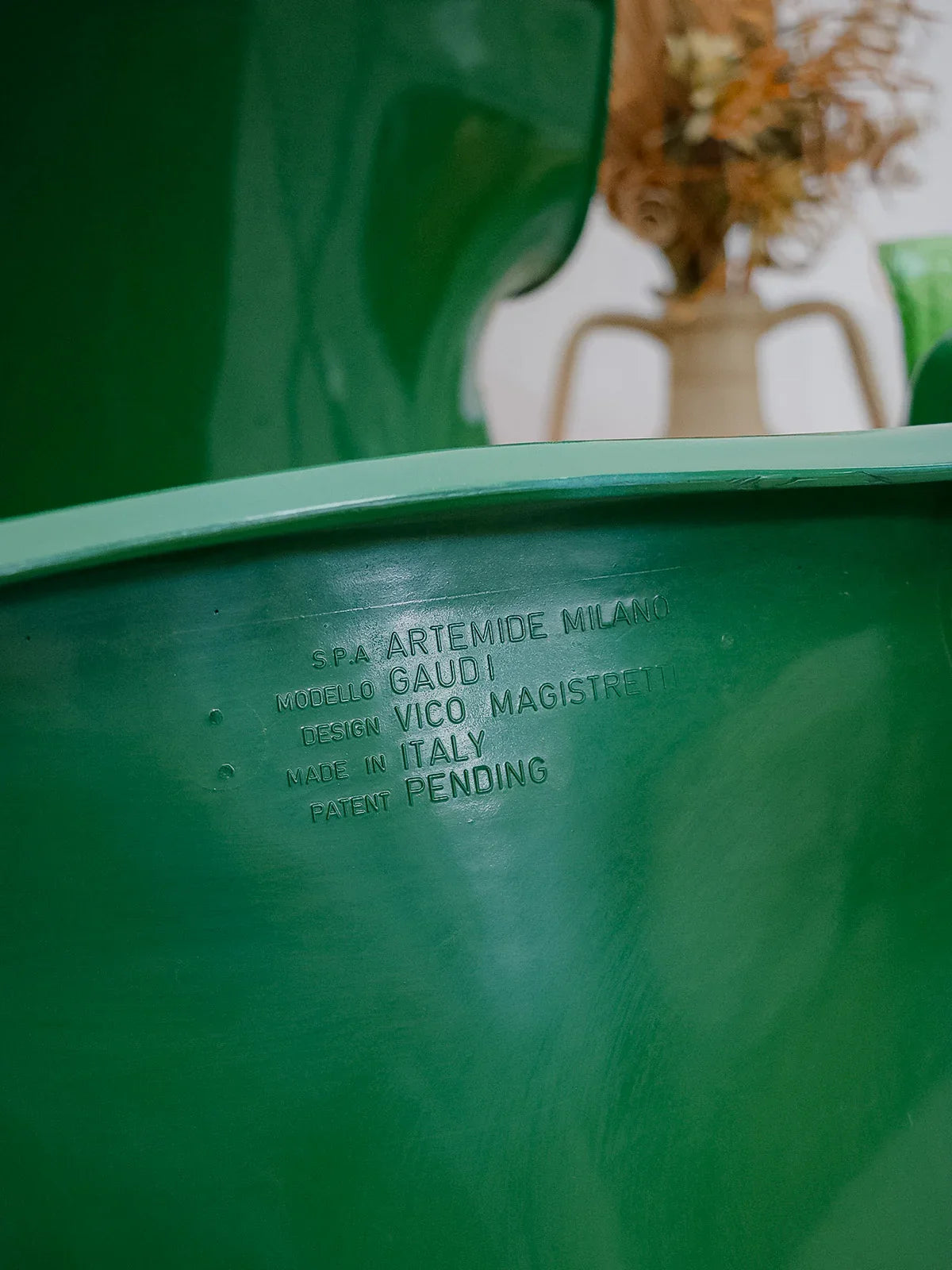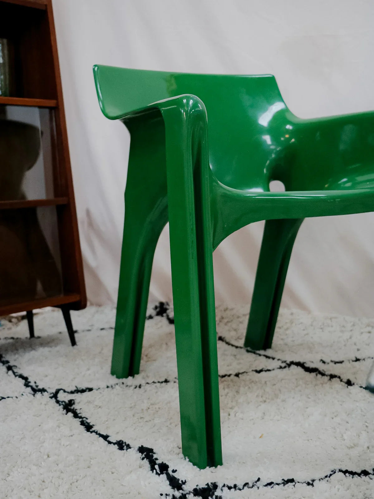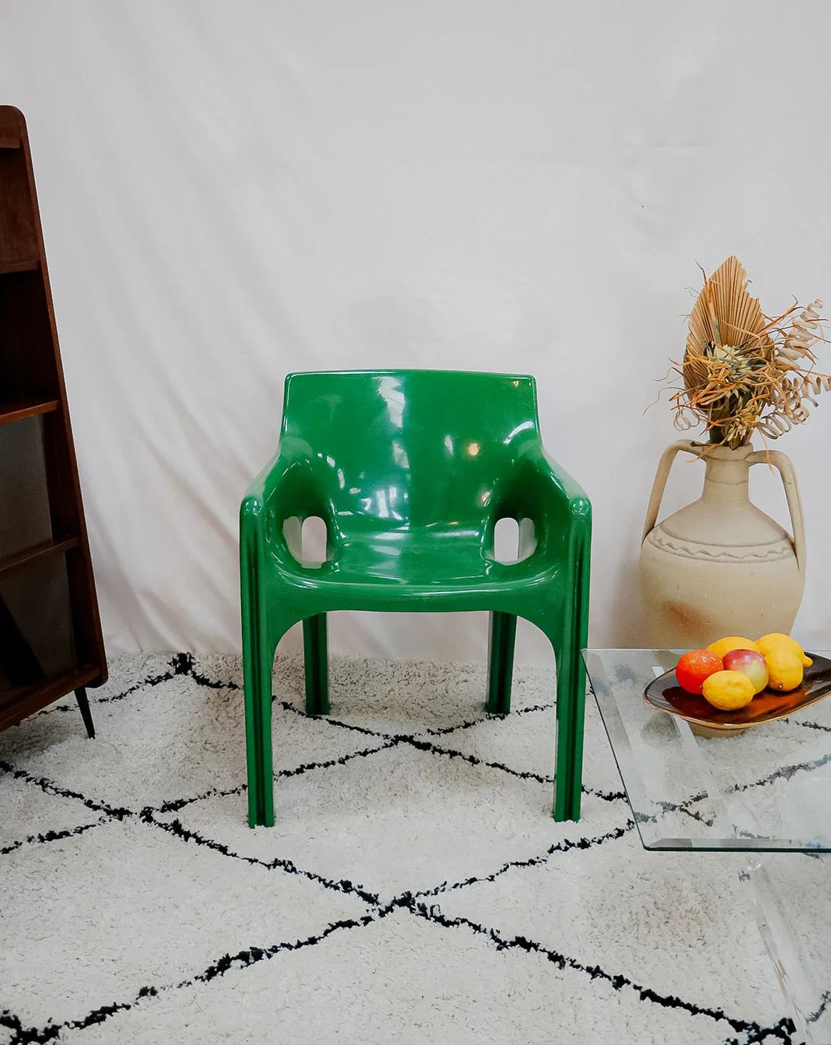 Adoptez ce fauteuil Gaudí signé Vico Magistretti, édition Artemide des années 70 en fibre de verre verte, véritable icône du design italien; leur silhouette sculpturale affirme une présence graphique tout en restant raffinée. La coque aux courbes enveloppantes et l'assise équilibrée procurent un confort immédiat, parfait pour un salon, un coin lecture ou une chambre d'appoint. Le coloris vert et la finition lisse apportent une touche vintage élégante, idéale pour ponctuer un intérieur contemporain. Petits défauts présents.