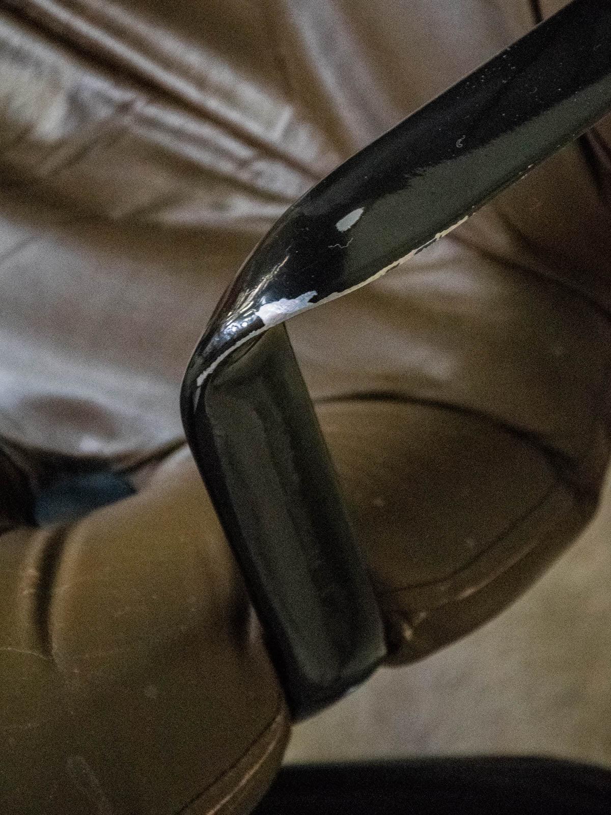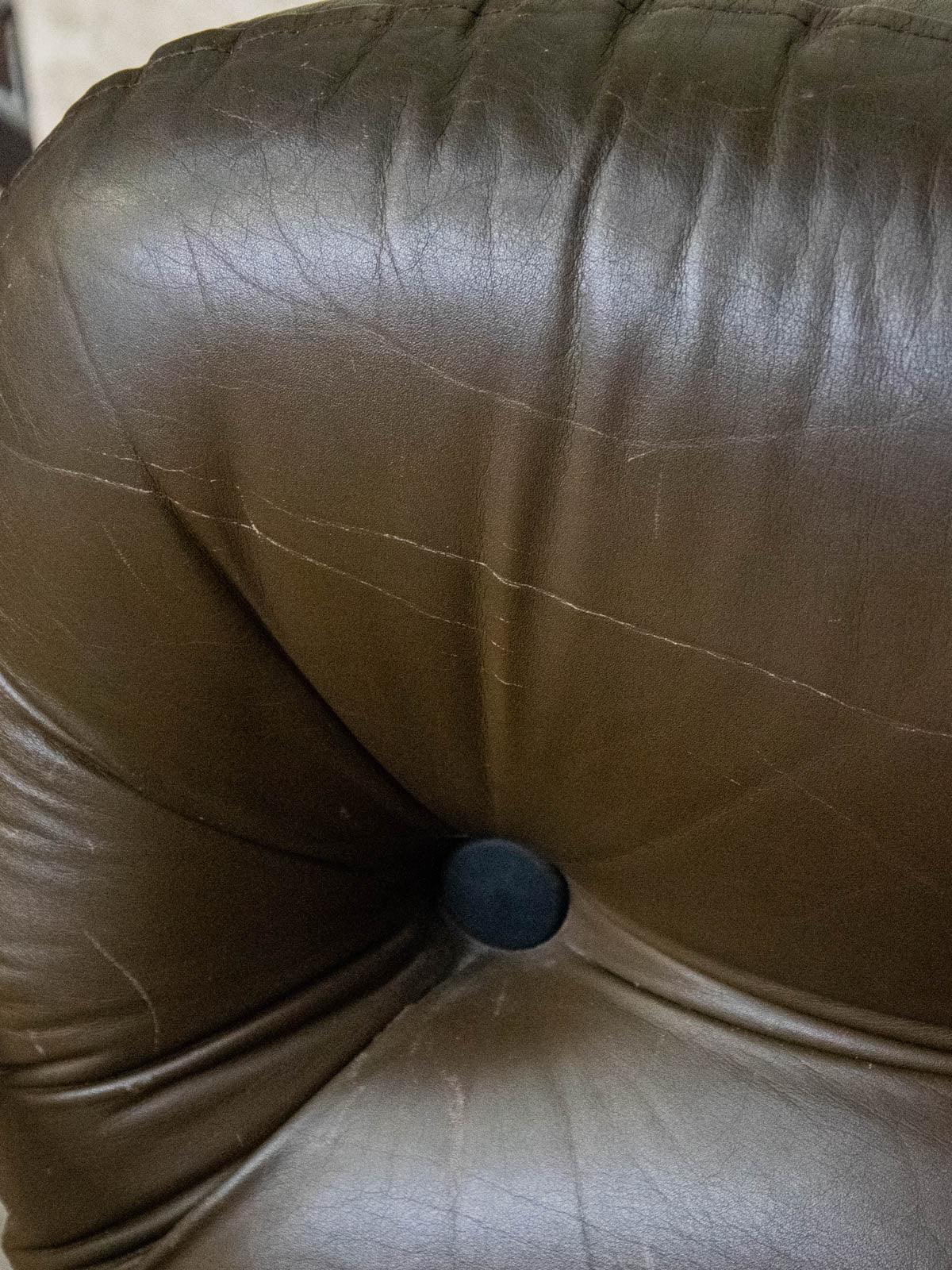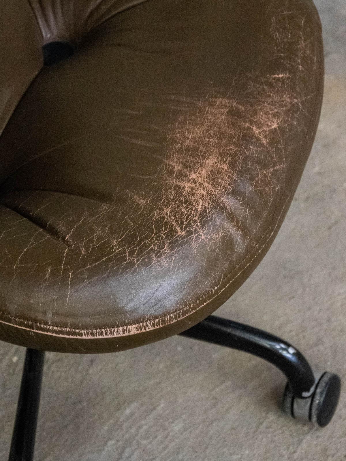 Adoptez ce fauteuil sur roulettes Knoll des années 70, imaginé par Andrew Morrison et Bruce Hannah, habillé d'un simili cuir marron ponctué d'un dossier capitonné pour une allure sophistiquée. Son armature métallique, ses accoudoirs en métal noir et ses détails créent un contraste élégant et assurent une assise robuste et mobile. Pivotant et polyvalent, il trouve sa place au bureau, dans un atelier ou un coin lecture, apportant design et caractère vintage. Traces d'usage sur l'assise et rayures présentes.