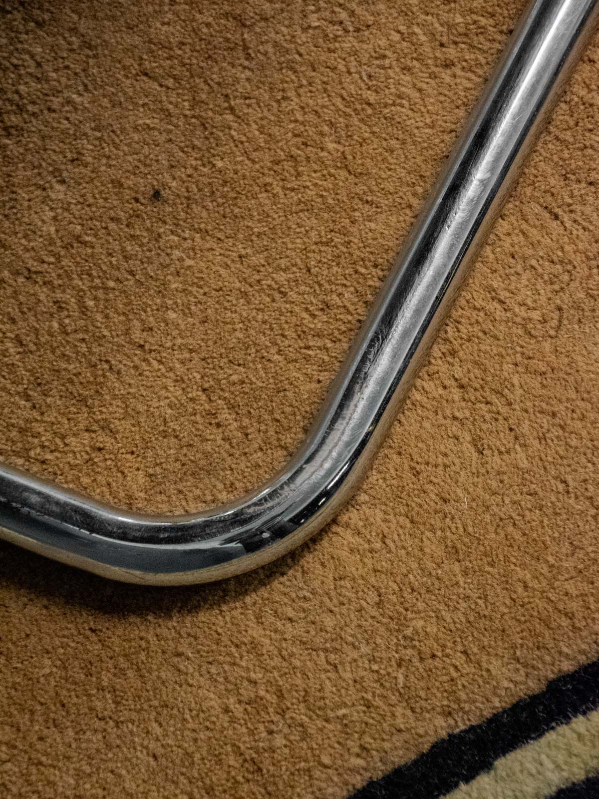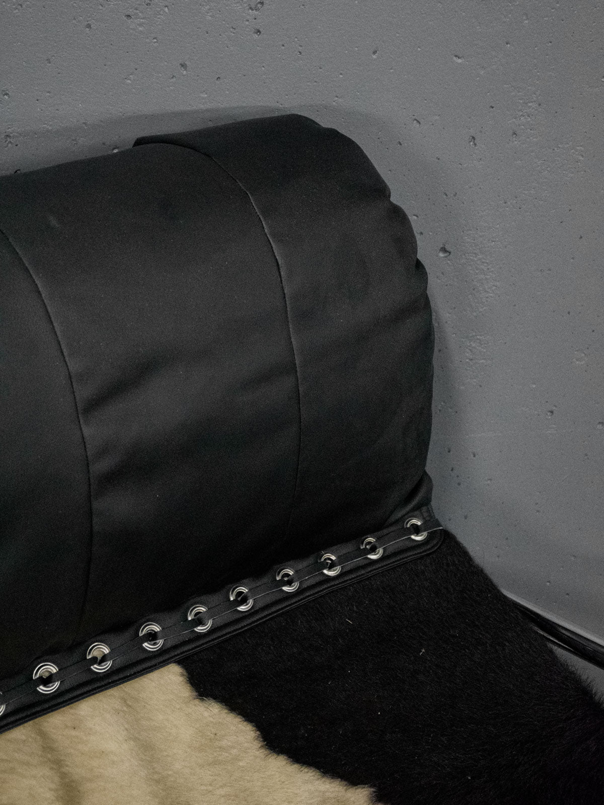 Laissez ce fauteuil iconique de l'Italie des années 70 vous inviter à la détente. Attribué à Guido Faleshini (modèle Tucroma édité par I4 Mariani), il apporte une silhouette graphique et contemporaine à votre salon. L'assise rembourrée en peau de vache d'origine et le dossier restauré en cuir synthétique noir reposent sur une structure en acier chromé, conjuguant confort et élégance industrielle, idéale pour un coin lecture ou un espace lounge. Pièce rare pleine de caractère.