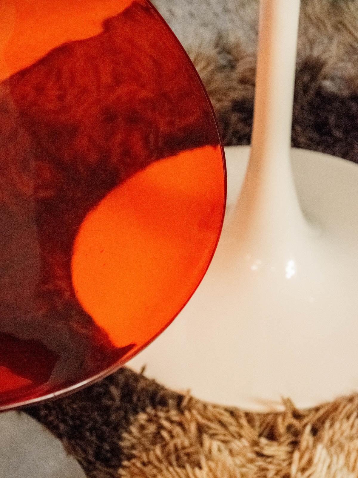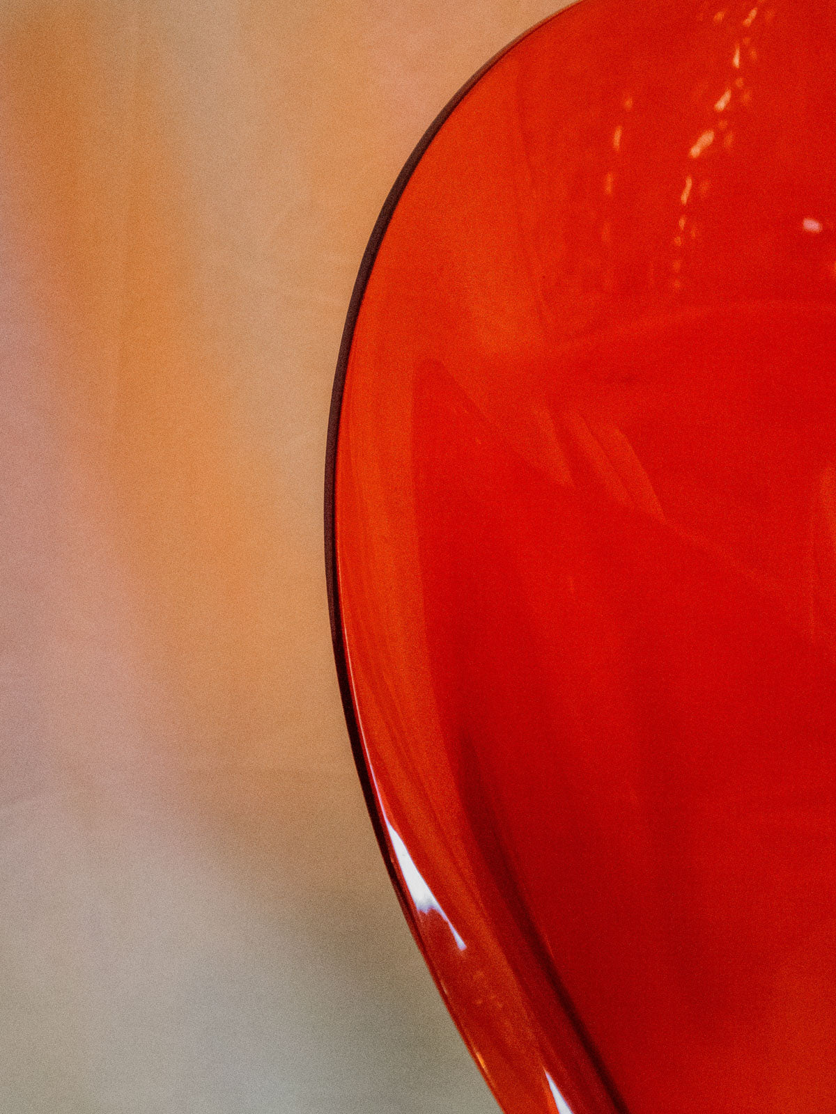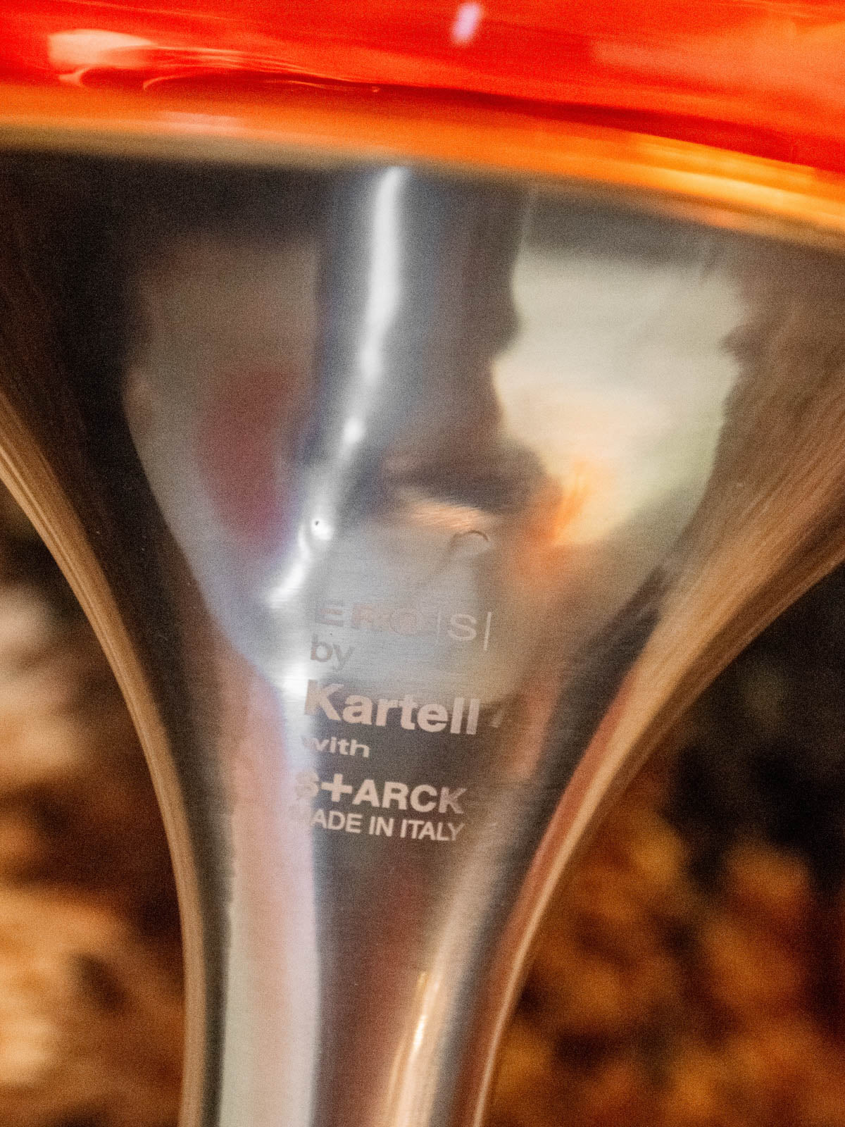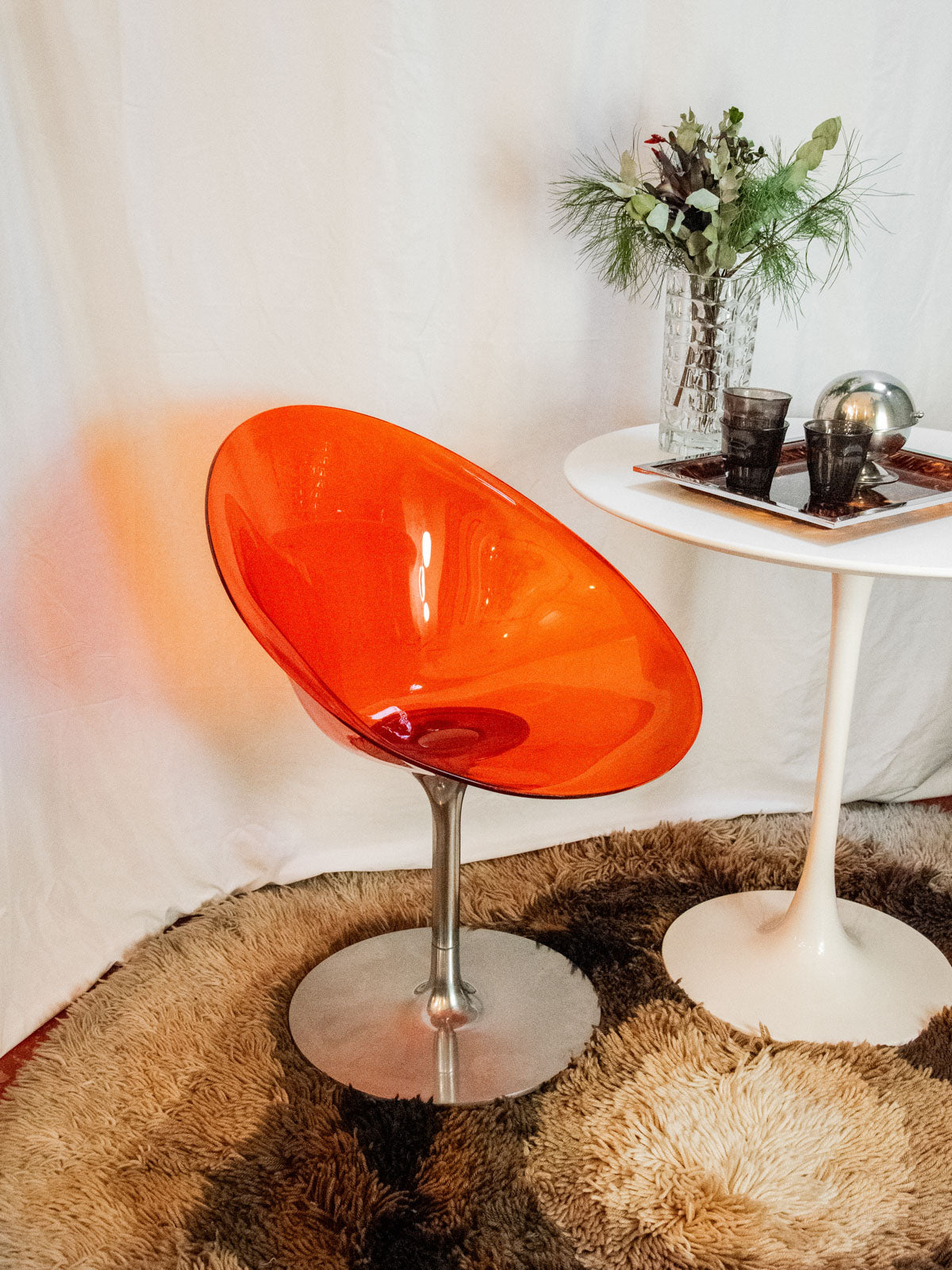 Adoptez ce fauteuil pivotant au style contemporain, dans le goût de Starck pour Kartell, en polycarbonate injecté orange monté sur un pied métallique tulipe ; sa coque moulée offre une assise enveloppante et légère qui invite confort et dynamisme dans une salle à manger, un bureau ou un coin lecture. Le mariage du plastique brillant et du piètement métallisé installe une atmosphère graphique et moderne, idéale pour une décoration audacieuse et raffinée. Micro rayures sur l'assise au niveau du plexiglas.