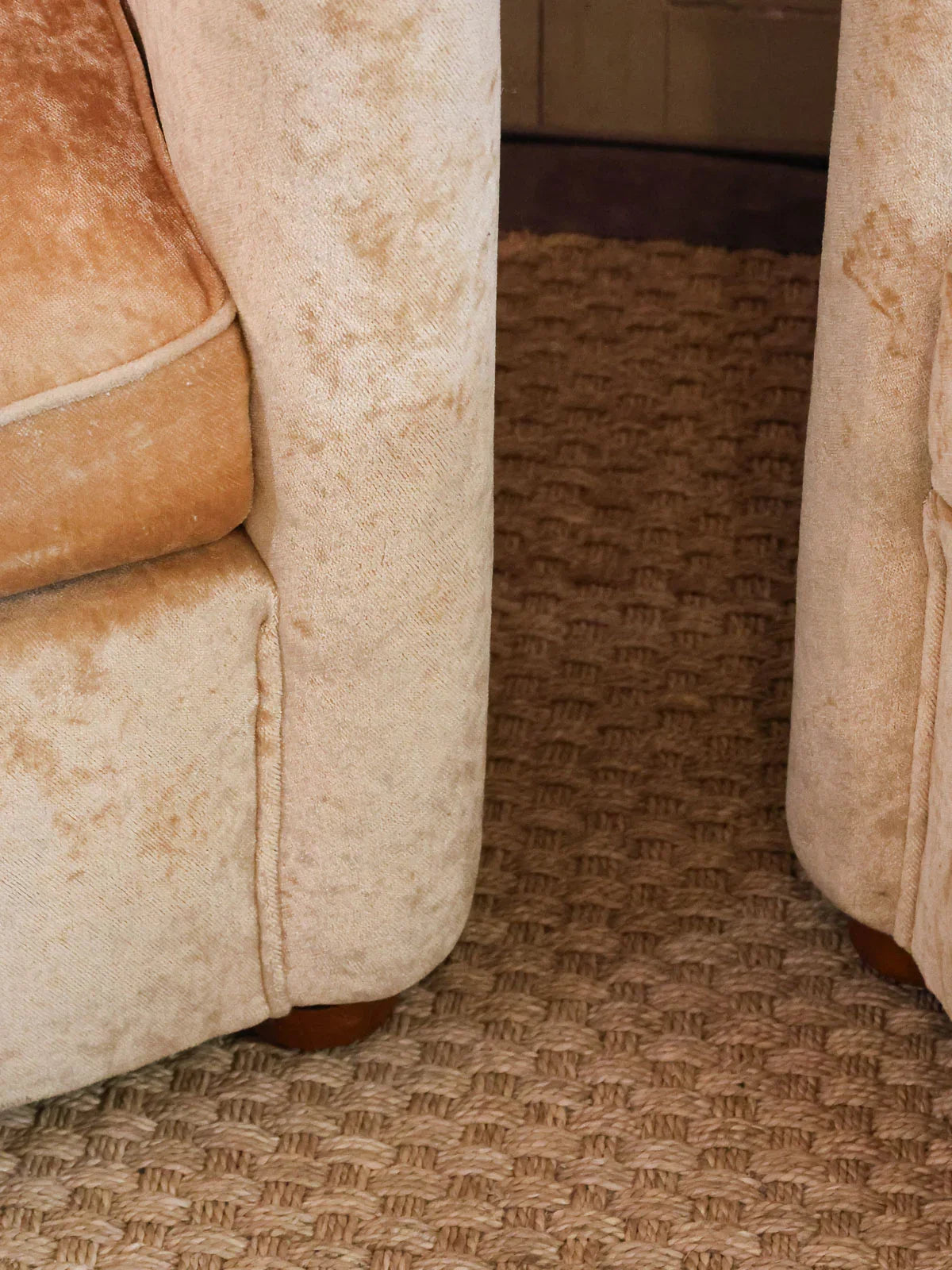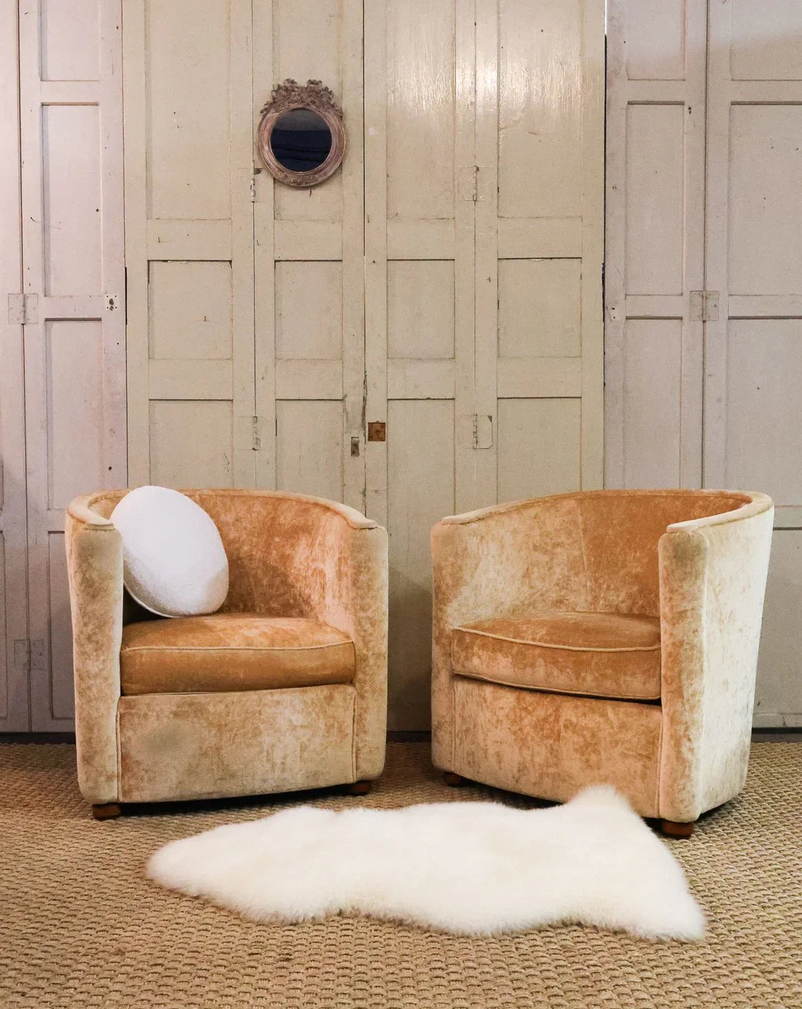 Adoptez cette paire de fauteuils en velours jaune au style Art déco. Le velours lumineux et la silhouette cabriolet leur confèrent une présence élégante et chaleureuse, parfaite pour animer un salon ou une chambre cosy. Leur assise basse et généreuse invite à la détente, tandis que des proportions compactes facilitent leur intégration dans des espaces variés. Parfaits pour créer un coin lecture chic ou rehausser une décoration vintage contemporaine.