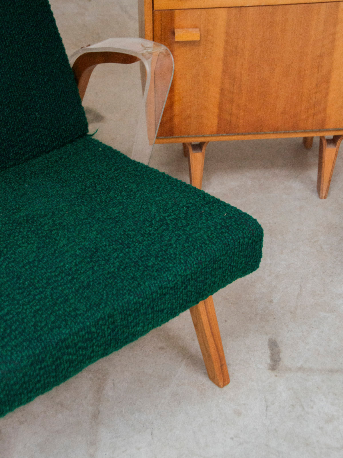 Adoptez cette paire de fauteuils au charme rétro, associant une structure en bois chaleureuse à des accotoirs protégés par des plaquettes en plexi pour un contraste contemporain. L'assise et le dossier en tissu vert offrent un confort enveloppant, complété par un petit dossier pour la tête qui facilite la lecture ou la détente. Les pieds compas affinent la silhouette et confèrent une élégance légère, idéale dans un salon ou un coin lecture. Format compact, proportionné et accueillant, il s'intègre facilement aux intérieurs actuels.