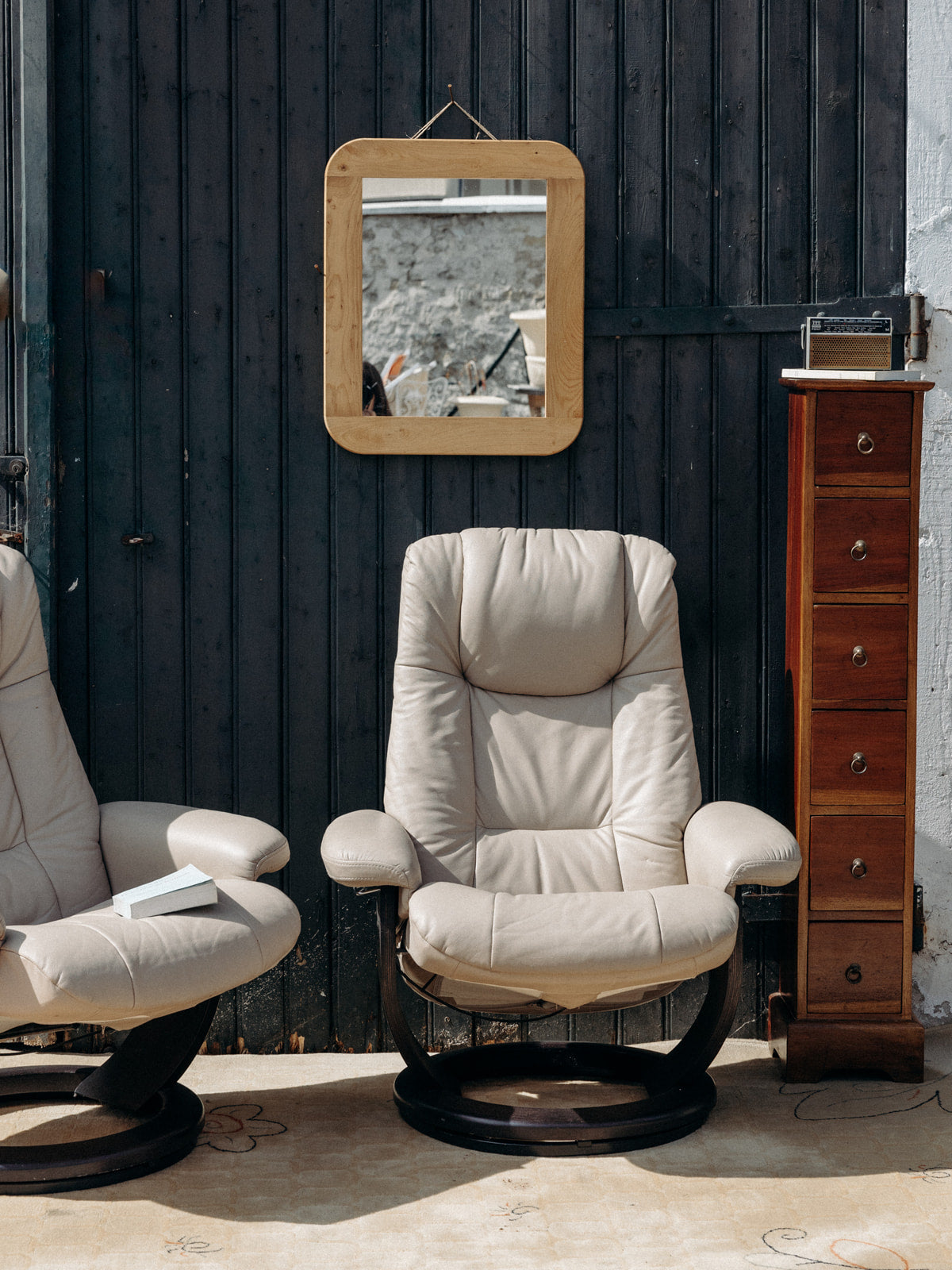 Découvrez cette paire de fauteuils en cuir beige à la ligne généreuse et enveloppante. Leur structure ronde en bois noir représente un élégant socle en anneau qui leur donne stabilité et style. Quelques traces d'usure témoignent de leur histoire sans nuire à leur charme. Leur assise confortable et ajustable en fait des pièces idéales pour un coin lecture ou un salon cosy. Apportez une touche vintage et chaleureuse à votre intérieur.