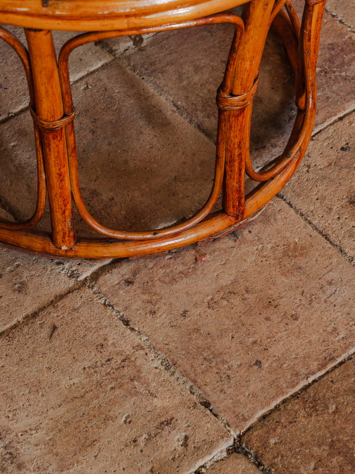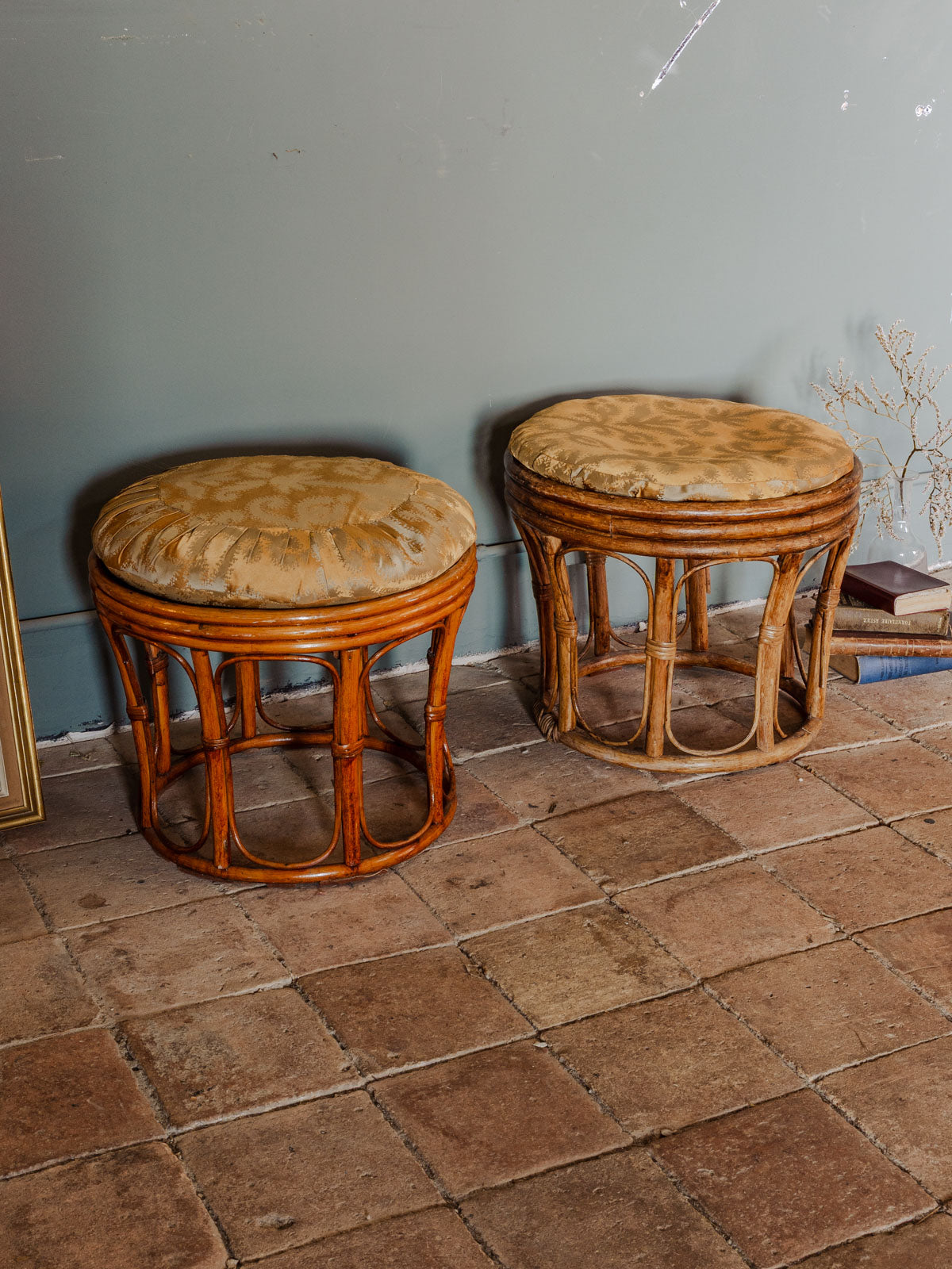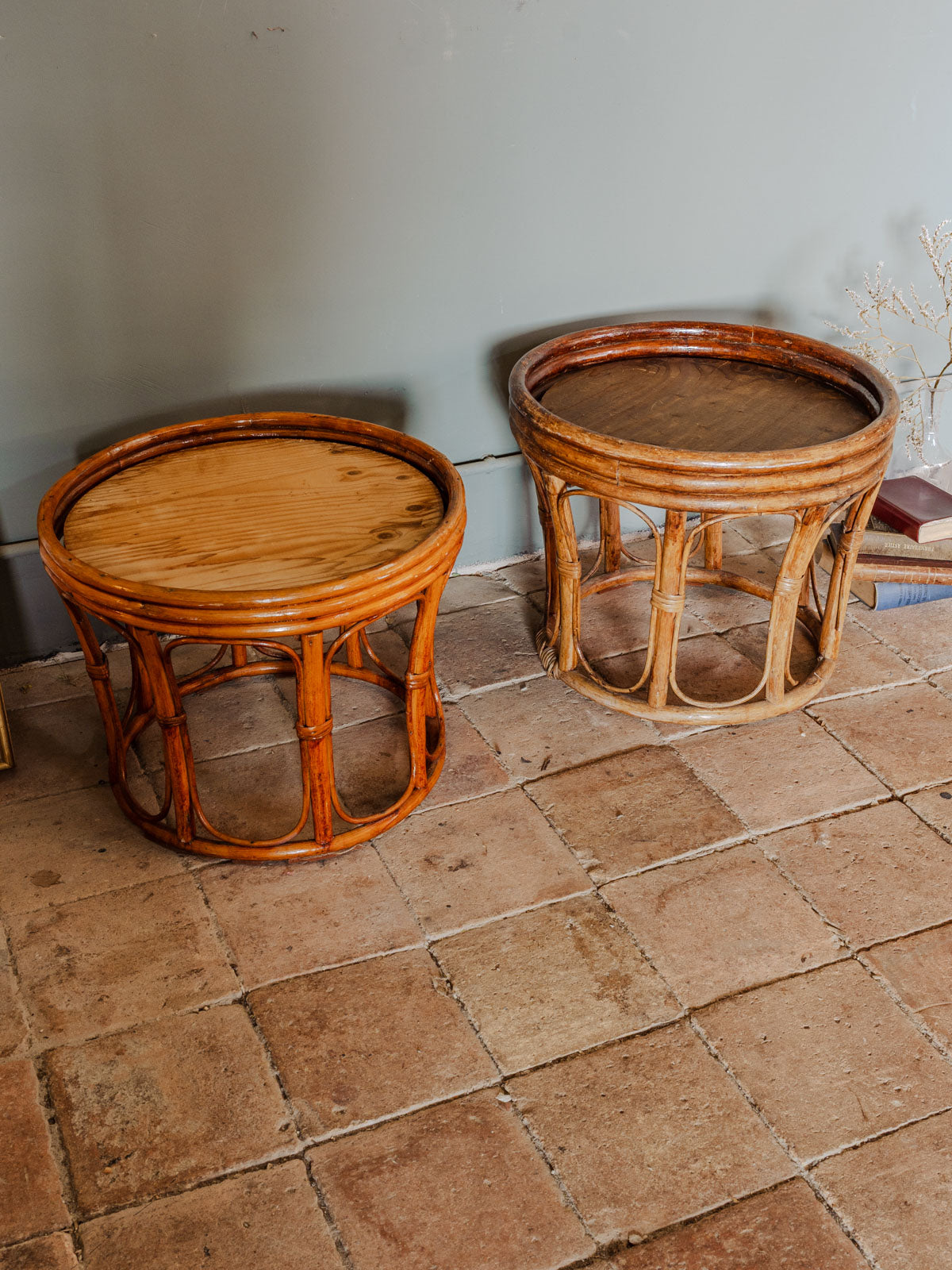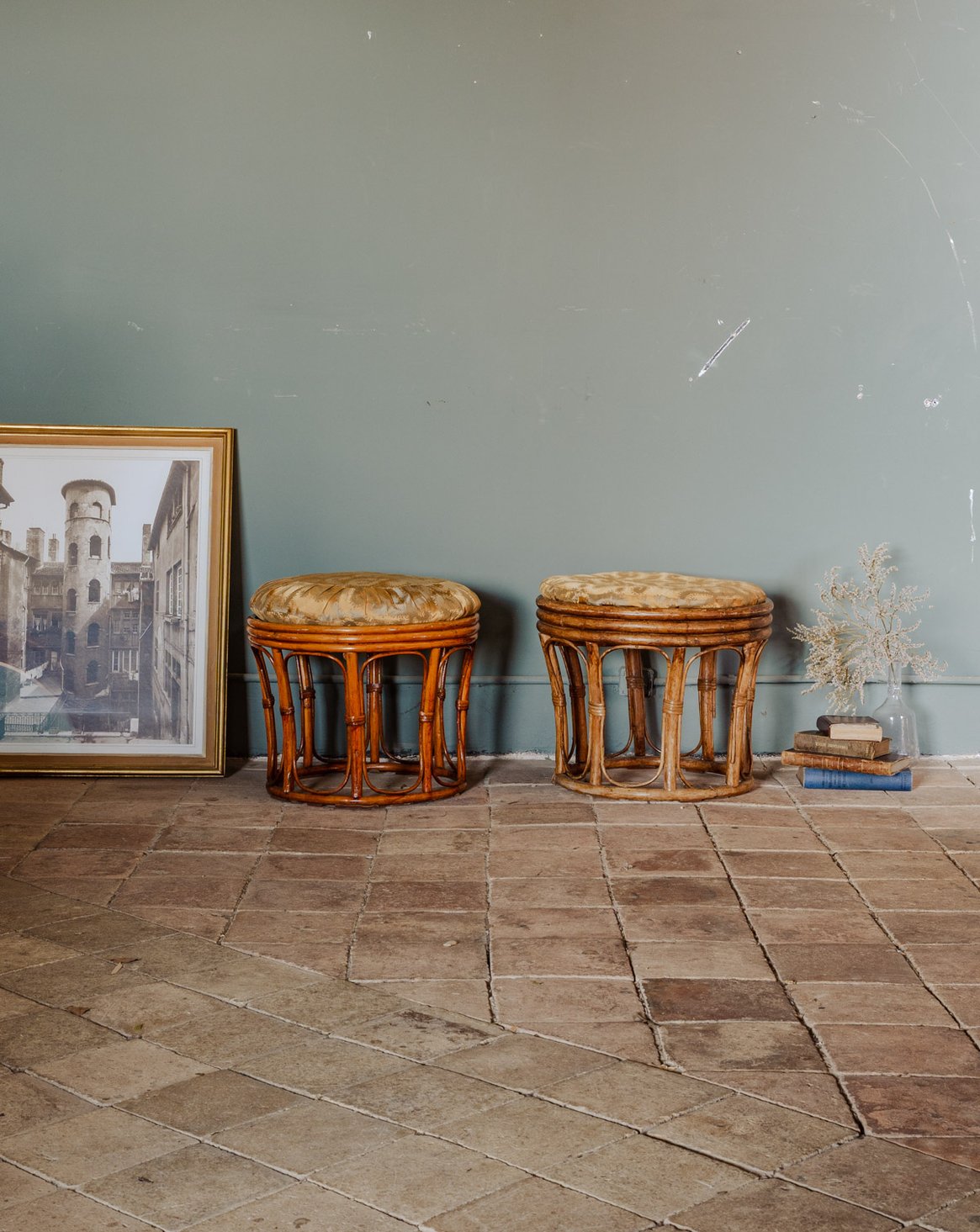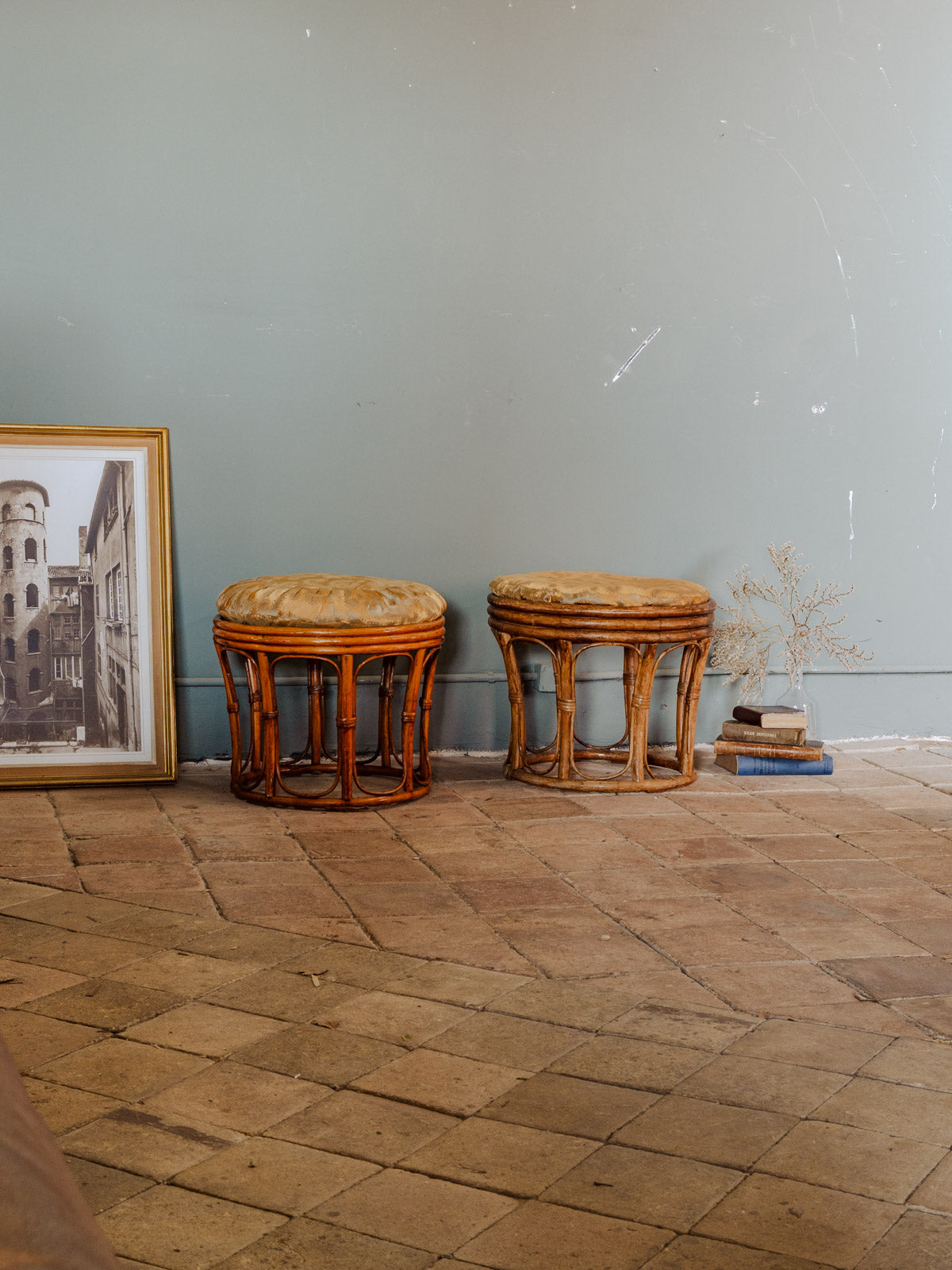 Apportez une touche naturelle et graphique avec cette paire de poufs en rotin, l'un en ton foncé l'autre plus clair, coiffés de coussins aux motifs légèrement brillants qui captent la lumière. Bas, ils se glissent autour d'un salon ou sur une terrasse pour un siège d'appoint, un repose-pieds ou pour apporter de la matière dans une chambre, créant une ambiance chaleureuse et bohème, à la fois élégante et décontractée. Quelques traces du temps présentes.