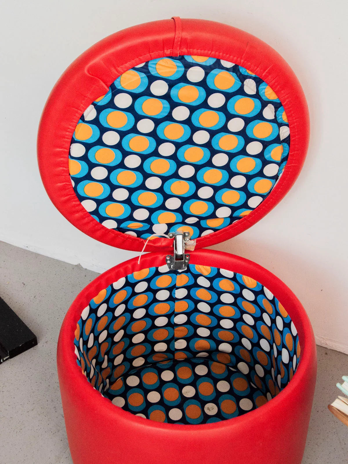 Invitez ce pouf psychédélique des années 70, habillé de motifs pop bleu, orange et blanc et surmonté d'un plateau arboré noir et blanc rehaussé d'un cœur orange. Son revêtement textile coloré et sa poignée ronde noire lui confèrent un caractère rétro-chic, tandis que son coffre intérieur offre un volume discret pour ranger plaids ou magazines. Compact et convivial, il se prête aussi bien à l'assise d'appoint qu'à la touche déco d'un salon au charme vintage.