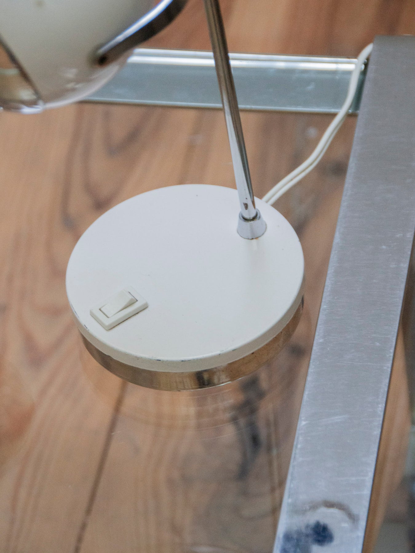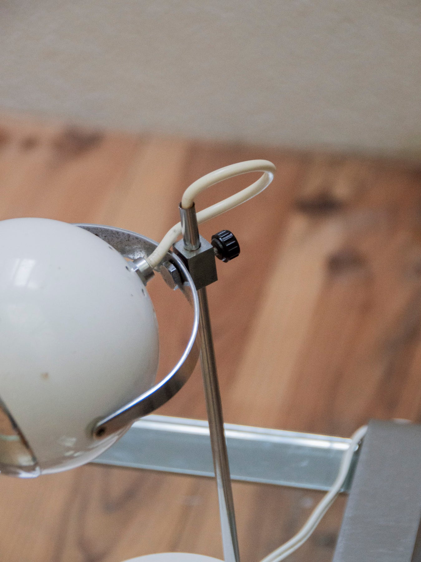 Ajoutez une touche rétro avec cette lampe à poser Eye Ball des années 70, en métal et plastique au design compact et graphique. Son pied rond et son bras en métal soutiennent un abat-jour rond qui diffuse une lumière enveloppante, tandis que le petit interrupteur facilite son usage au chevet, sur un bureau ou une console. Sa taille contenue la rend parfaite pour les espaces urbains où chaque objet compte et son style apporte une note vintage élégante. Légères traces du temps présentes.