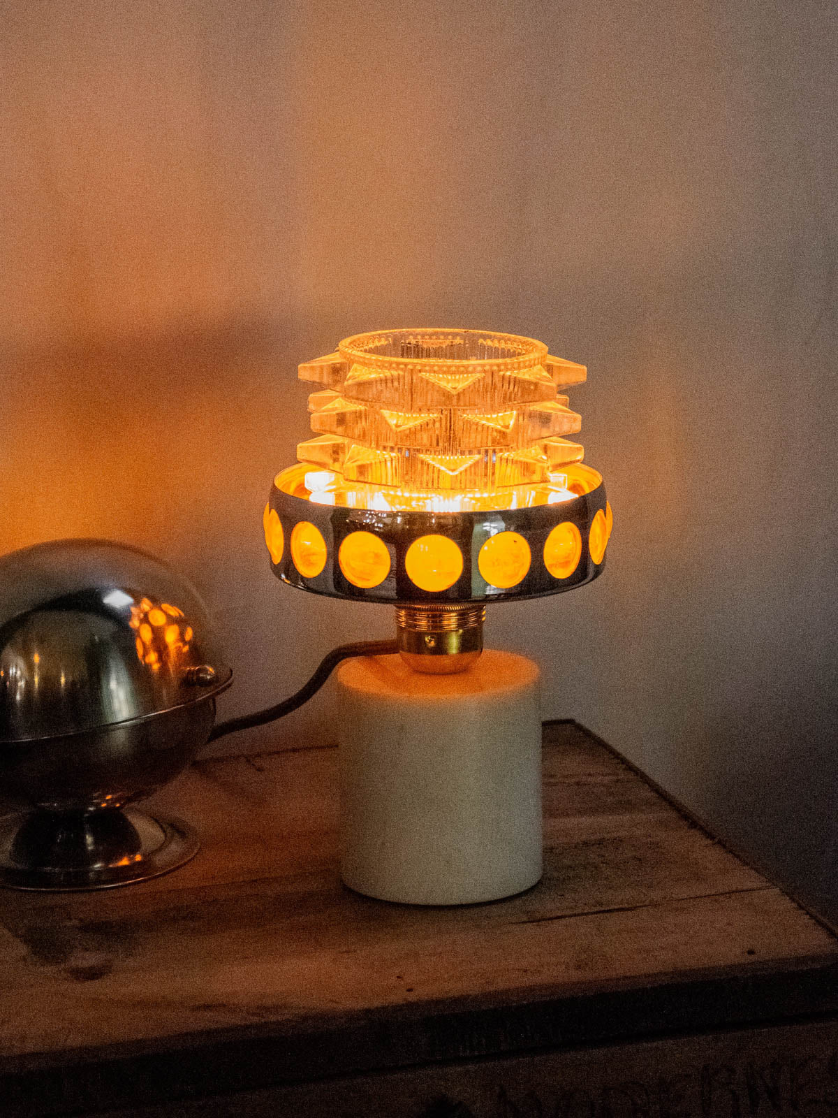 Ajoutez une lampe au piètement en marbre et à la structure en verre ornée de ronds jaunes, qui apporte une touche graphique et délicate à votre intérieur. Le marbre assure une base stable tandis que le verre diffuse une lumière douce, idéale en lampe de chevet ou sur une table d'appoint. Le cordon neuf couleur kaki introduit une note contemporaine et coordonnée, facile à intégrer dans une décoration sobre et chaleureuse. Un bel équilibre entre matériau noble et motif délicat.