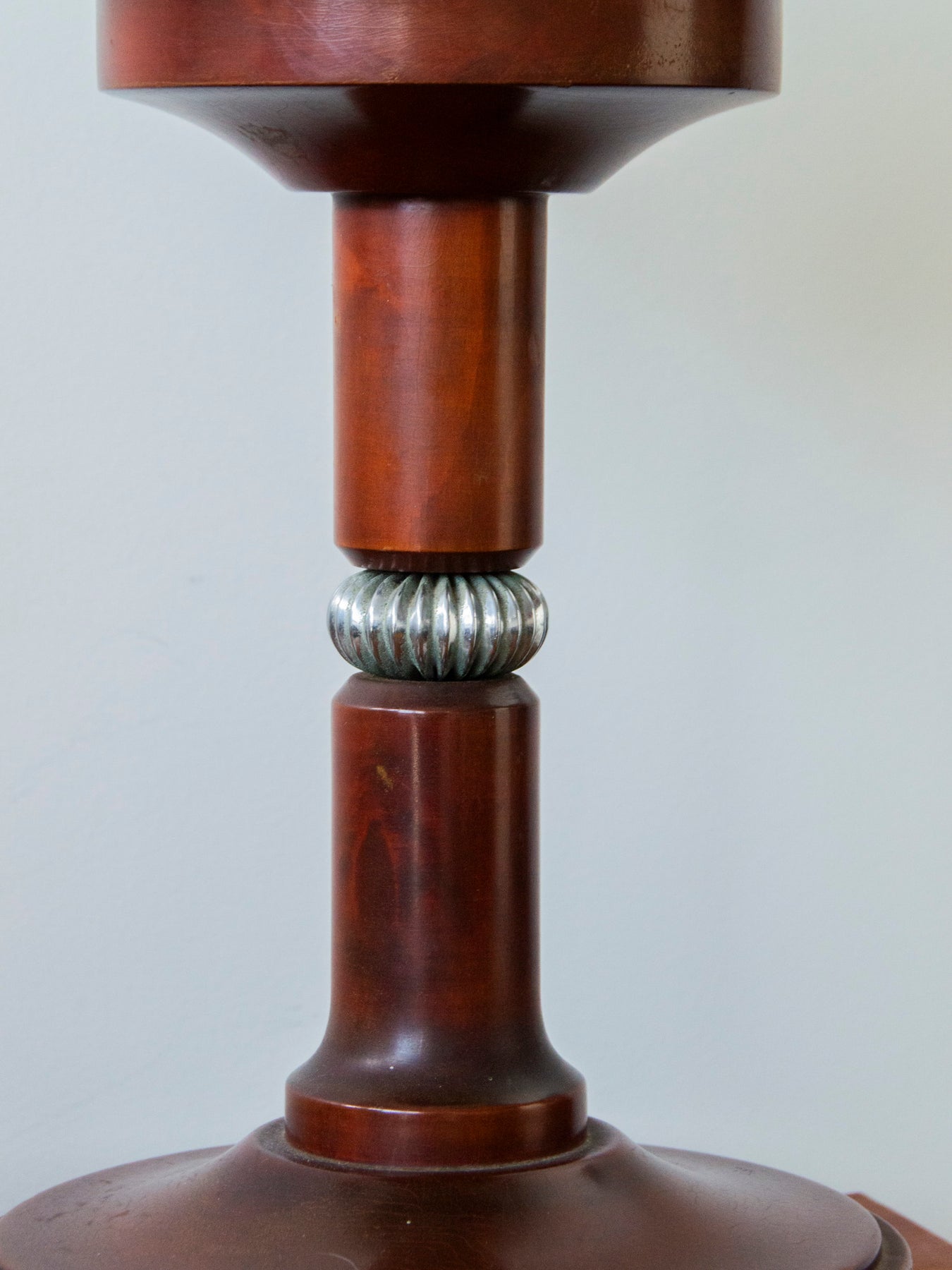 Sublimez votre intérieur avec cette lampe champignon des années 1970 en teck massif et opaline, pensée pour poser une présence élégante sur une table ou un bureau; sa ligne pure et les matériaux nobles — bois, verre et métal sculpté au centre du pied — lui donnent un caractère à la fois sobre et chaleureux. L'opaline diffuse une lumière douce, idéale pour un coin lecture ou pour créer une atmosphère feutrée. Très léger manque sur l'arête du pied, à peine visible.