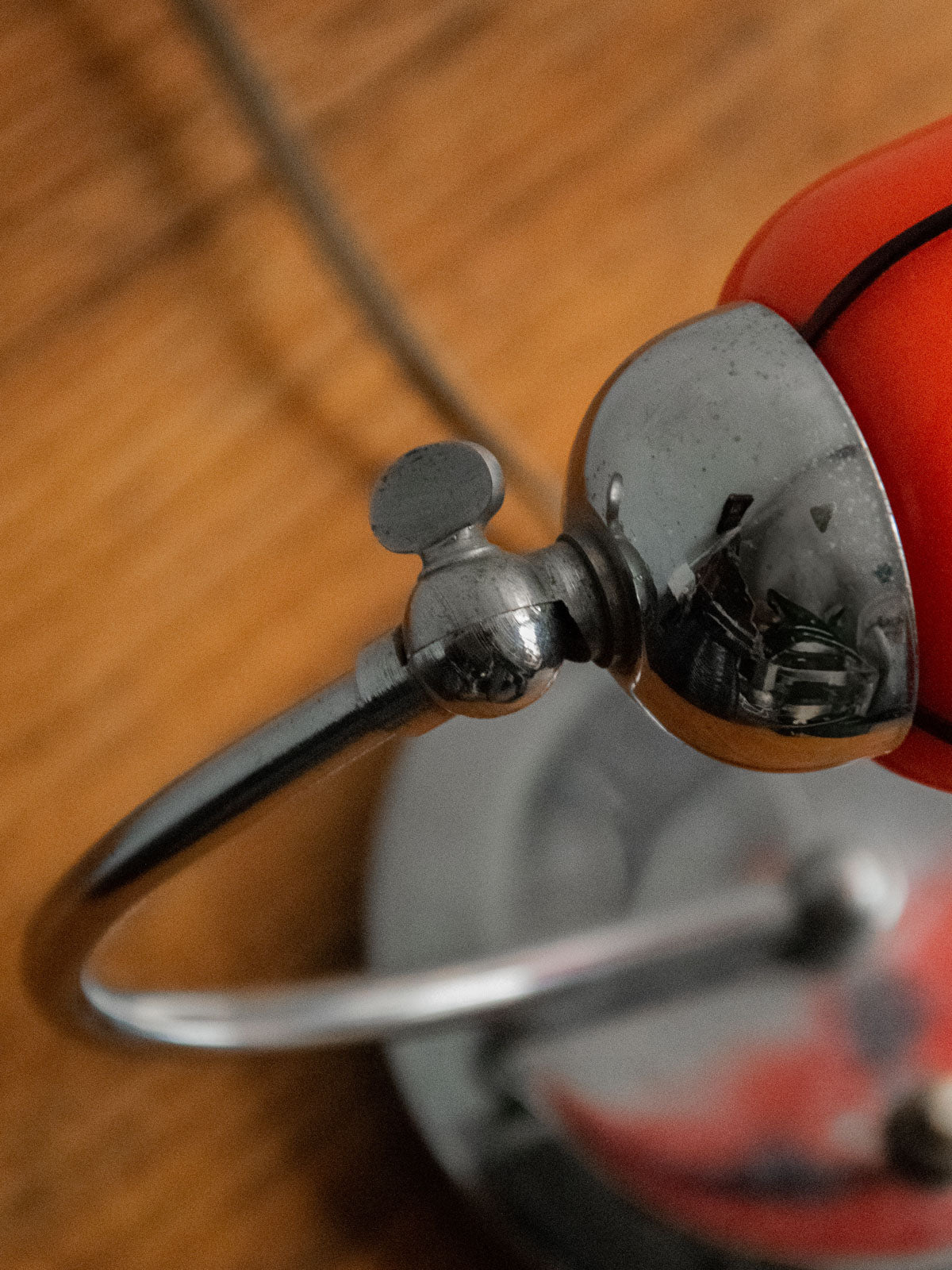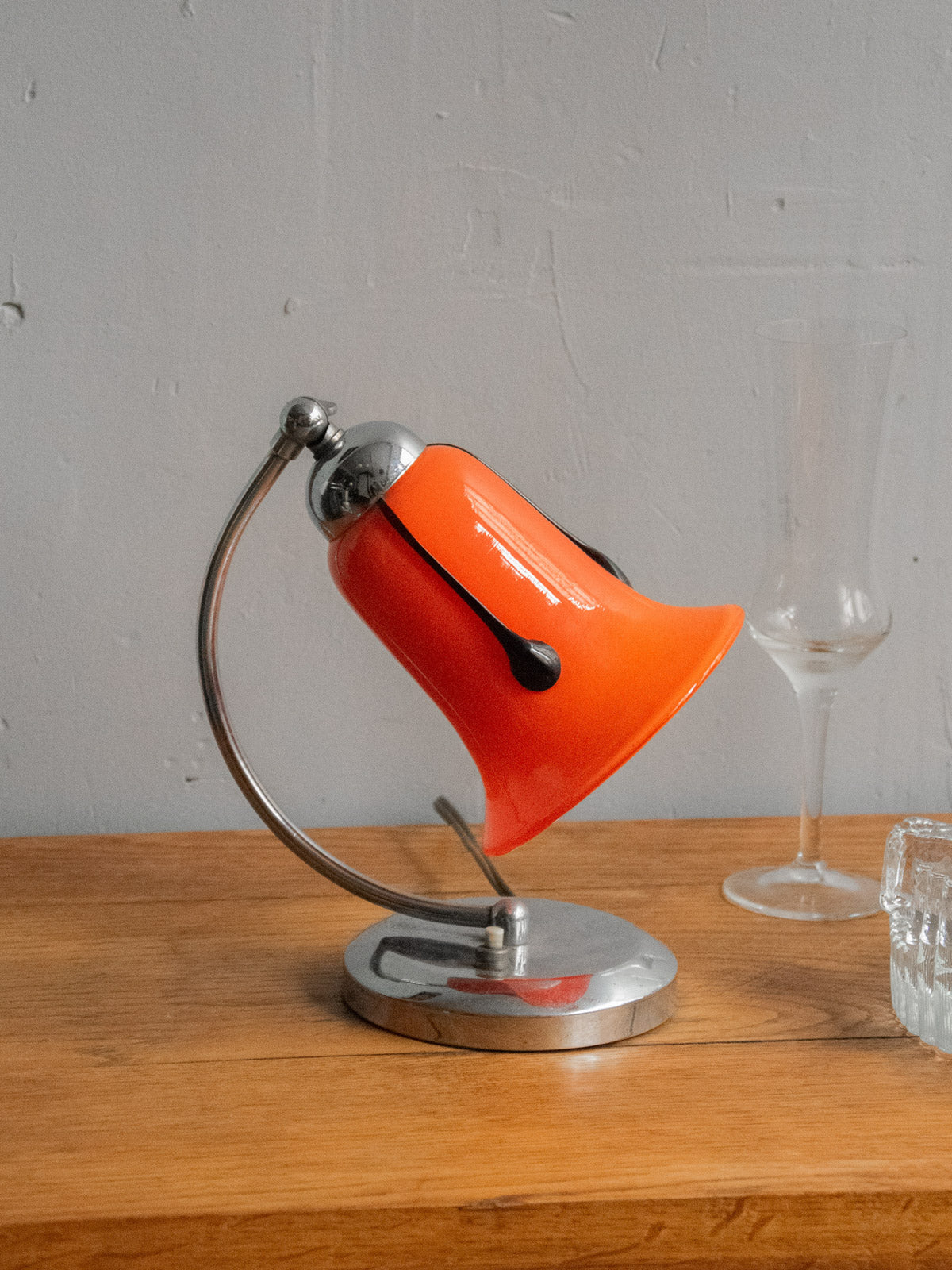 Ajoutez une touche lumineuse et chaleureuse avec cette lampe compacte au pied en métal et globe en verre orange inclinable. Son design épuré mêle allure moderne et notes rétro, tandis que le bouton-poussoir intégré au socle facilite l’usage quotidien. Compatible avec une ampoule E27, elle diffuse une lumière douce idéale pour un chevet, un bureau ou un coin lecture. Sa présence discrète et ses proportions étudiées structurent l’ambiance sans imposer.
