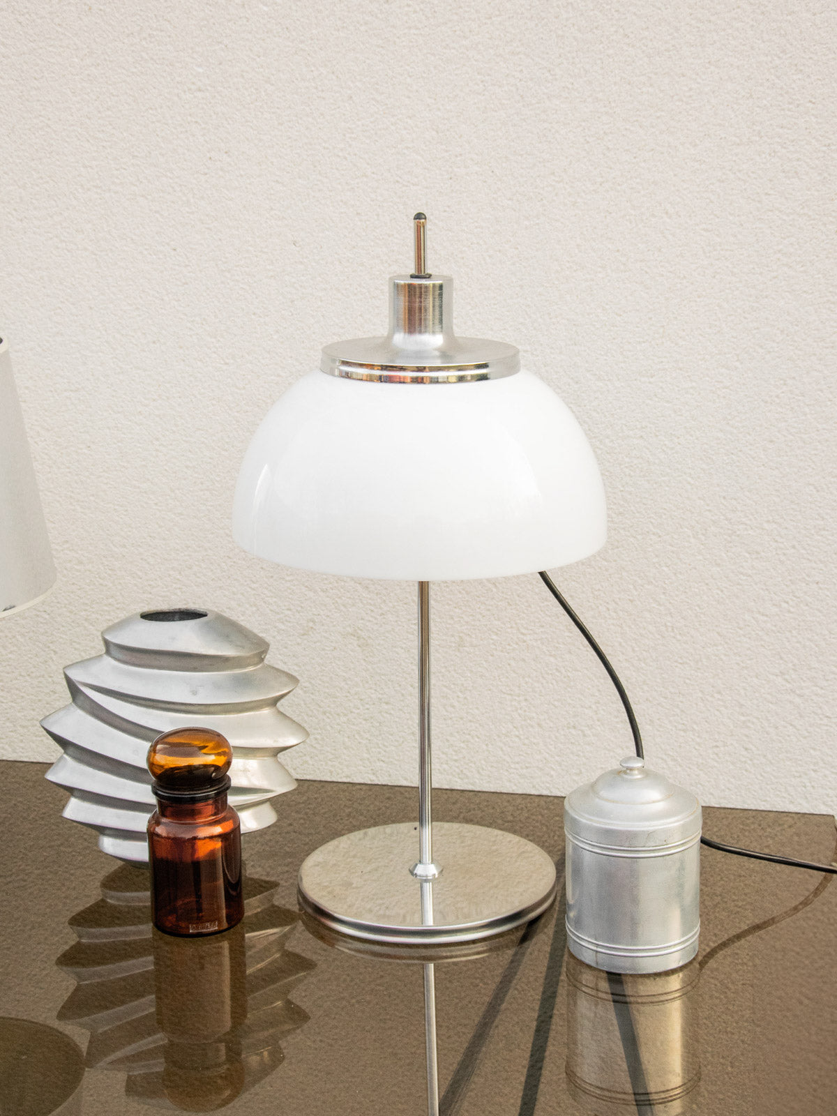 Découvrez cette lampe attribuée à Harvey Guzzini (modèle Faro), icône vintage des années 70 et du design space age. Elle associa une structure en métal chromé à un diffuseur en acrylique opalin. Ses lignes épurées et sa hauteur réglable offrent un éclairage doux et diffus, parfait pour instaurer une ambiance chaleureuse dans un salon, une chambre ou un bureau contemporain. En très bon état de fonctionnement, elle apporte une touche rétro maîtrisée. Quelques légères traces d'usage présentes.
