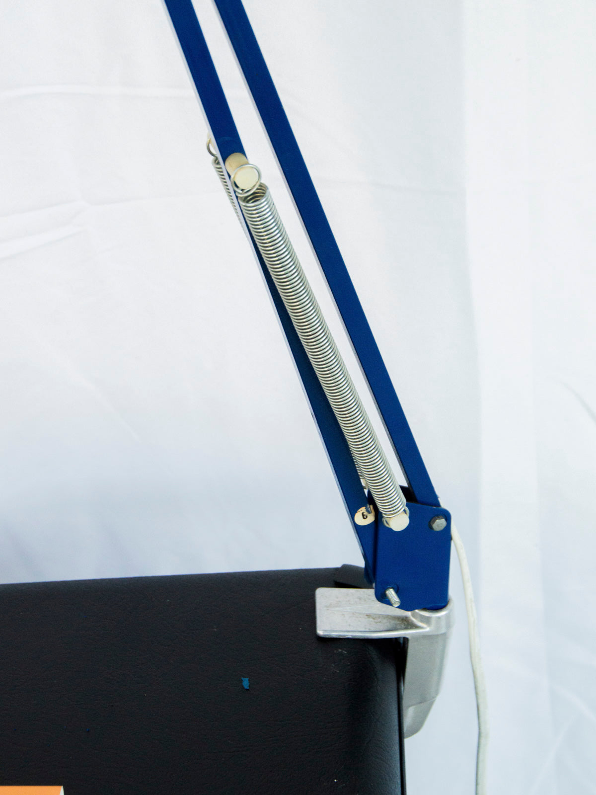 Apportez une touche industrielle avec cette lampe de bureau en métal bleu, associant fer patiné et un abat-jour en verre pour un rendu sobre et élégant. Sa structure articulée à ressorts se fixe au plateau et se règle en hauteur comme en largeur pour offrir un éclairage précis, idéale au bureau ou en coin lecture, tout en apportant une note d'atelier contemporaine. Légères traces du temps présentes.