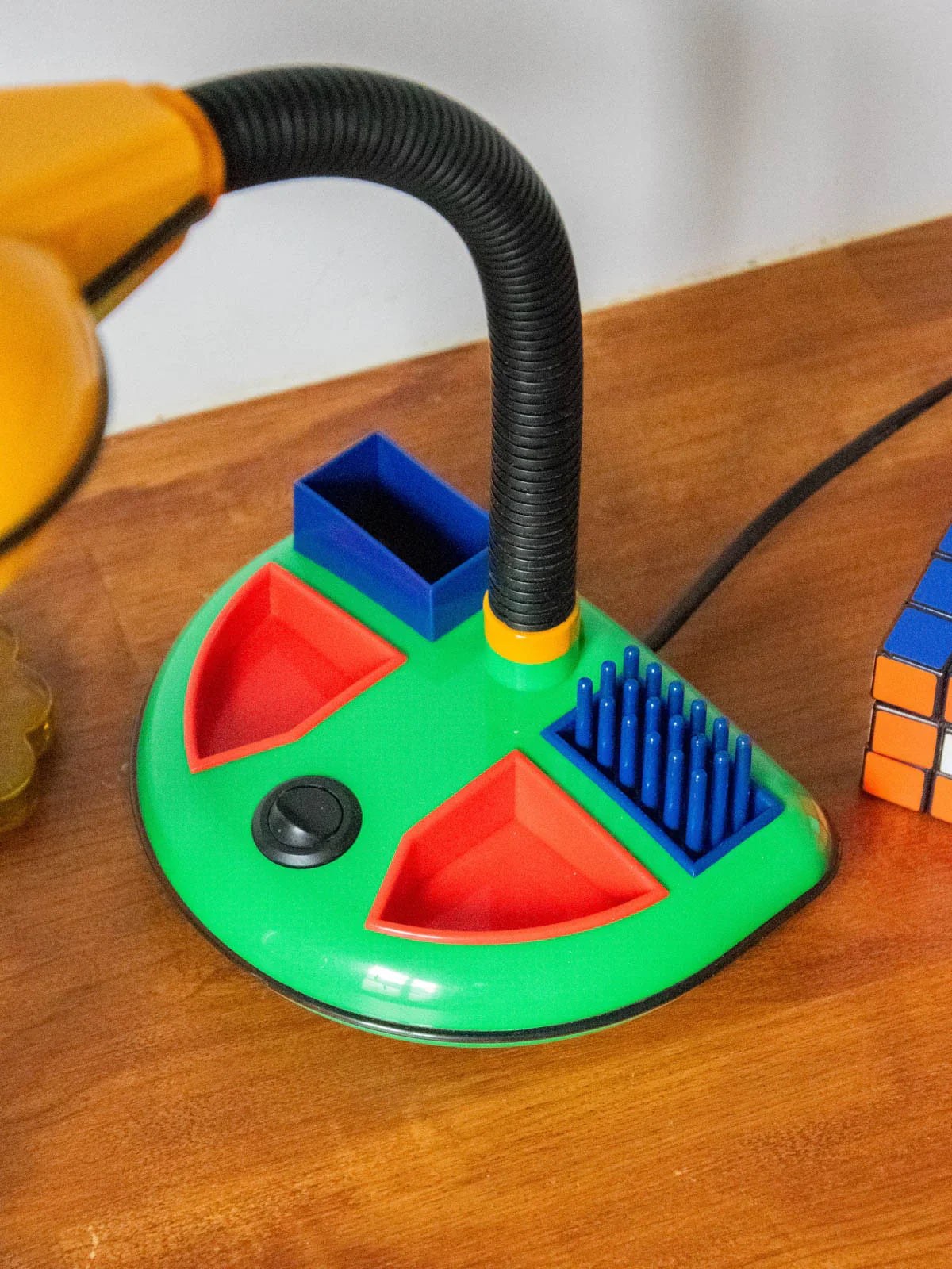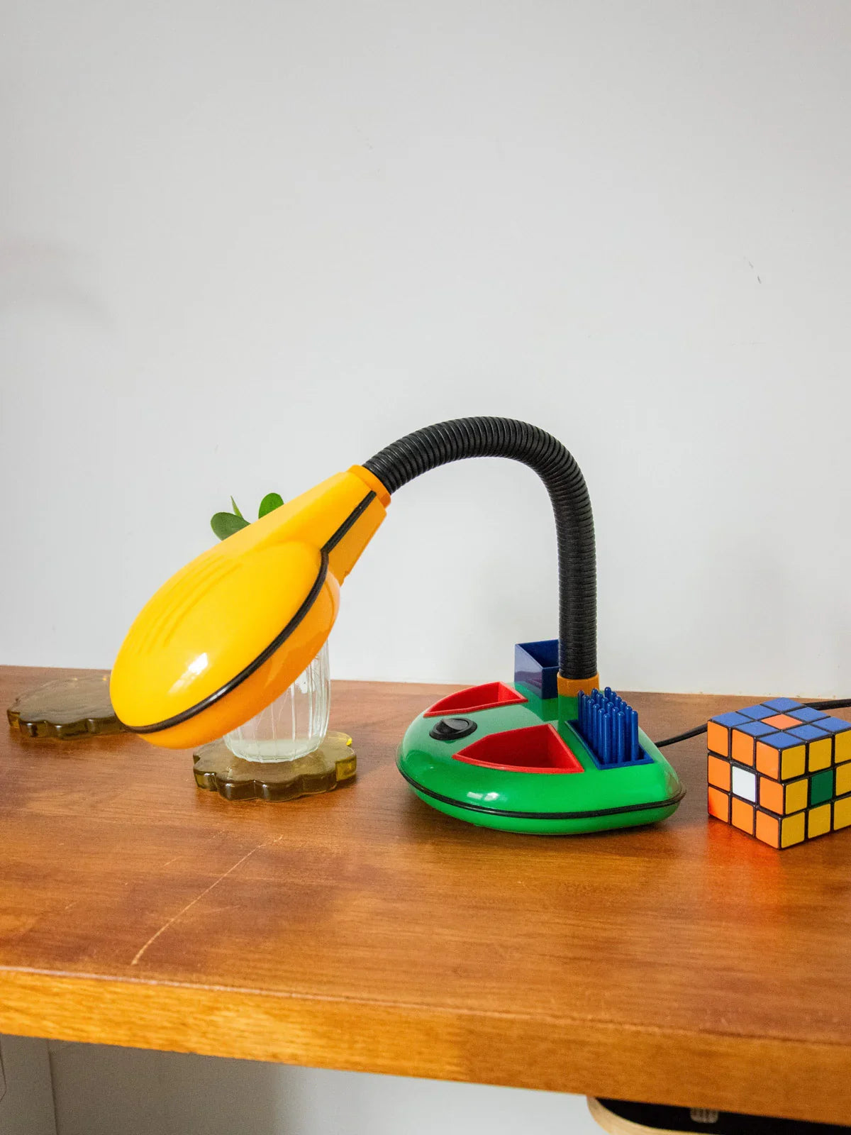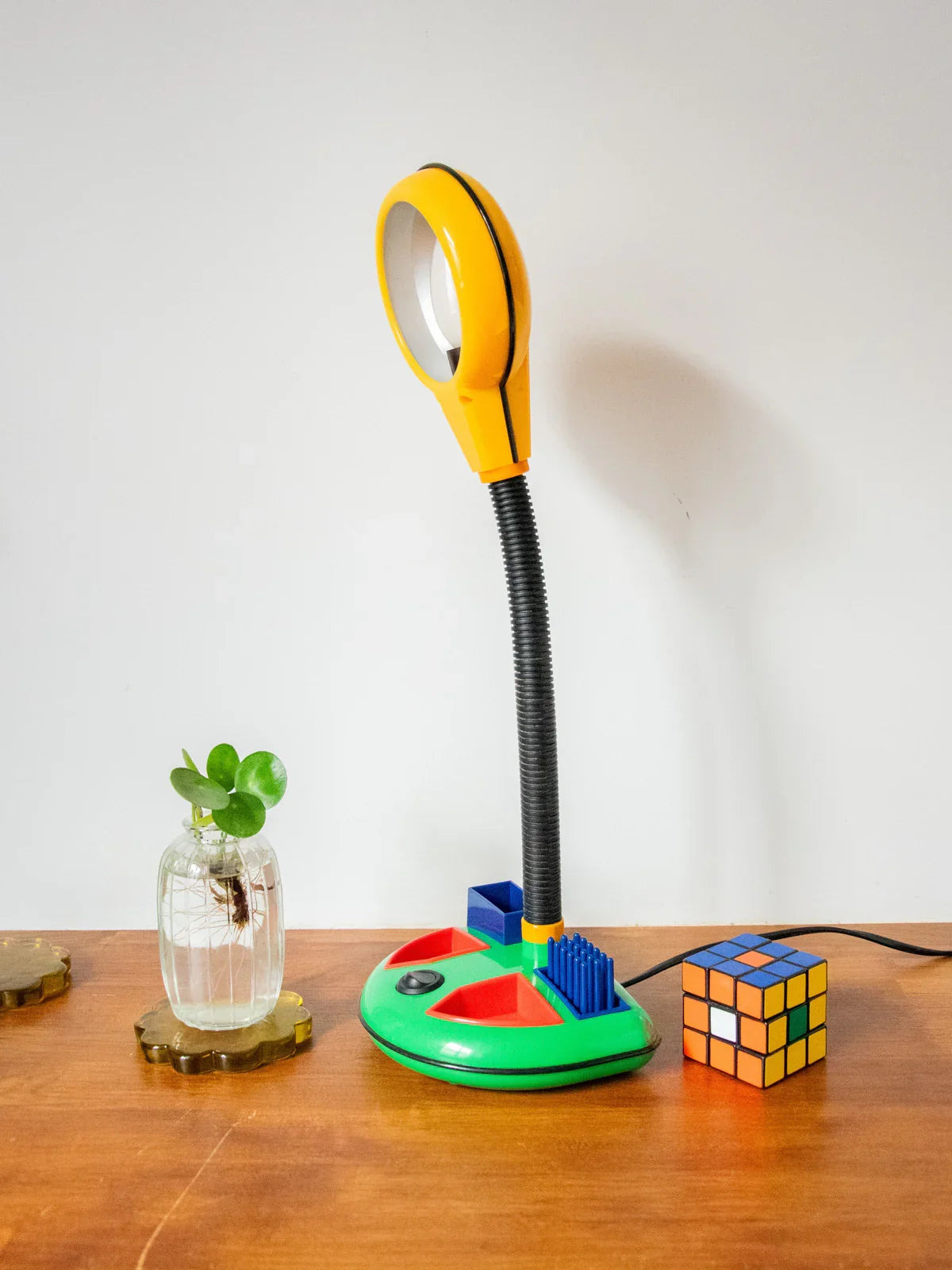 Découvrez cette lampe de bureau attribuée au designer japonais Kyoji Tanaka, en plastique, qui marie minimalisme et élégance ludique dans l'esprit Memphis des années 1980. Sa base multifonction fait office d'organiseur, idéale pour un bureau compact ou une table de chevet, apportant une présence sculpturale sans encombrer l'espace. Le design graphique diffuse une ambiance contemporaine et chaleureuse, prête à ponctuer un intérieur avec subtilité. Son ampoule E14 flamme opaque est fournie.