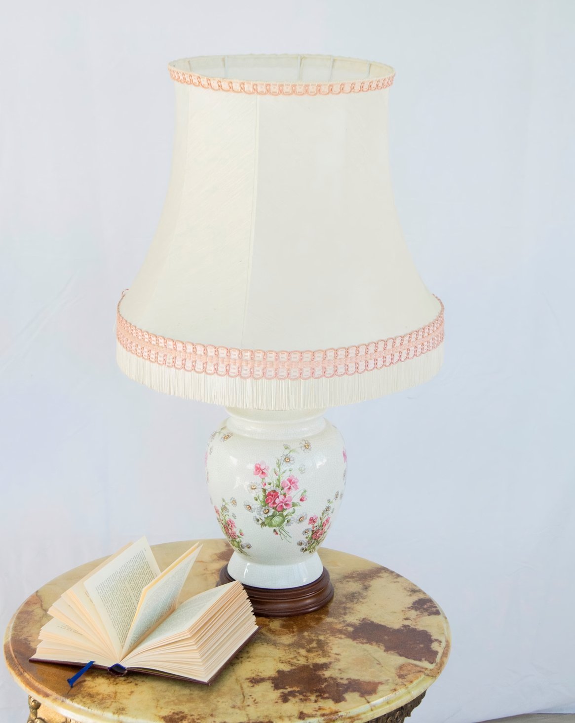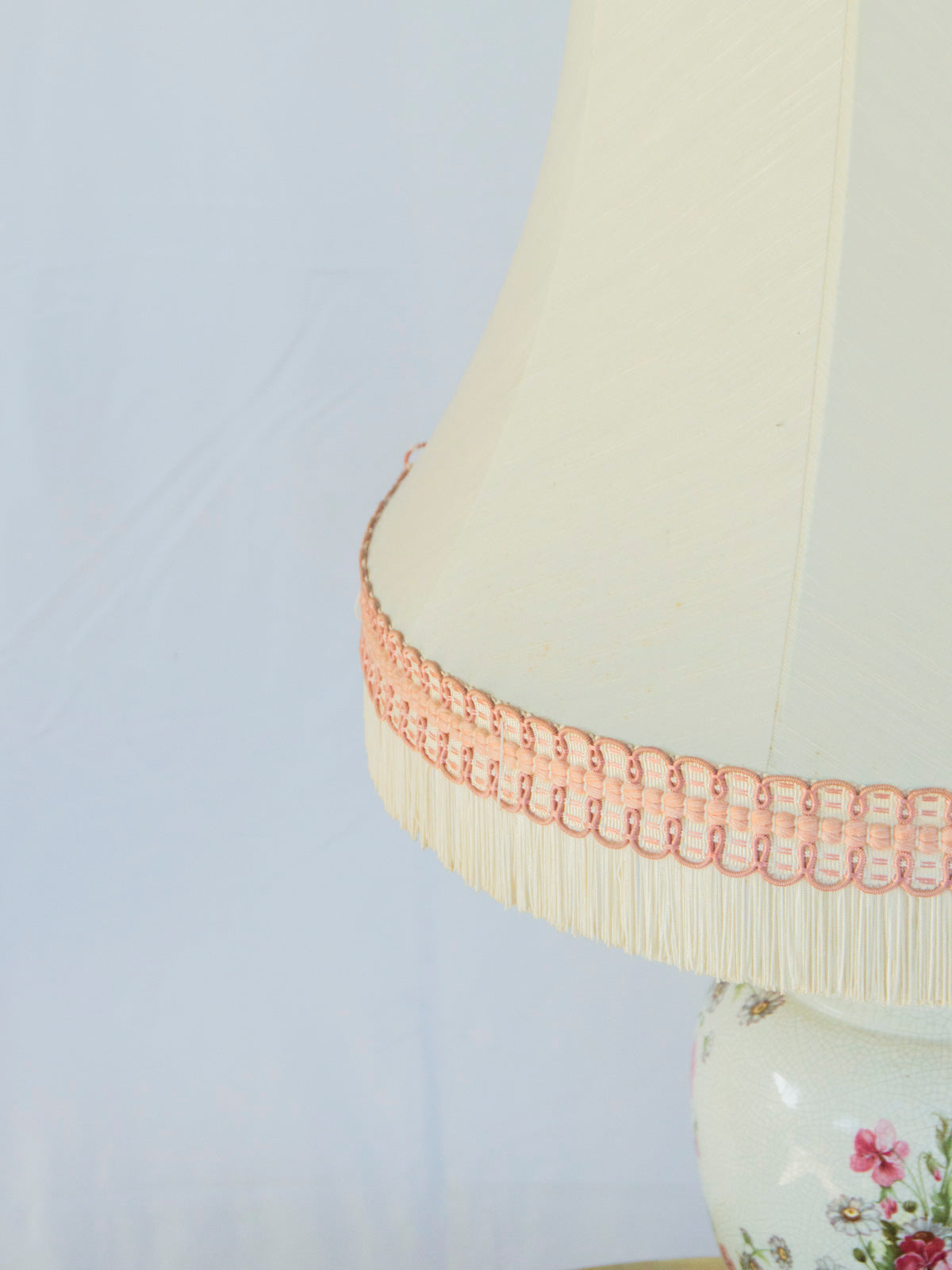 Découvrez cette lampe à poser en porcelaine ornée de délicats motifs floraux roses, posée sur un socle en bois fixe. L'abat-jour blanc en tissu à frange, rehaussé d'un liseré rose, diffuse une lumière douce idéale pour une table de chevet ou une console. Son format contenu et ses proportions harmonieuses apportent une touche vintage et poétique à un intérieur contemporain, créant une atmosphère intime et chaleureuse.