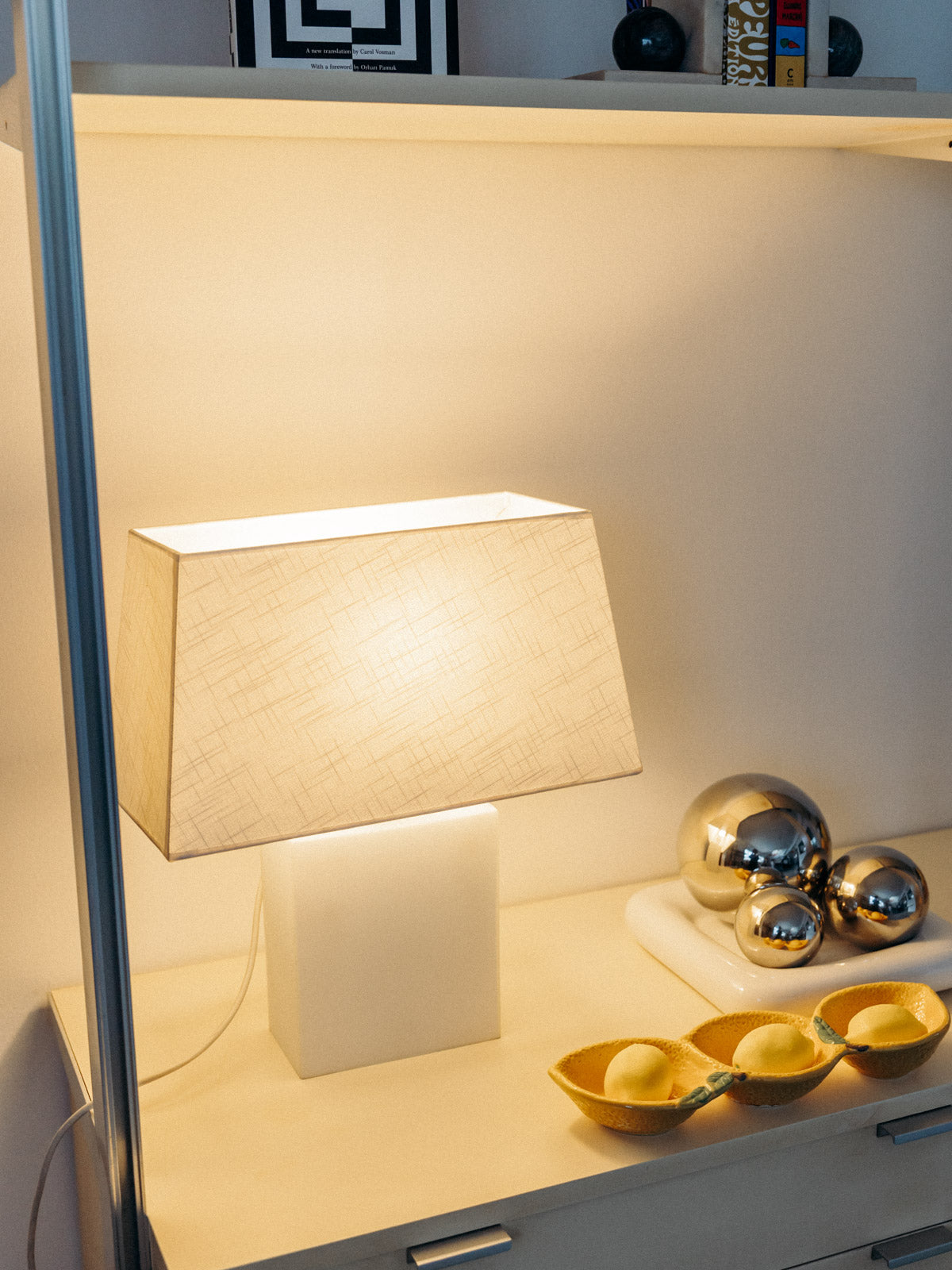 Ajoutez une note lumineuse et raffinée avec cette lampe en verre blanchi et son abat-jour rectangulaire en toile beige. Dotée de deux interrupteurs et d'une variation d'intensité, elle permet de moduler l'éclairage selon l'ambiance désirée. Le verre blanchi diffuse une lumière douce et veloutée tandis que l'abat-jour beige habille l'espace d'une élégance sobre. Son format aux proportions équilibrées la rend idéale sur une console, une table de chevet ou un bureau, apportant une atmosphère chaleureuse et contemporaine.