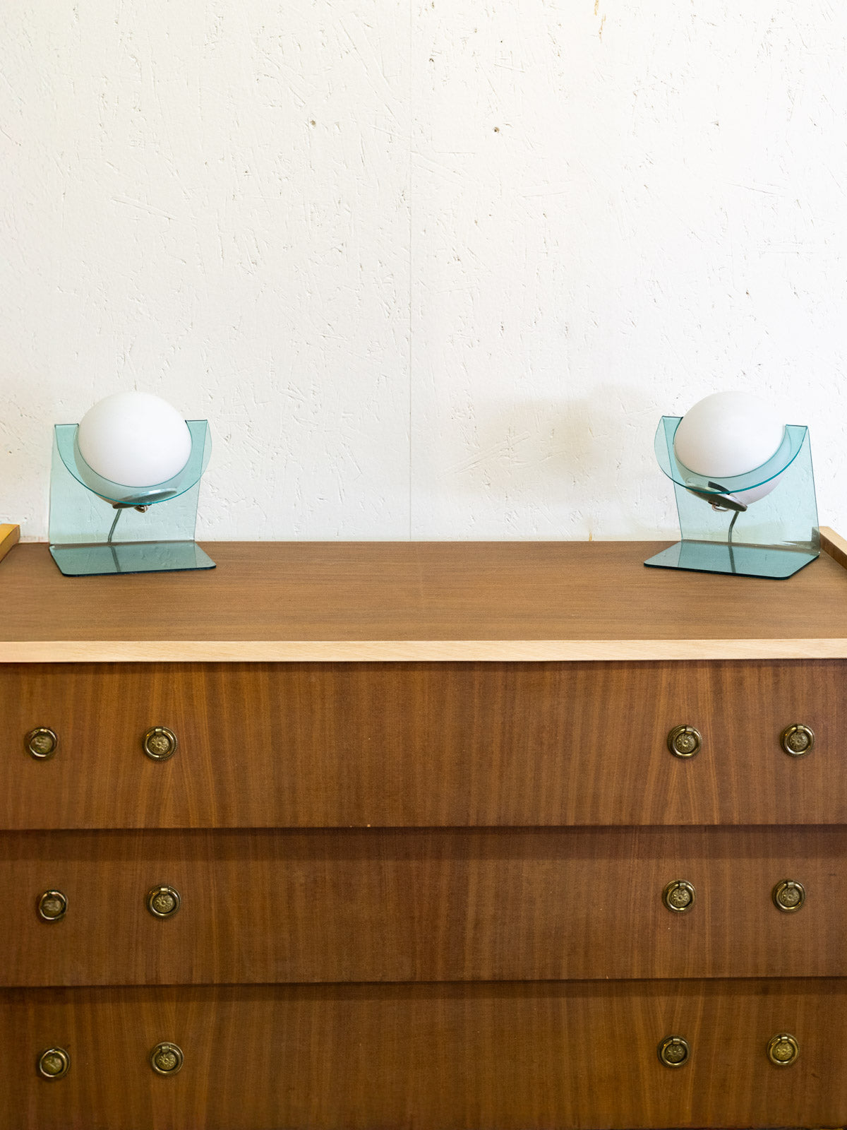 Découvrez cette paire de lampes à poser au globe rond et au verre bleu qui diffuse une lumière douce et tamisée. Leur format et leur interrupteur intégré les rendent faciles à installer sur une table de chevet, une console ou un bureau, apportant une touche vintage et délicate à l'intérieur. Les matériaux en verre, colorés, soulignent une élégance discrète et créent une atmosphère intimiste. Quelques traces du temps présentes qui font son authenticité.
