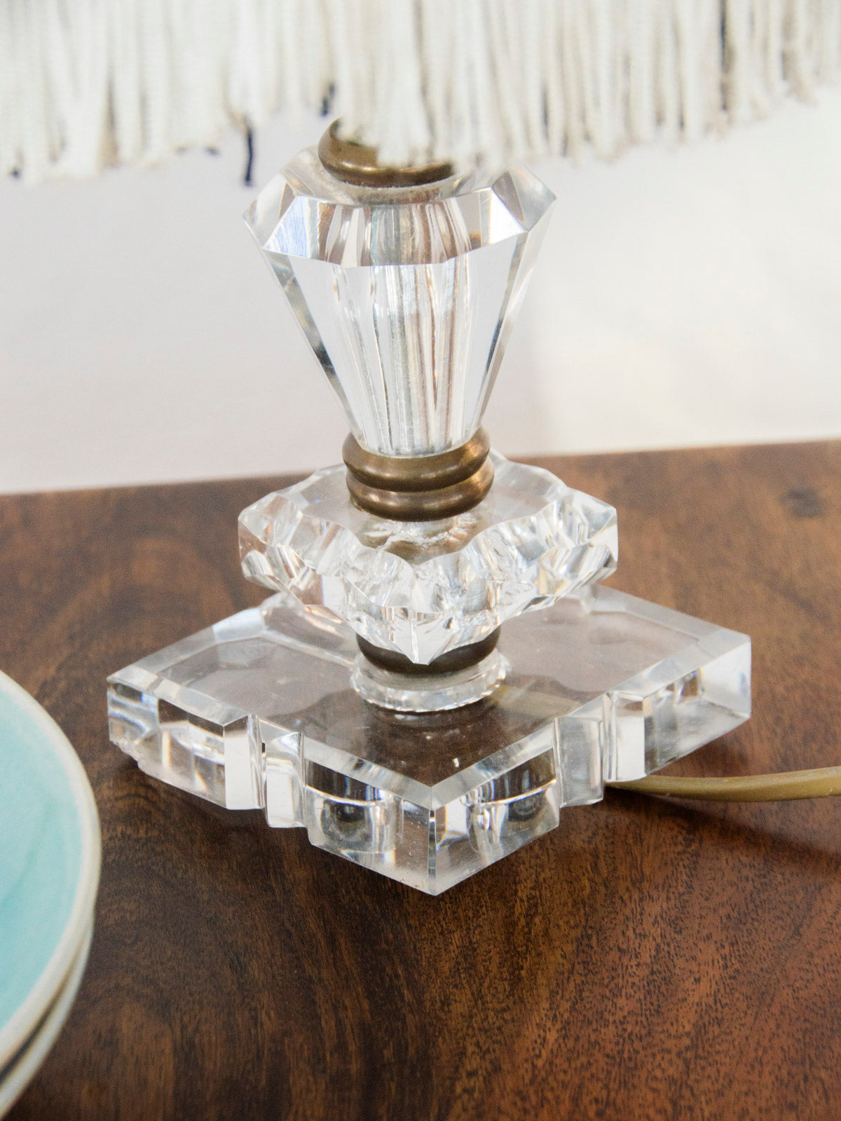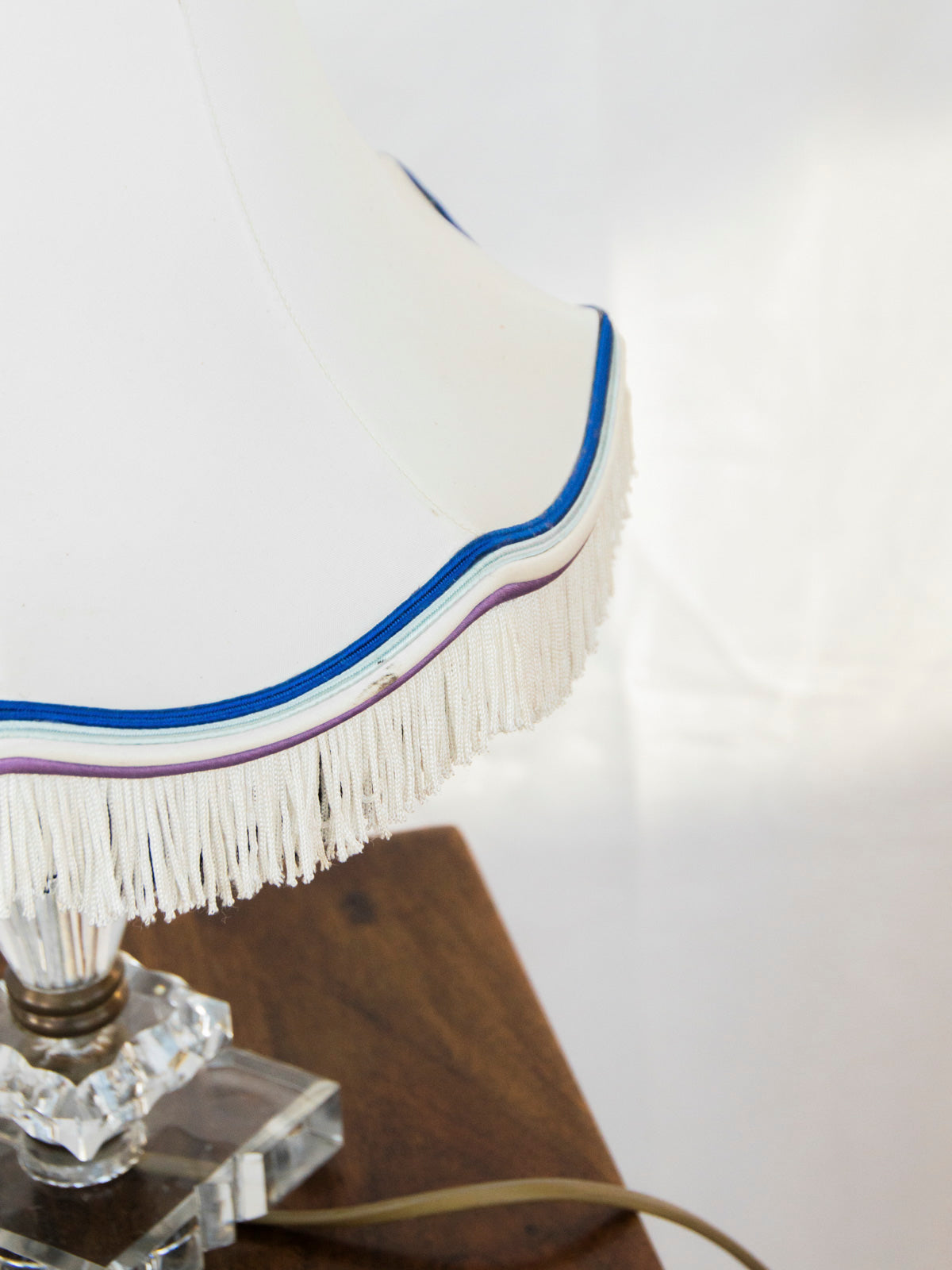 Sublimez votre intérieur avec cette lampe à poser au pied en verre transparent, associant métal sobre et abat-jour en tissu blanc à franges rehaussé d'un liseré bleu et violet. Son piètement translucide apporte une élégance légère tandis que l'abat-jour diffuse une lumière douce, idéale pour un salon cosy ou un coin lecture, mêlant charme rétro et raffinement discret. Quelques touches de métal structurent l'ensemble sans alourdir l'effet. Petit éclat discret dans le verre.