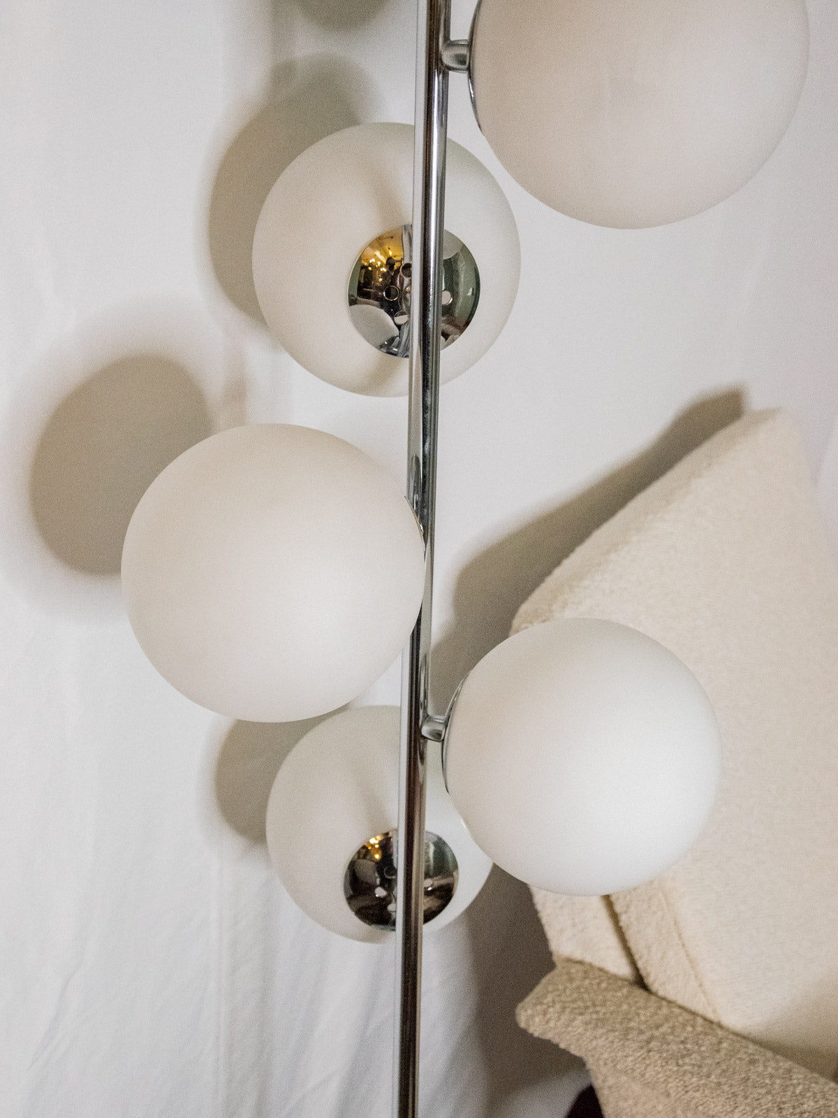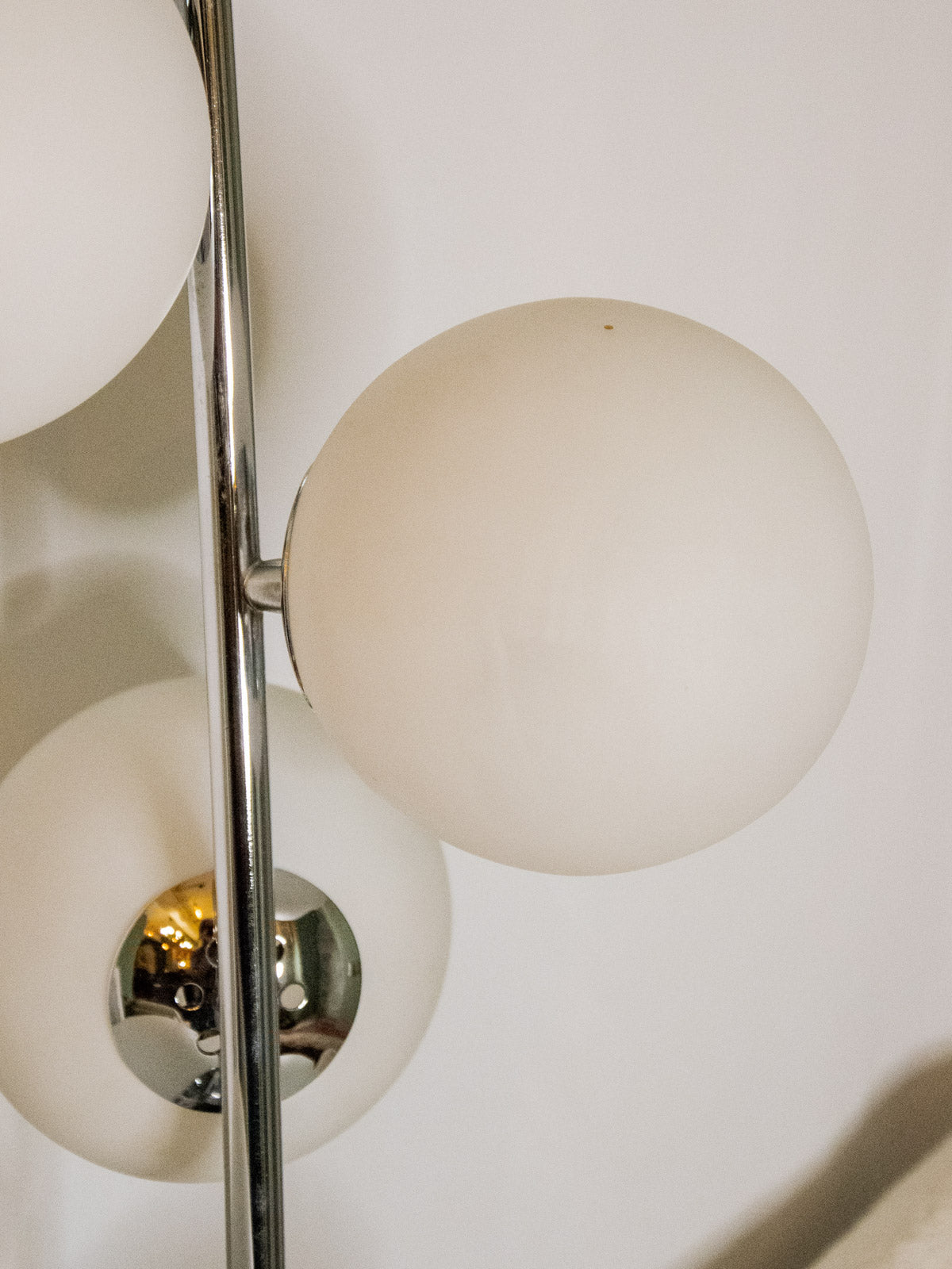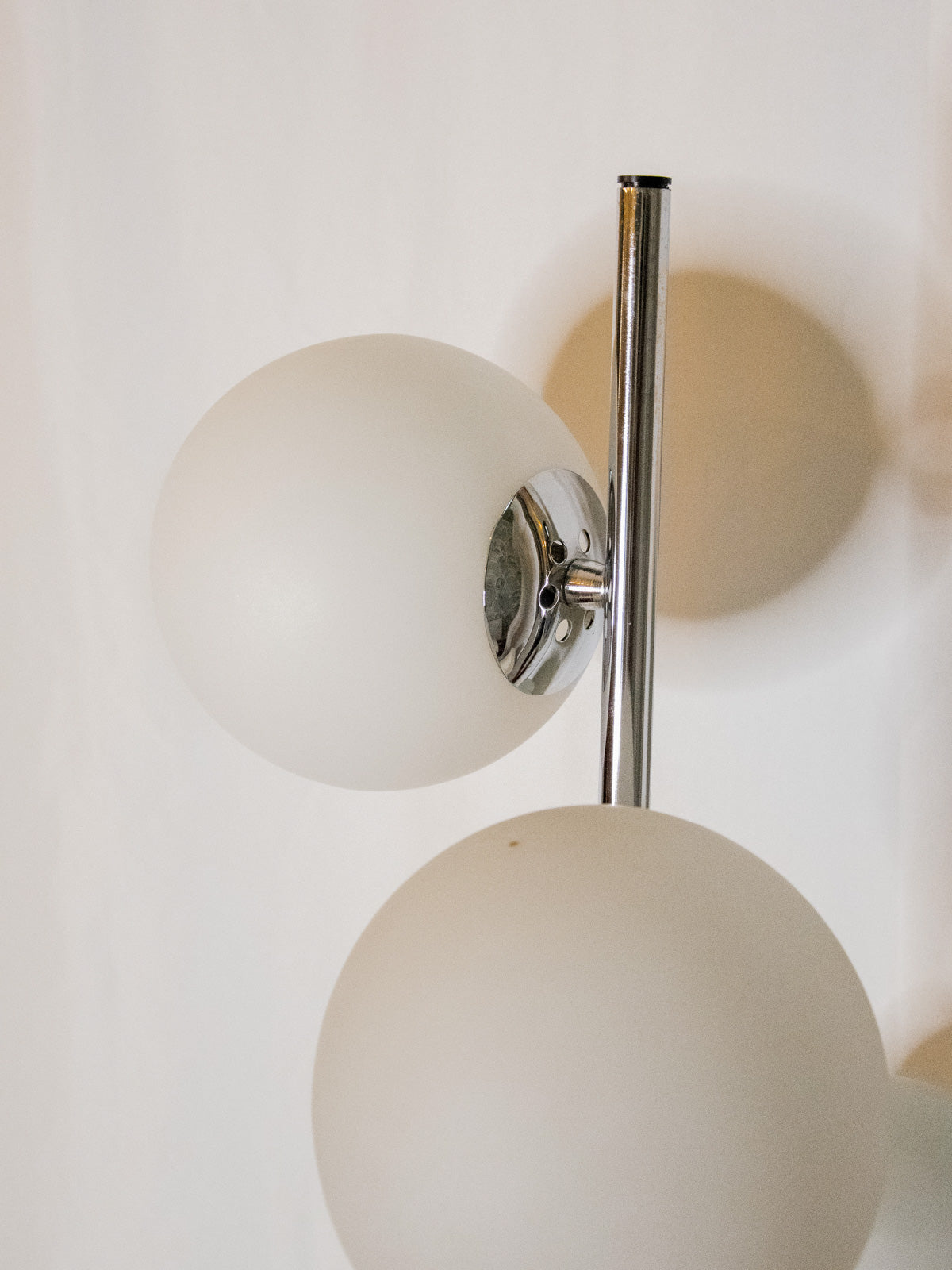 Découvrez ce lampadaire vintage des années 60-70, articulé autour d'un montant en chrome et orné de six globes en opaline qui diffusent une lumière douce et enveloppante. Son interrupteur à bouton-poussoir et son design graphique en font une pièce fonctionnelle et décorative idéale pour un salon, un coin lecture ou une entrée attentive aux détails. Lignes rétro et matériaux nobles évoquent une atmosphère élégante et chaleureuse, parfaite pour sublimer un intérieur contemporain ou rétro. Micro-rayures d'usage presque invisibles.