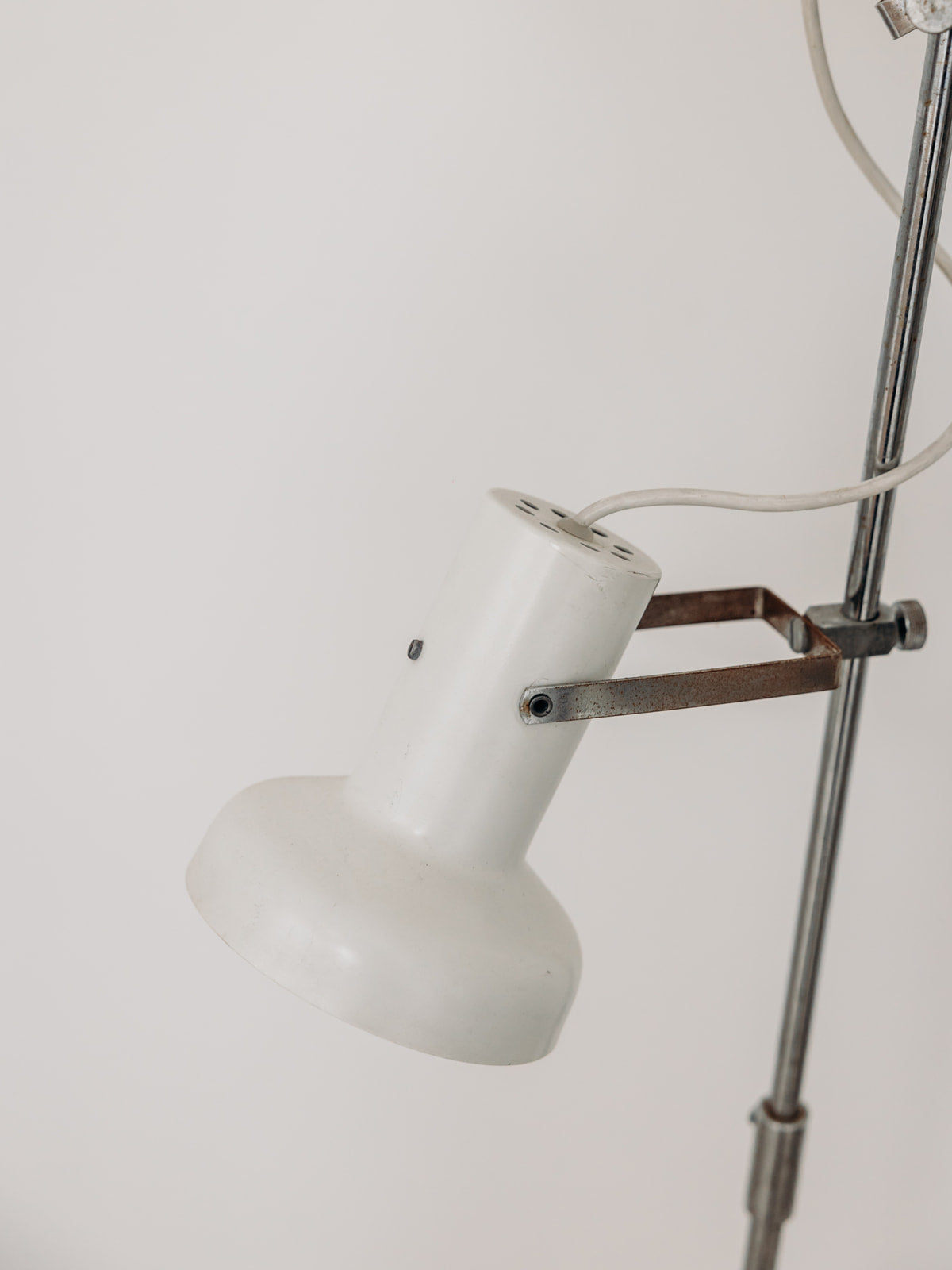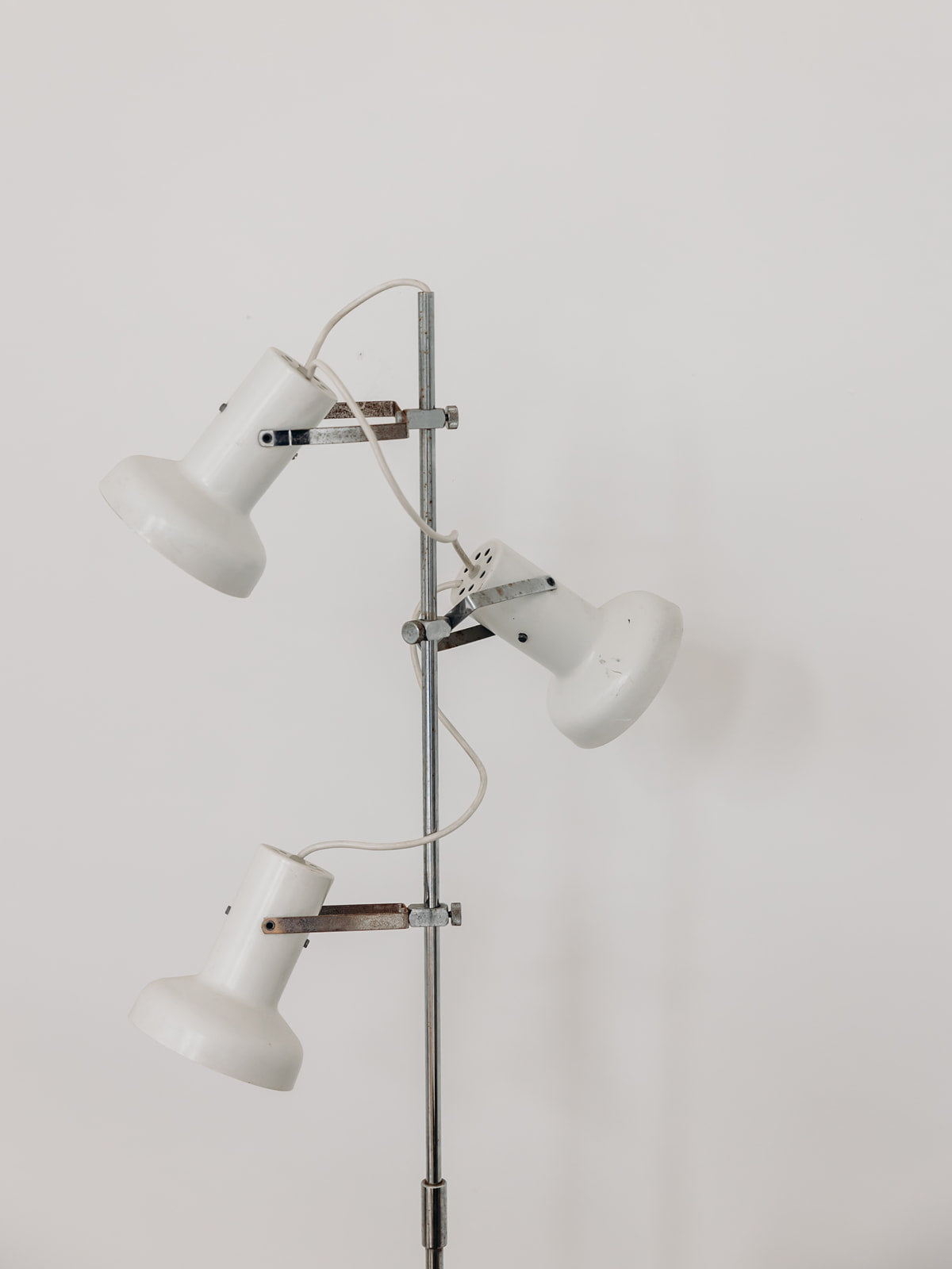 Julien, c'est notre nouveau lampadaire seventies ! Ce lampadaire de style industriel en métal blanc et métal chromé est composé de trois projecteurs orientables. Il comporte de légers éclats témoignant de son ancienne vie. Julien prend place dans le salon ou dans la chambre et illumine l'espace avec style.
