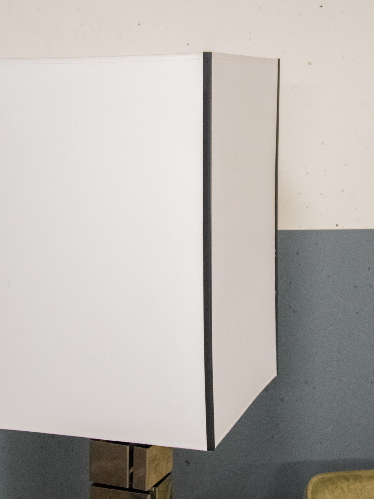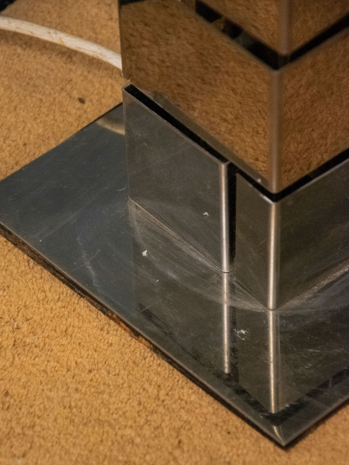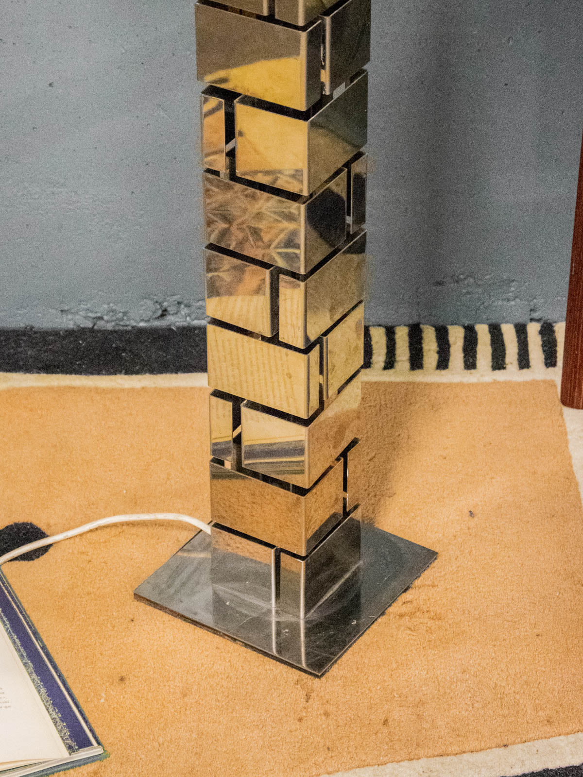 Découvrez le lampadaire "Building" en métal chromé, attribué au duo d'artistes Curtis Freiler & Jerry Fels (Curtis Jere), incarnation du design américain des années 70. Sa silhouette élancée et son piètement rappelant la forme de briques occupent une place élégante dans un salon ou un coin lecture, tandis que l'abat-jour, refait à neuf dans l'esprit de l'original, diffuse une lumière chaleureuse et maîtrisée. L'esthétique vintage alliée au métal poli crée une ambiance raffinée et sculpturale.