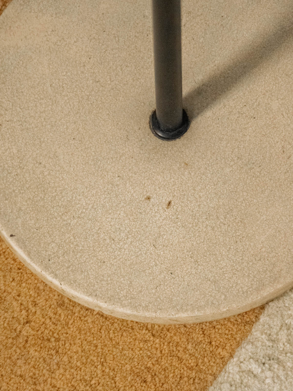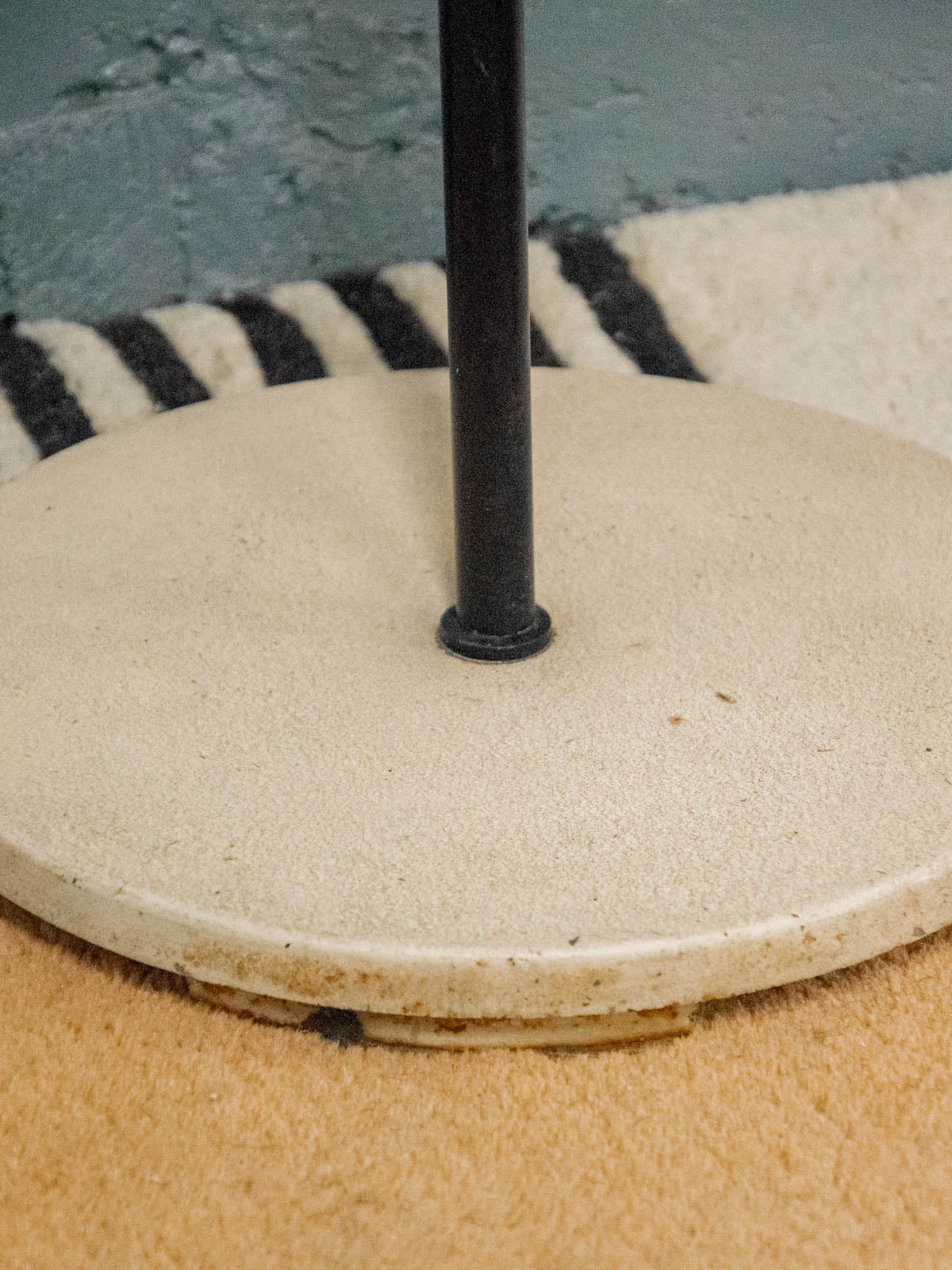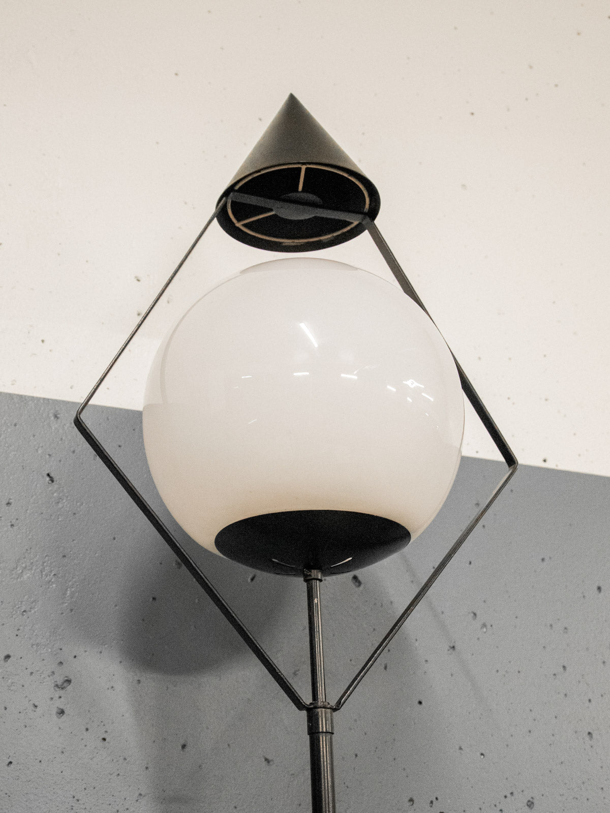 Sublimez votre intérieur avec ce lampadaire italien des années 1980 en métal laqué noir et globe opaline, au design graphique et architectural. Le socle circulaire blanc et le pied tubulaire soutiennent un réflecteur conique qui met en valeur un globe opalin enchâssé dans un triangle noir, créant un jeu de contrastes élégant. Ses lignes élancées et la lueur du globe diffusent une lumière douce idéale pour un salon, un coin lecture ou une entrée, apportant une atmosphère feutrée et contemporaine. Très bon état général.