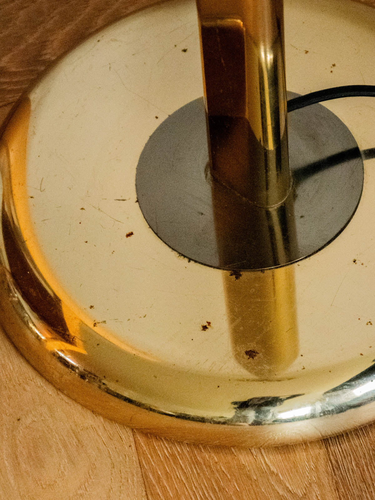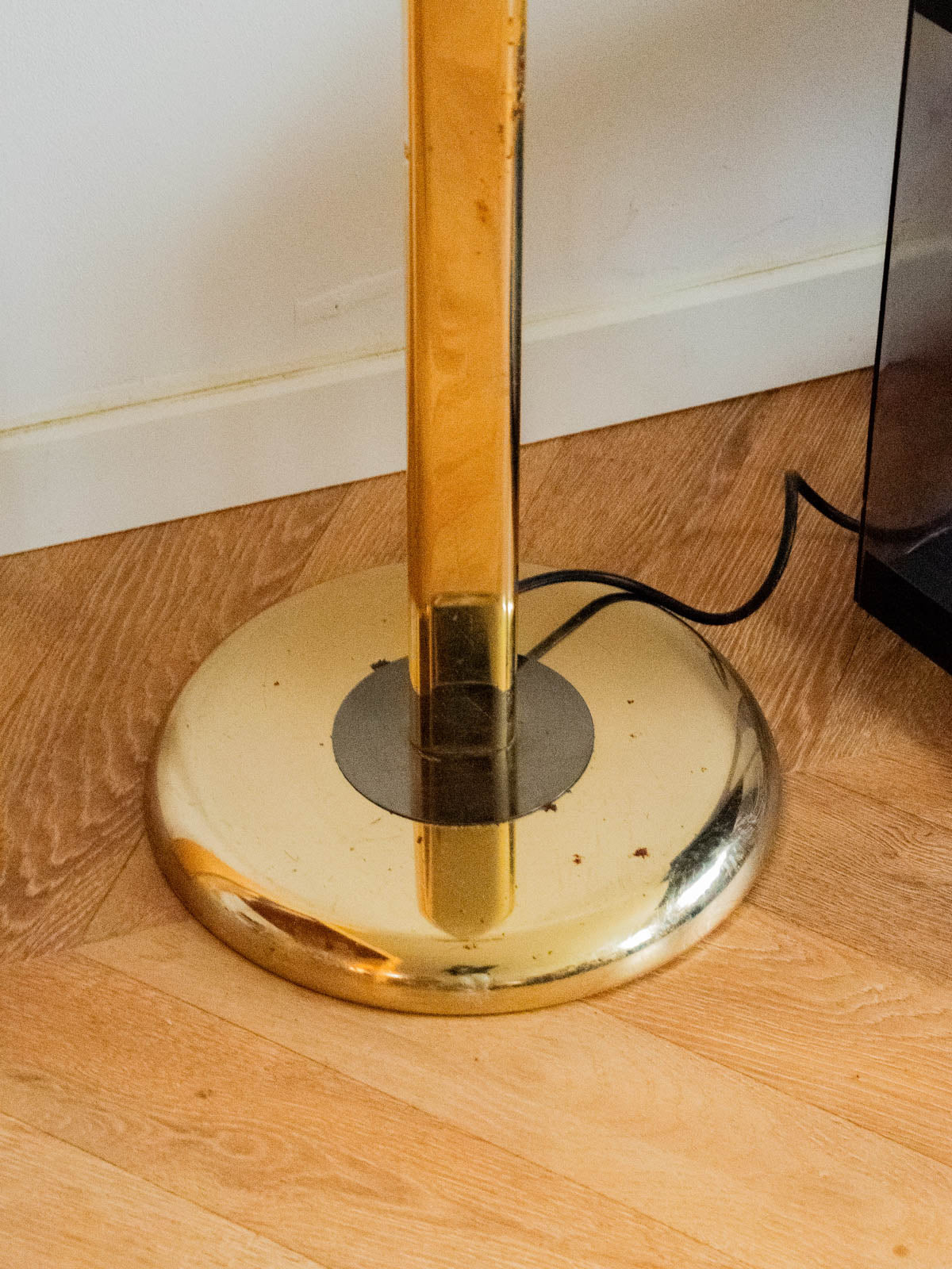 Sublimez votre intérieur avec ce lampadaire en métal doré à la stature élancée, qui apporte une note chaleureuse et raffinée à un salon ou un coin lecture. Sa hauteur généreuse diffuse une lumière enveloppante grâce à une ampoule halogène, tandis que la tête inclinable permet d'orienter l'éclairage selon vos besoins. Le piètement discret et le profil étroit facilitent l'installation près d'un fauteuil sans encombrer l'espace. Une présence lumineuse, sobre et invitante. Légères usures.