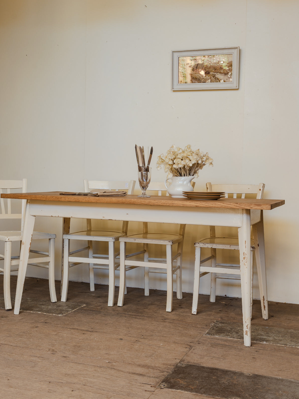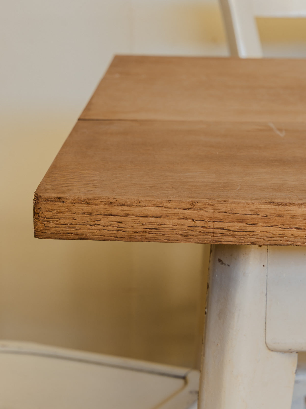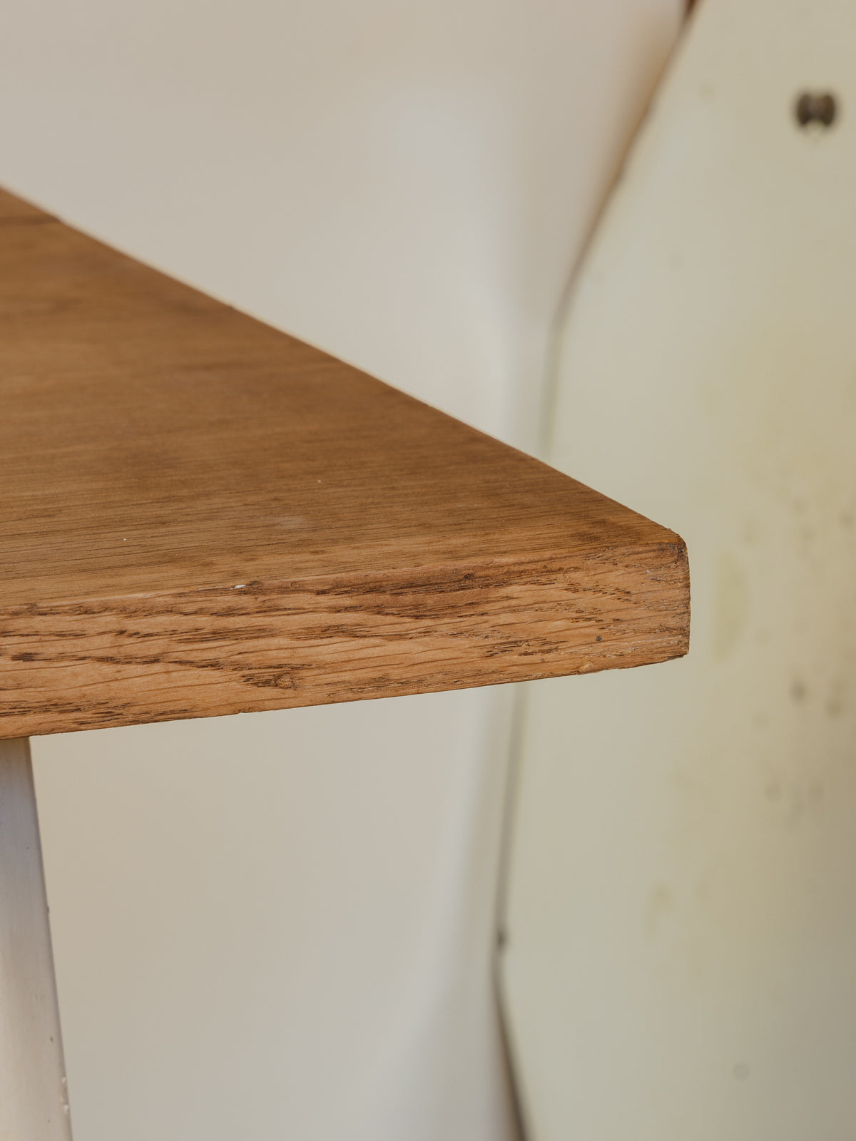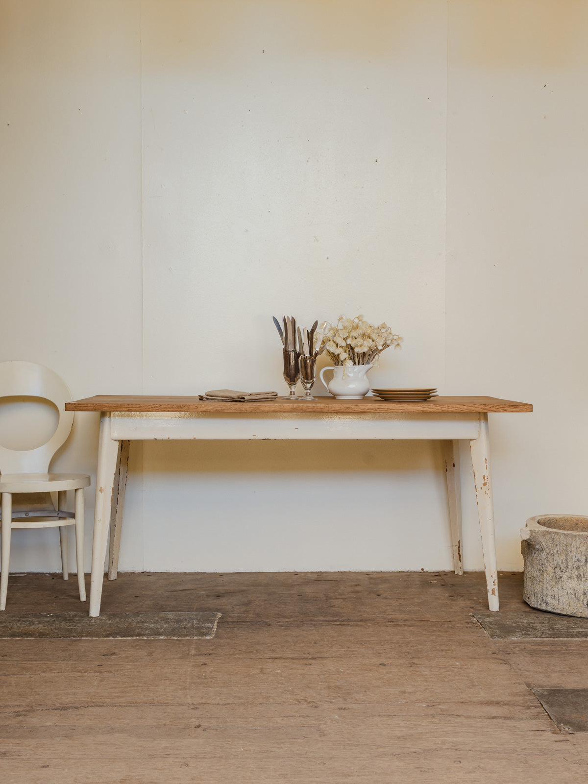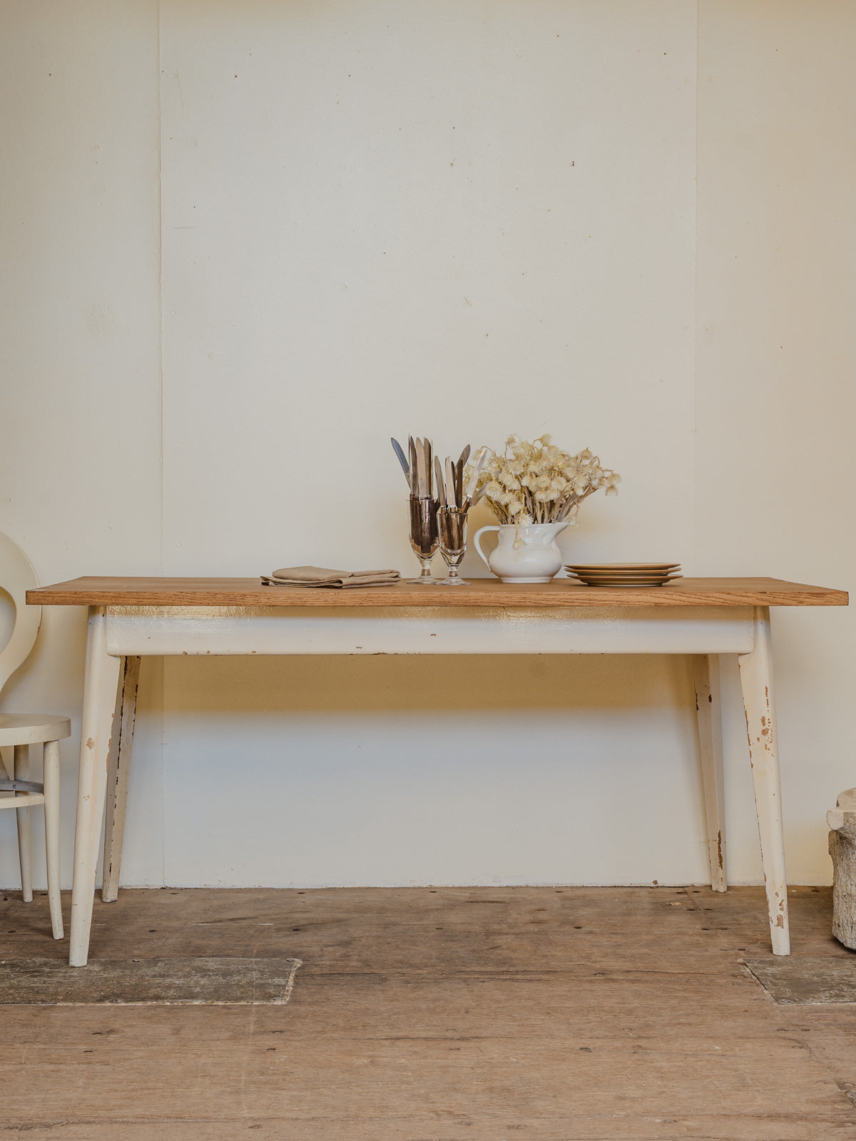 Adoptez cette table ancienne des années 70 en chêne, coiffée de pieds compas qui évoquent un design rétro sobre et élégant. Son plateau brut, fixé, peut être verni pour une finition lisse ou laissé naturel pour révéler la richesse du bois, tandis que la structure patinée raconte son histoire. Ses proportions équilibrées offrent un plan généreux, parfait pour dîners conviviaux ou comme bureau chaleureux, apportant une ambiance intemporelle et raffinée à votre intérieur. Capacité de 8 convives.