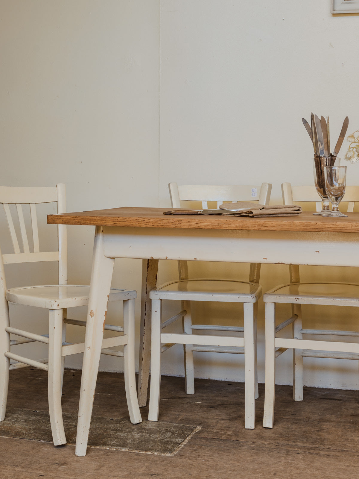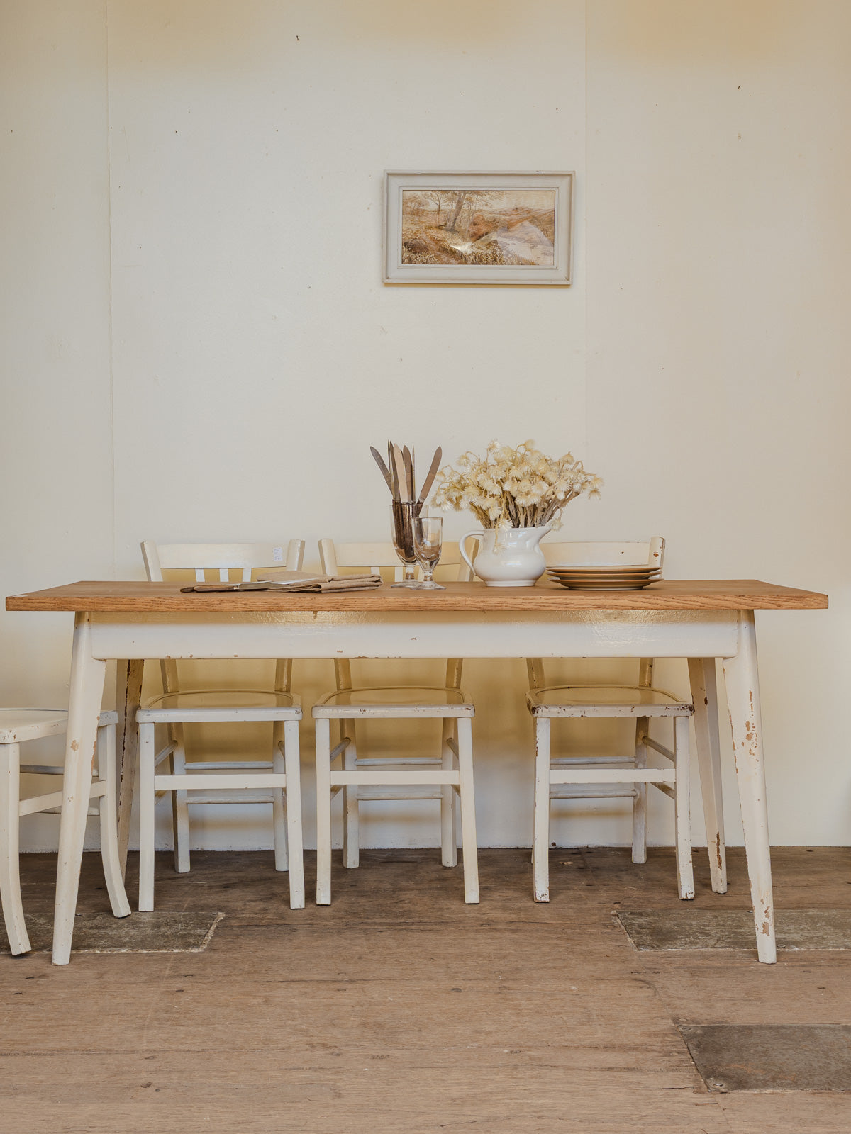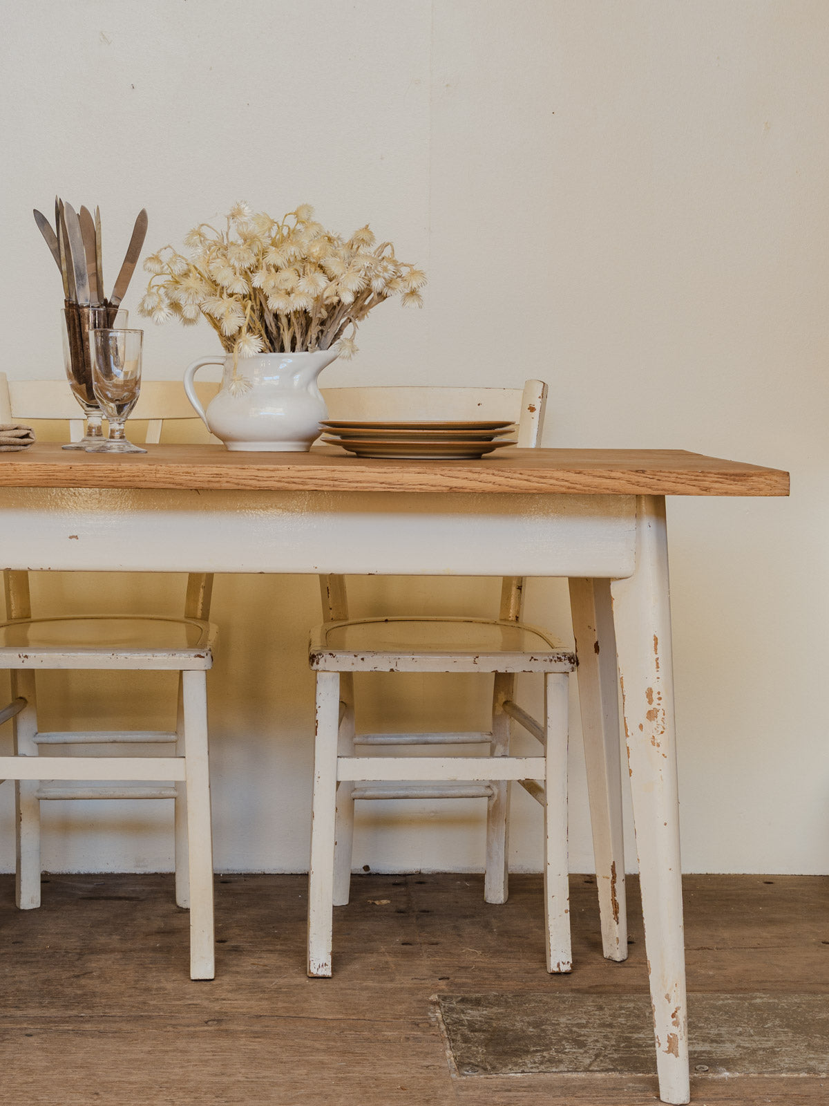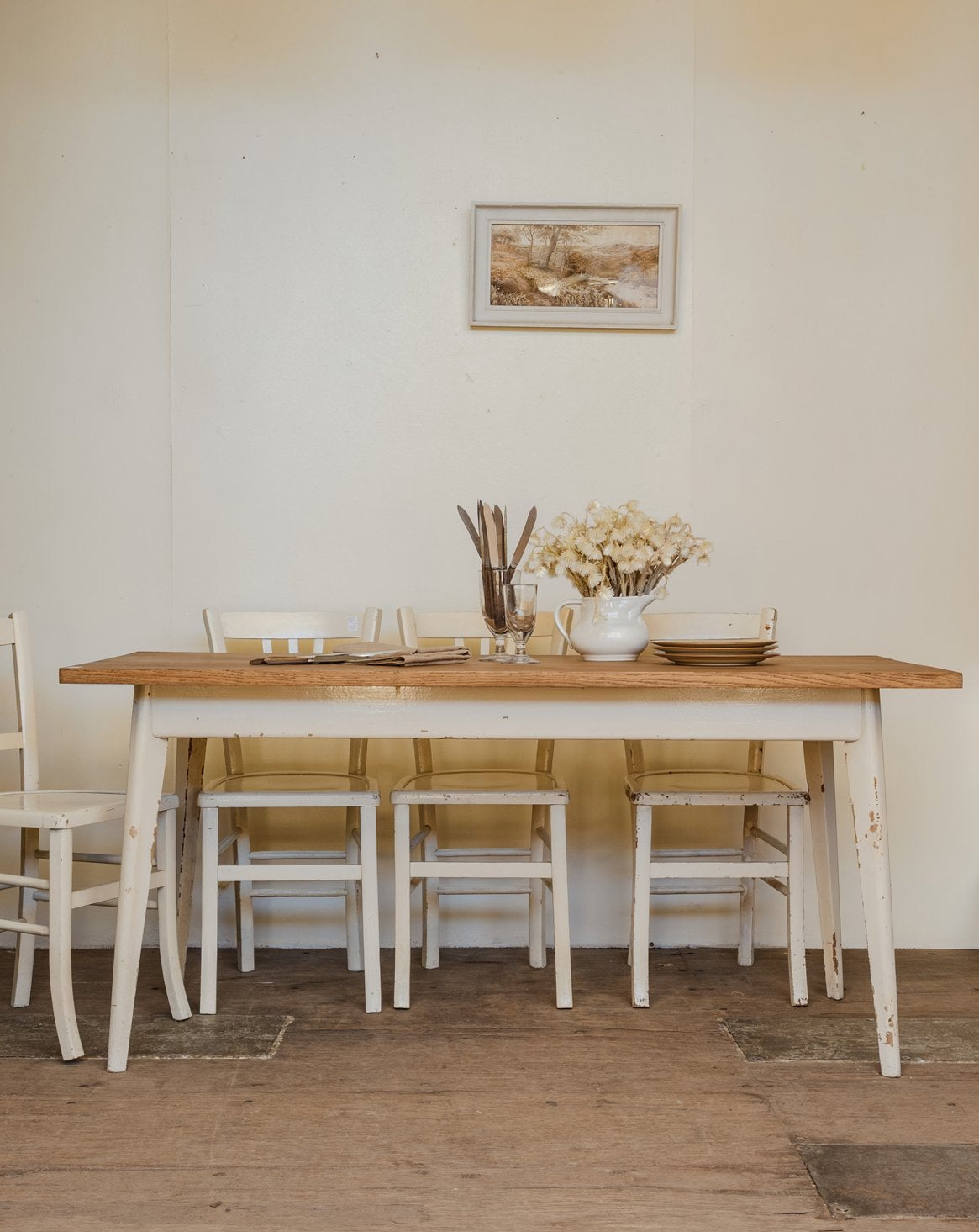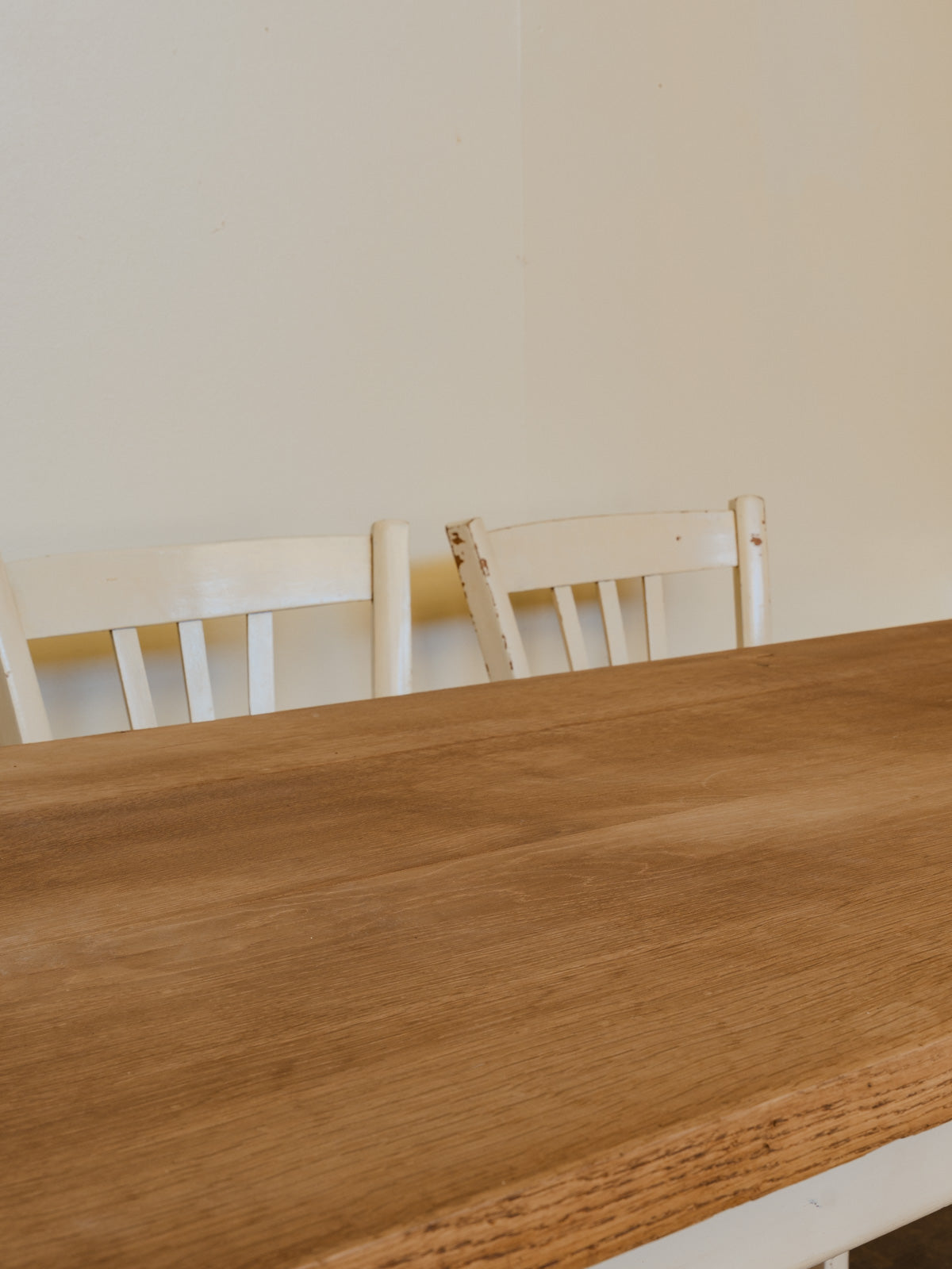 Adoptez cette table ancienne des années 70 en chêne, coiffée de pieds compas qui évoquent un design rétro sobre et élégant. Son plateau brut, fixé, peut être verni pour une finition lisse ou laissé naturel pour révéler la richesse du bois, tandis que la structure patinée raconte son histoire. Ses proportions équilibrées offrent un plan généreux, parfait pour dîners conviviaux ou comme bureau chaleureux, apportant une ambiance intemporelle et raffinée à votre intérieur. Capacité de 8 convives.