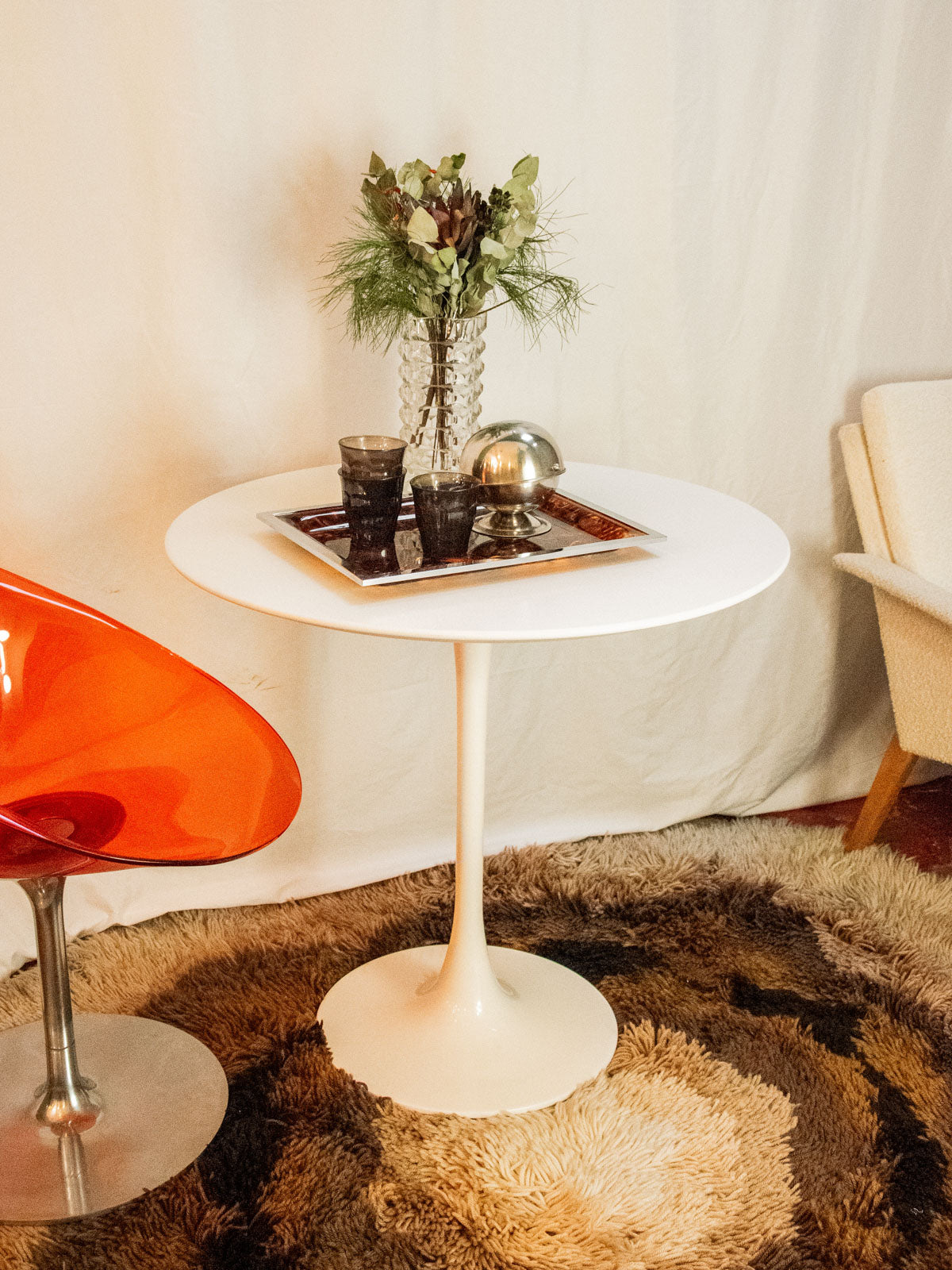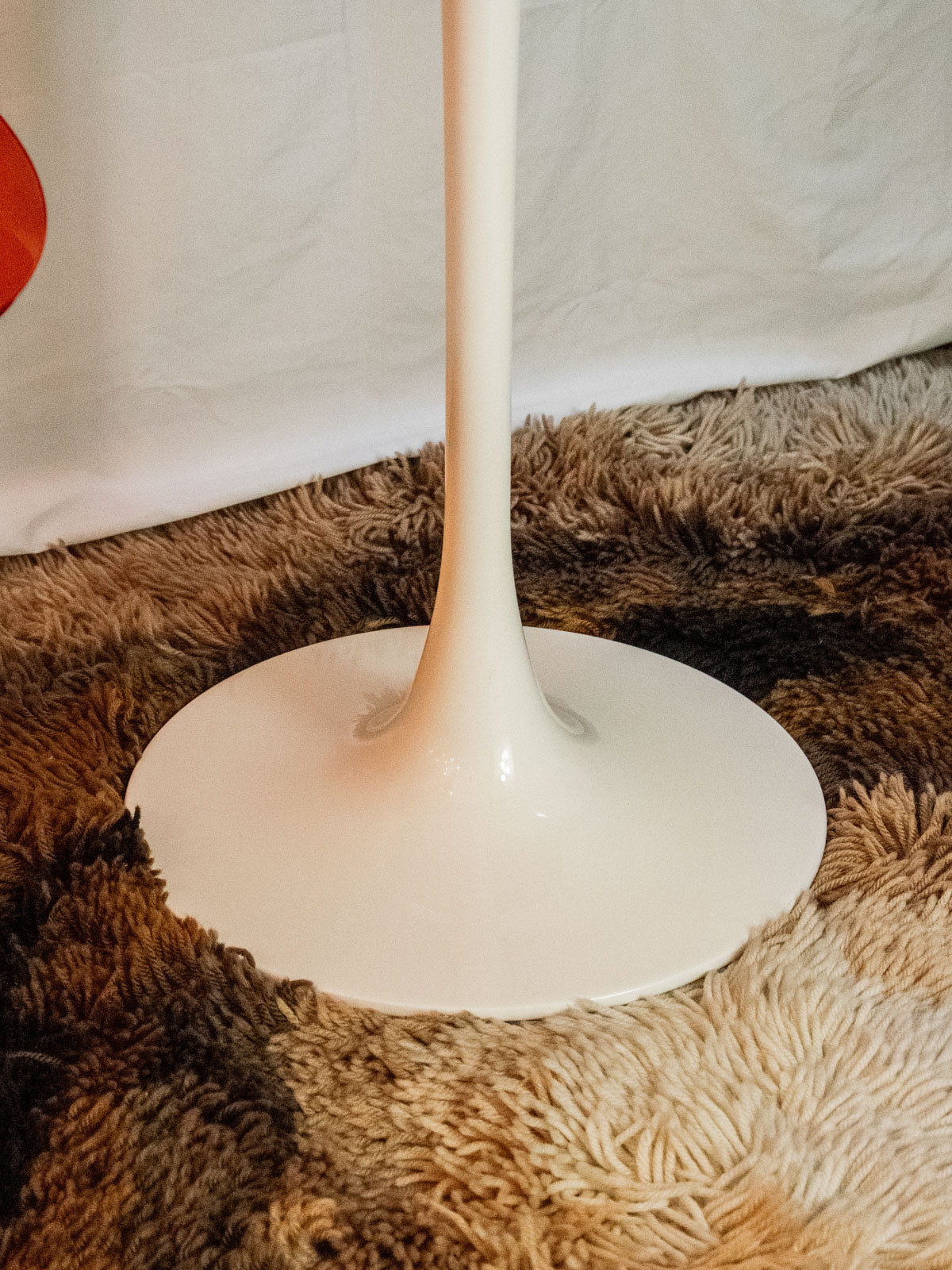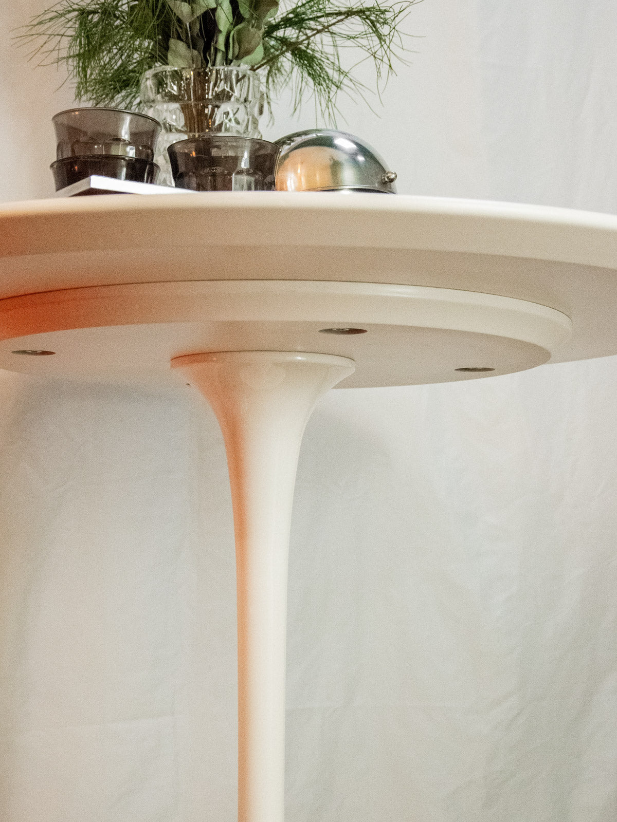 Adoptez cette table tulipe au plateau rond blanc, inspirée du style Knoll, qui marie l'esthétique des années 50 à une ligne contemporaine. Son plateau mat et son piètement central élancé en métal laqué offrent une silhouette légère qui libère l'espace et facilite le placement des sièges. Compacte mais généreuse en proportions, elle accueille confortablement deux à quatre convives et convient autant à un coin repas qu'à un bureau minimaliste, apportant une atmosphère lumineuse et raffinée. Légères traces du temps discrètes.