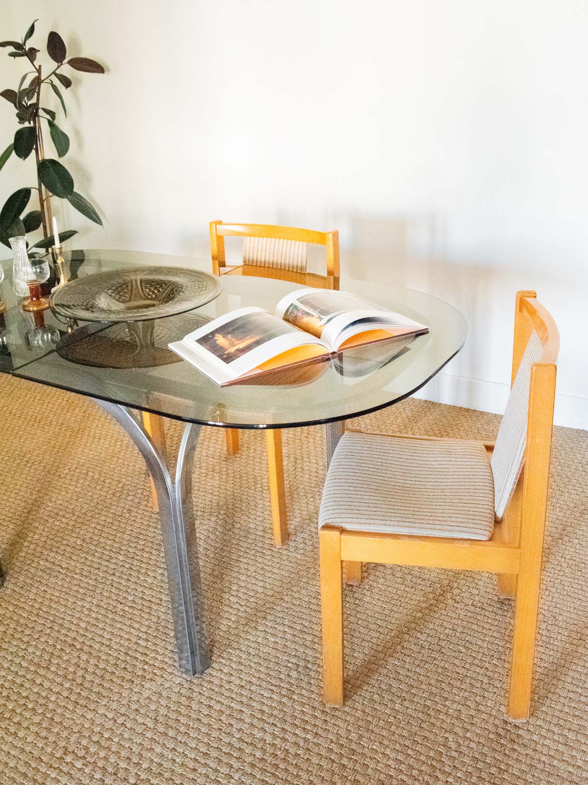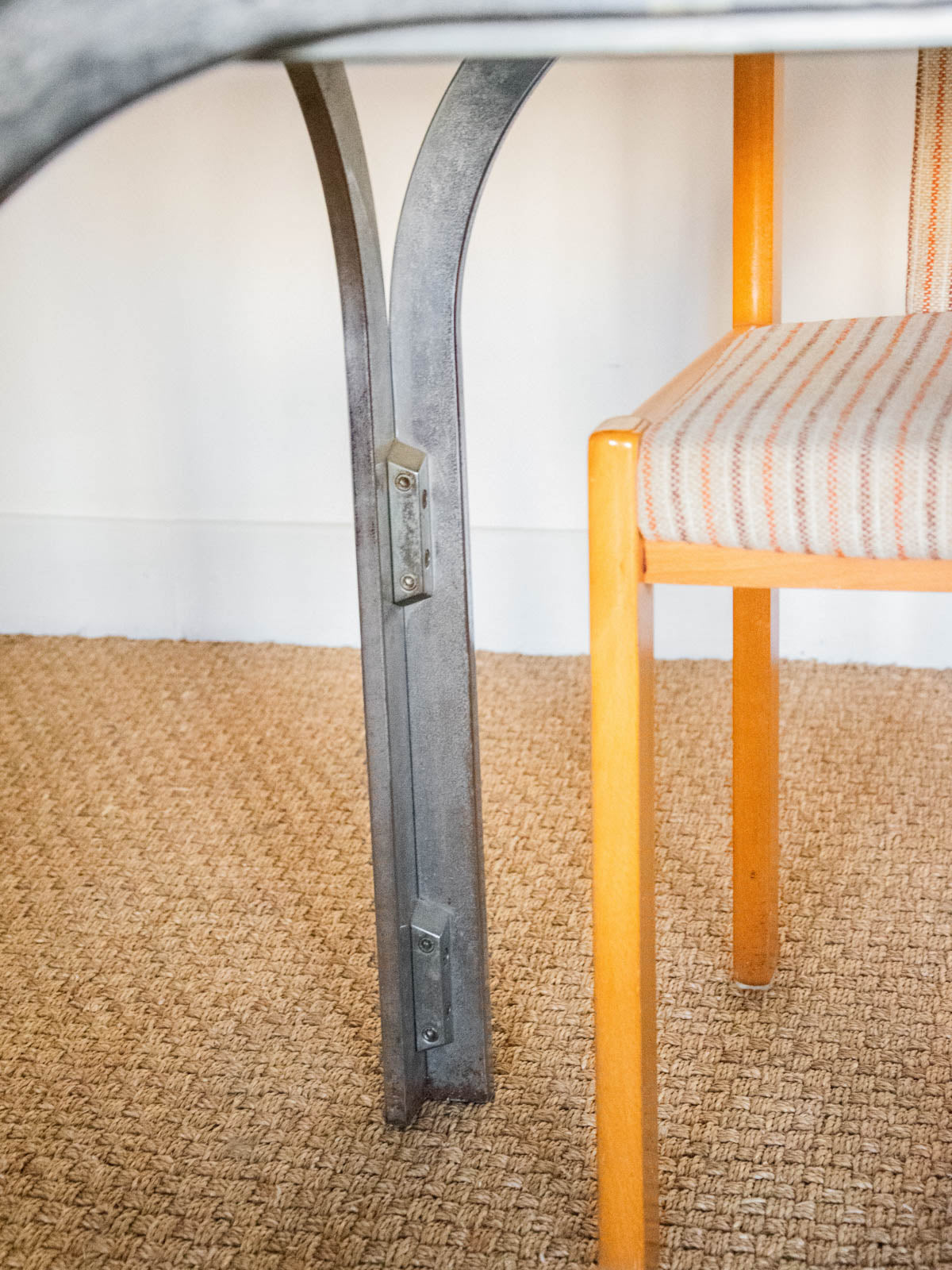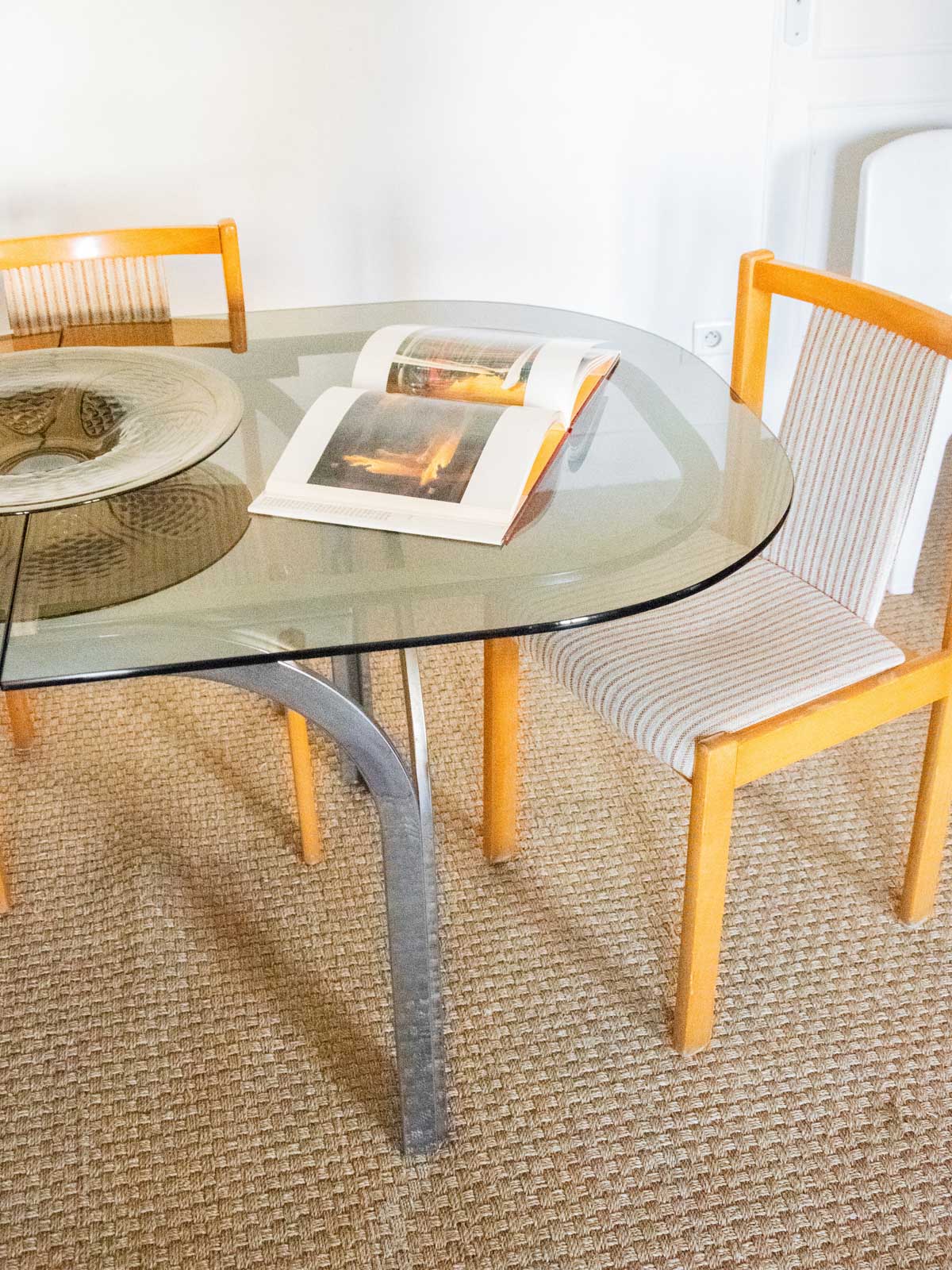 Adoptez cette table en métal chromé au plateau en verre fumé, dont l'allure contemporaine apporte une note élégante et graphique à la salle à manger ou au salon; ses proportions généreuses offrent une belle capacité d'accueil pour 4 à 6 convives et elle peut se compléter d'une rallonge pour agrandir l'espace lors des réceptions. La structure demande une réparation lorsque la rallonge est positionnée sur les pieds. Quelques marques d'usage qui font son authenticité.
